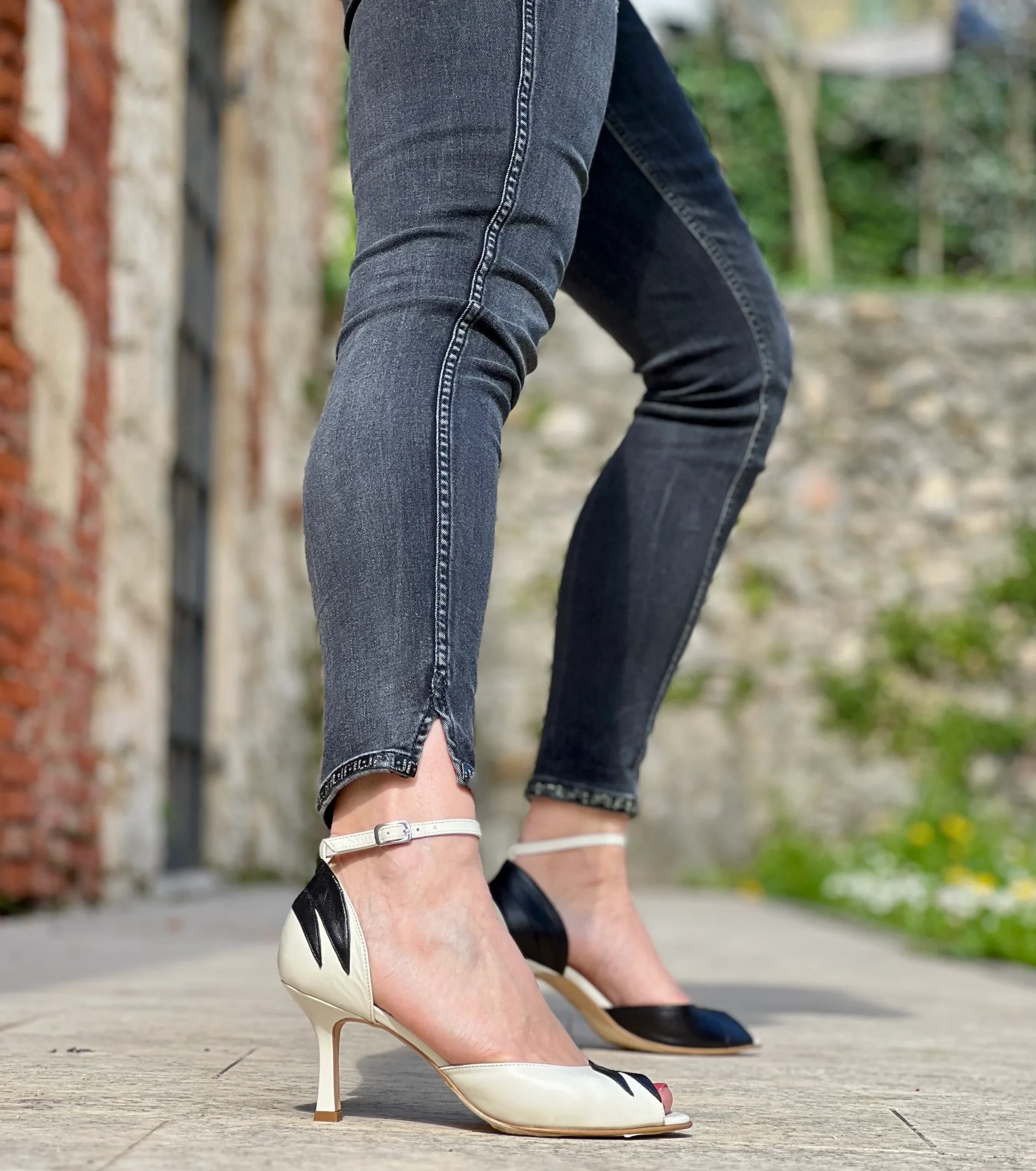 Anna Bw sandalo opentoe in nappa nera e bianca tacco 8 lavorazione artigianale marchigiana