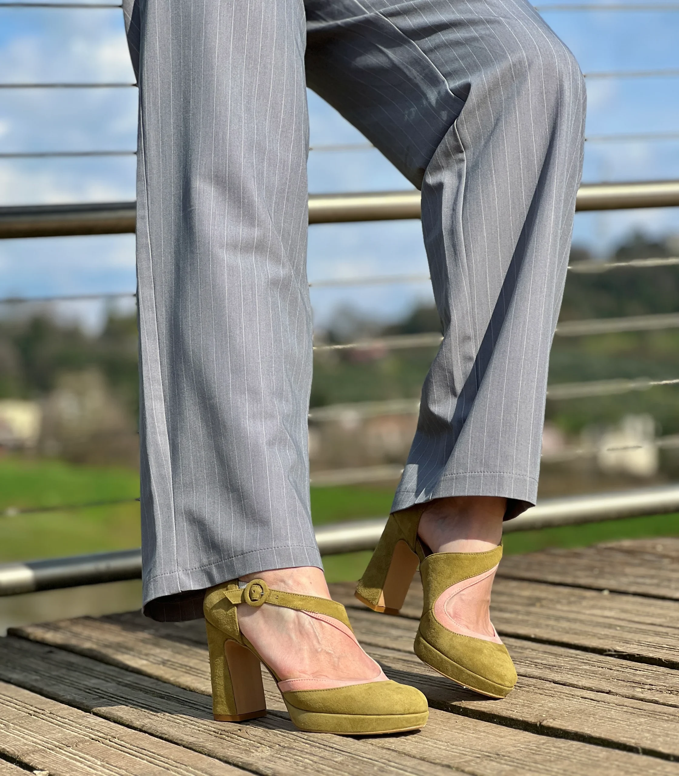 Sake Green decollete in camoscio verde e rosa plateau cm 9 artigianale pugliese