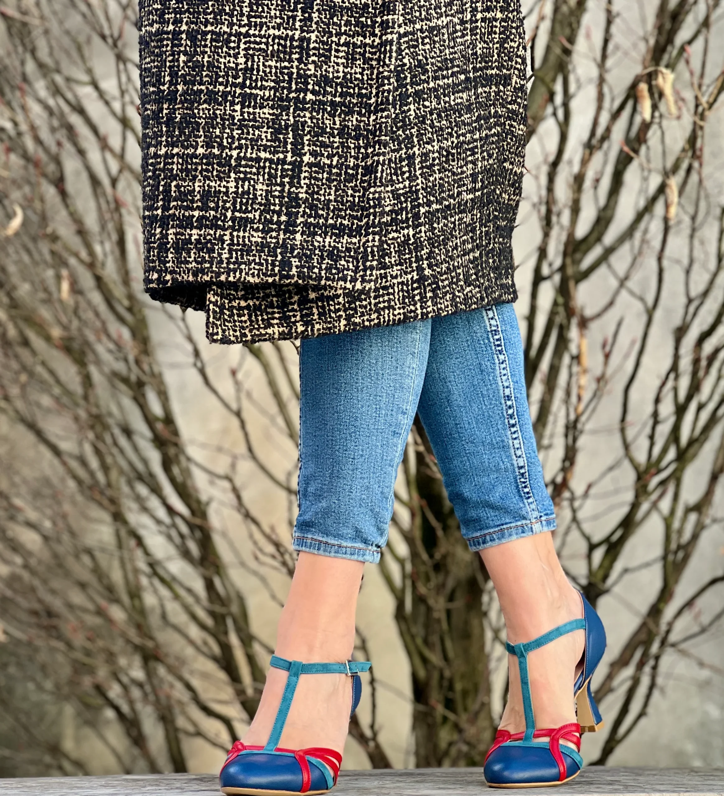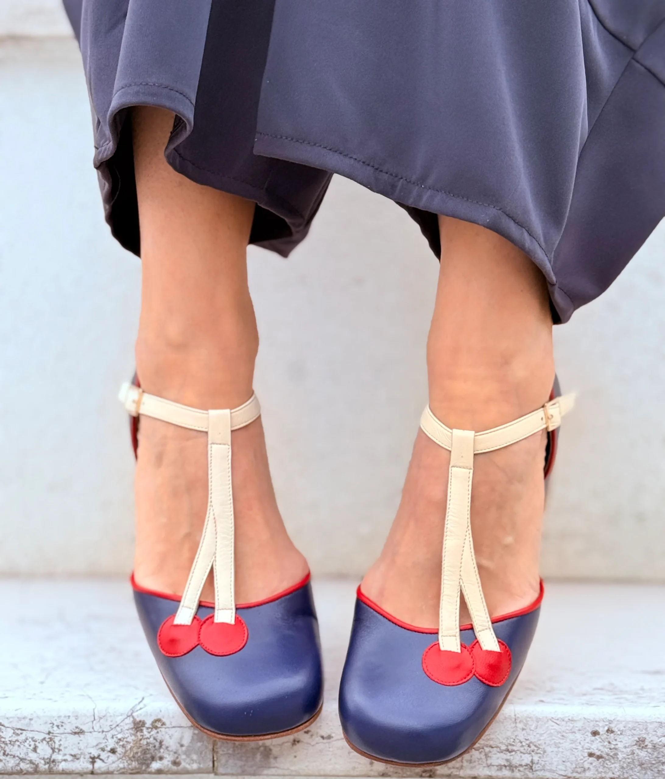Alika Blue decollete t-bar in pelle blu con cinturino stile vintage tacco 7 cm artigianale marchigiana