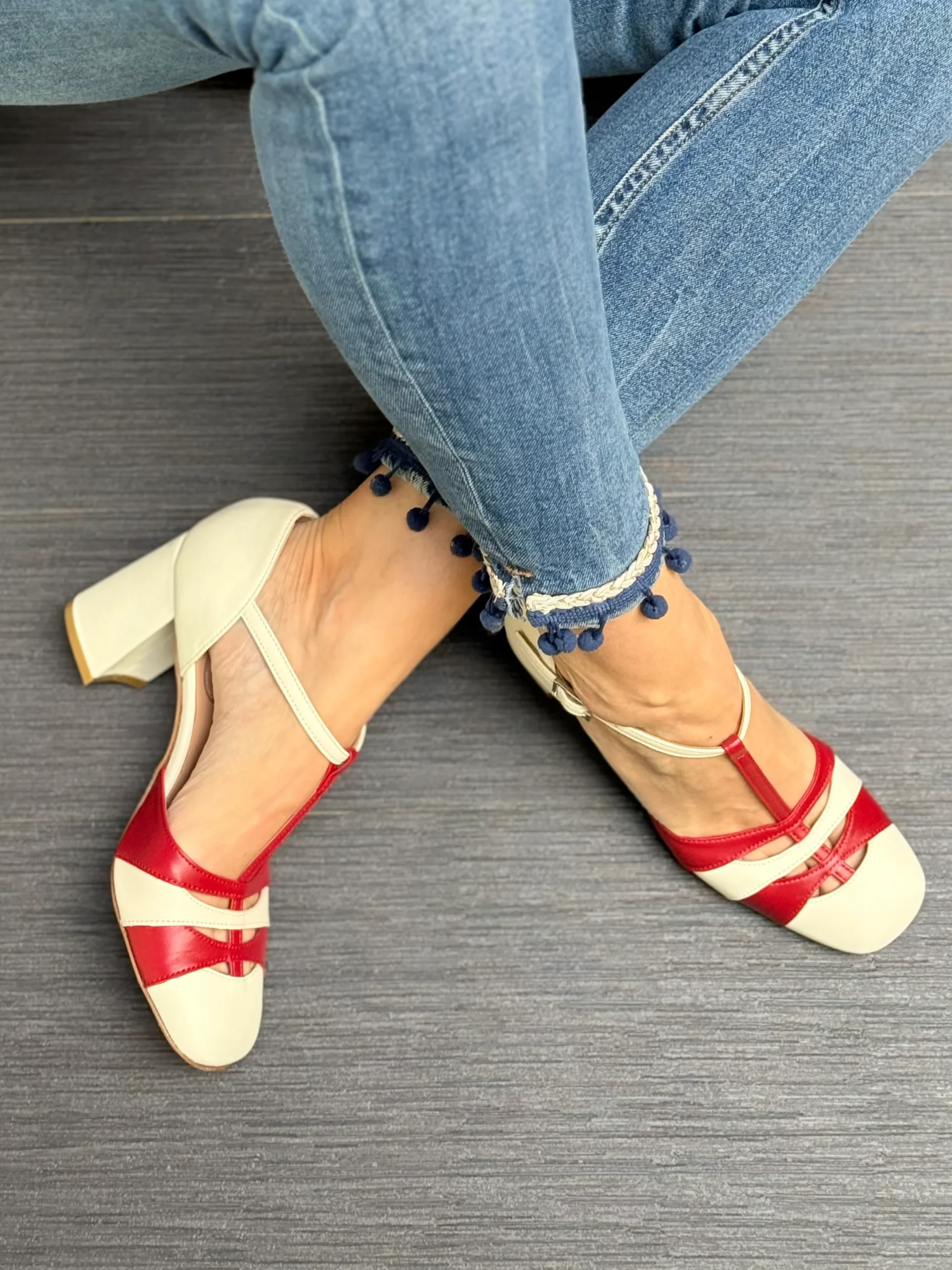 Pittima Cream decollete t-bar in nappa bianca e rossa tacco 8 artigianale marchigiana