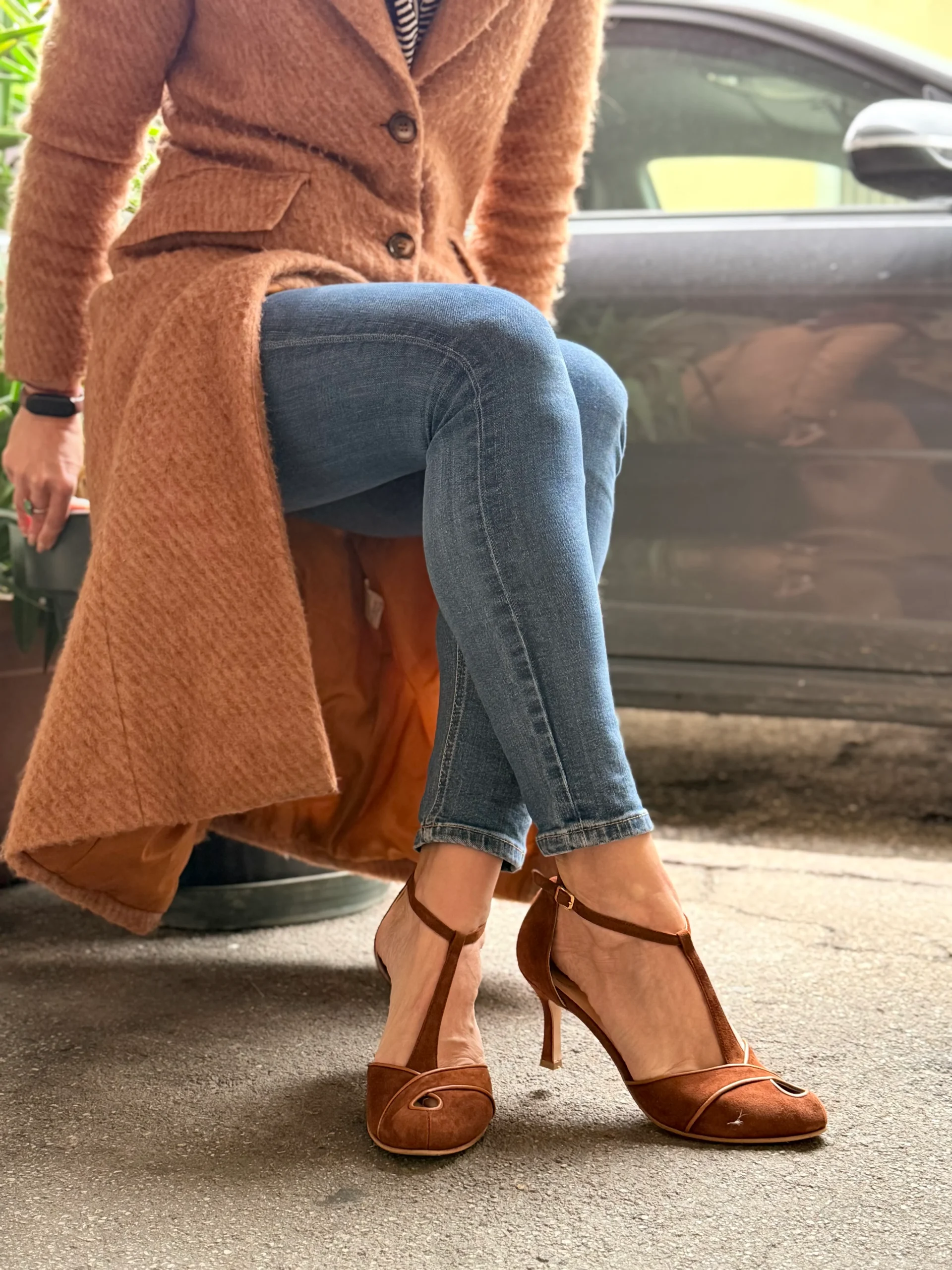 Greta Brown decollete t-bar aperta ai lati con tacco 7 cm in camoscio marrone artigianale