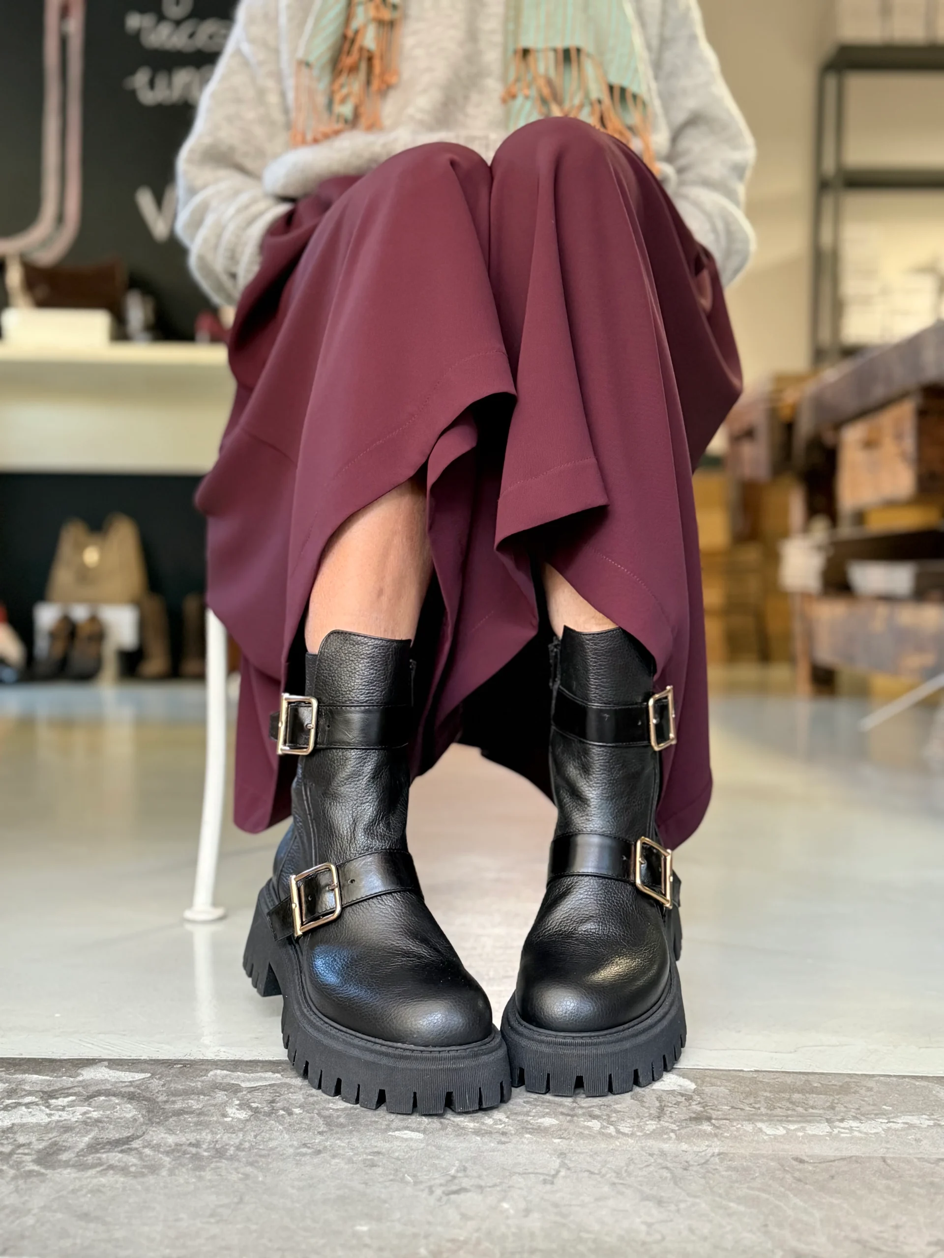 Cobain stivaletto in pelle nera con doppia fibbia artigianale marchigiano