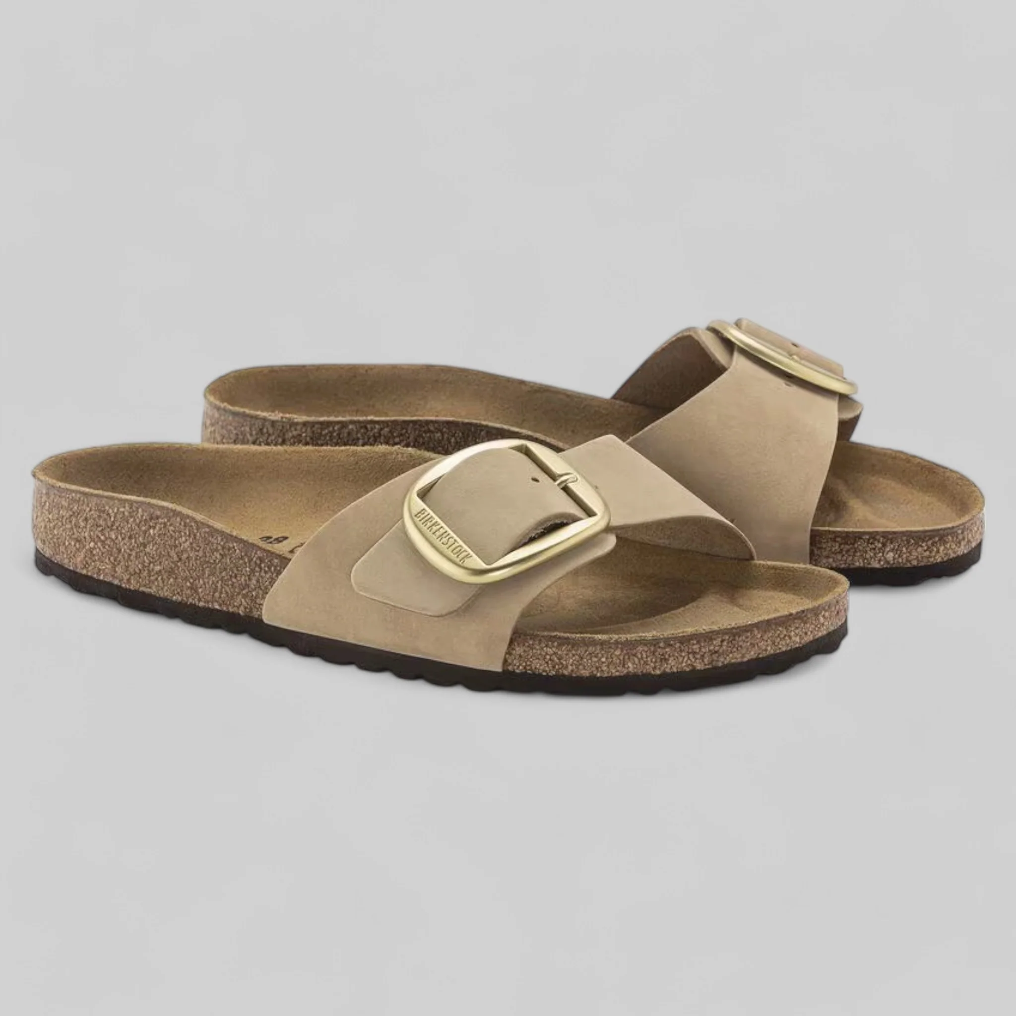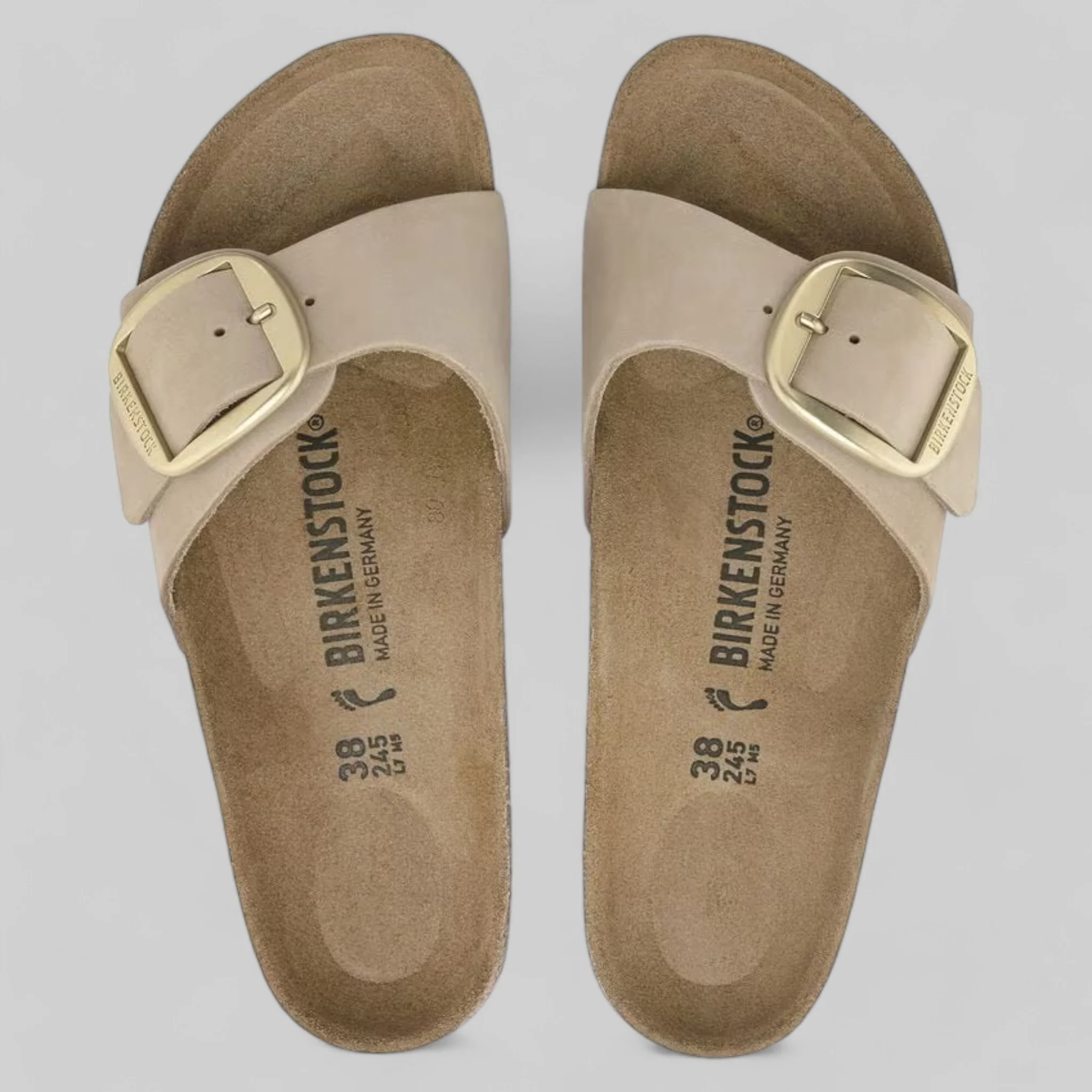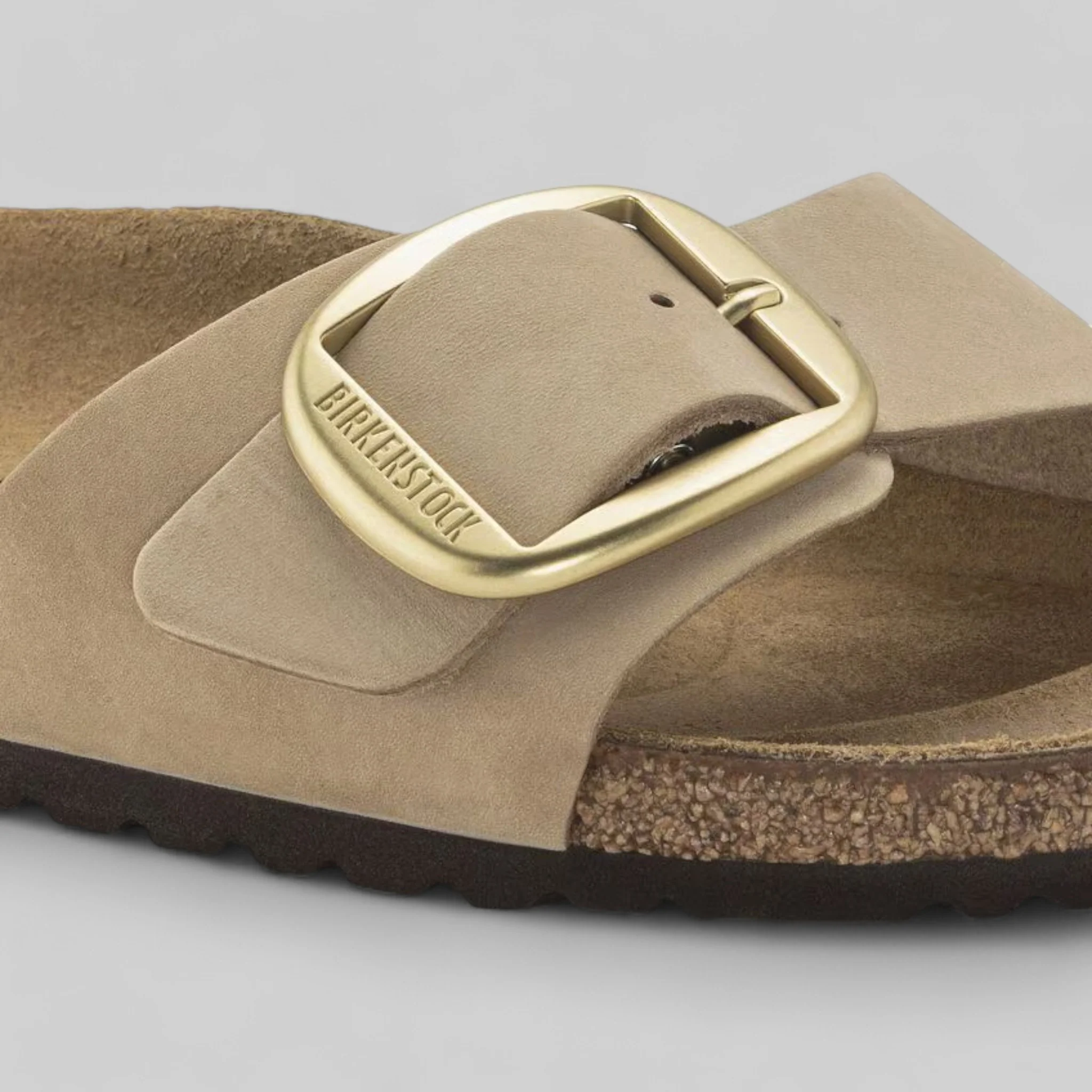 Il modello BIRKENSTOCK Madrid è un vero classico che entusiasma il mondo della moda con il suo design essenziale. La variante Big Buckle presenta una fibbia ad ardiglione grande ed elegante, un bel particolare che spicca su questi sandali molto sobri. La tomaia è in pregiata pelle nabuk, fantastica con il suo look naturale e rustico.