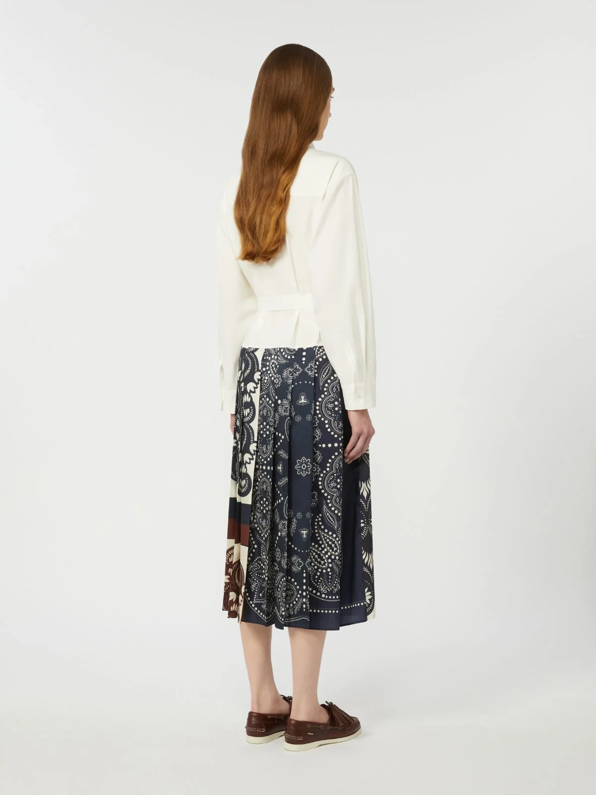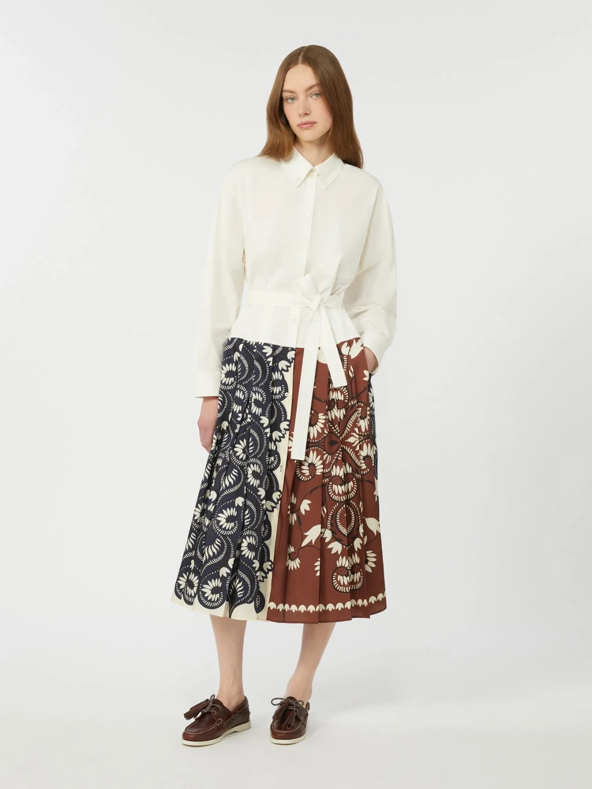 Abito chemisier midi caratterizzato da pannelli in twill stampato a pieghe sulla gonna e cintura abbinata in vita.