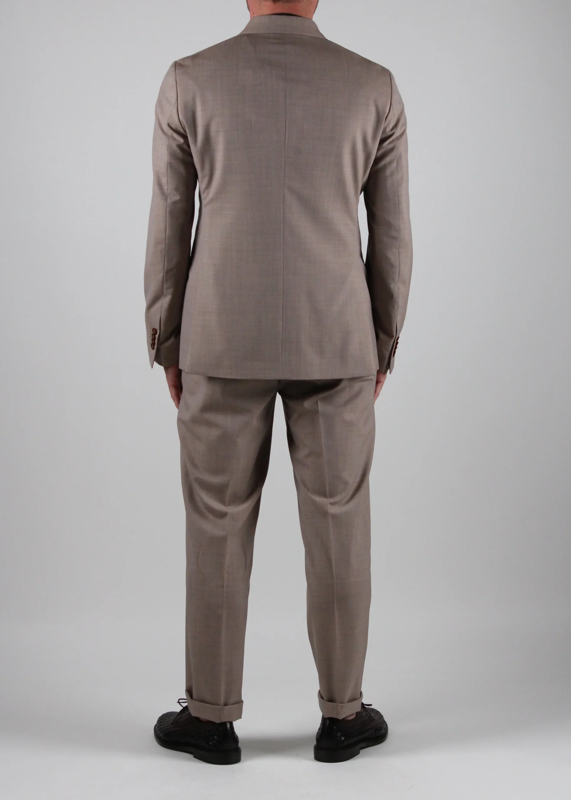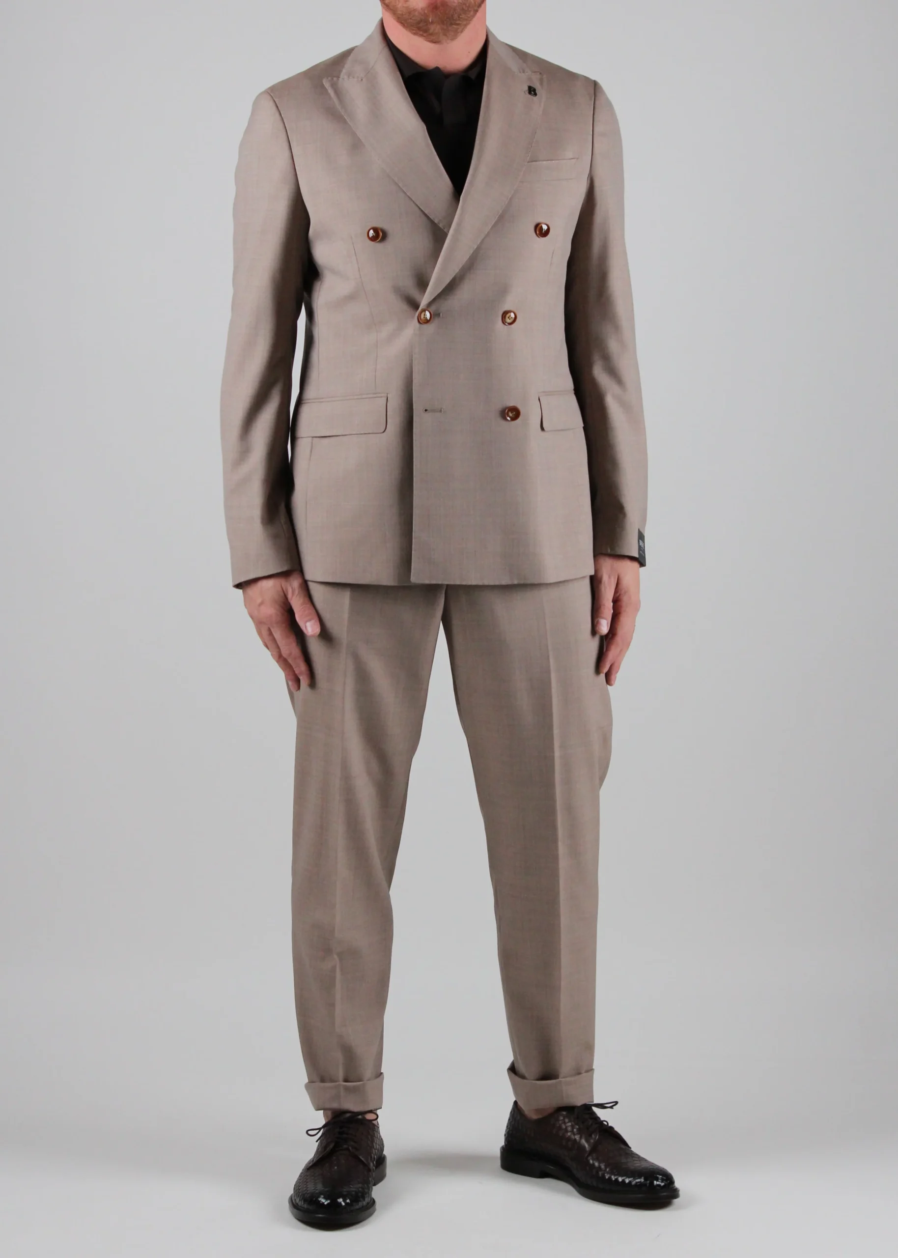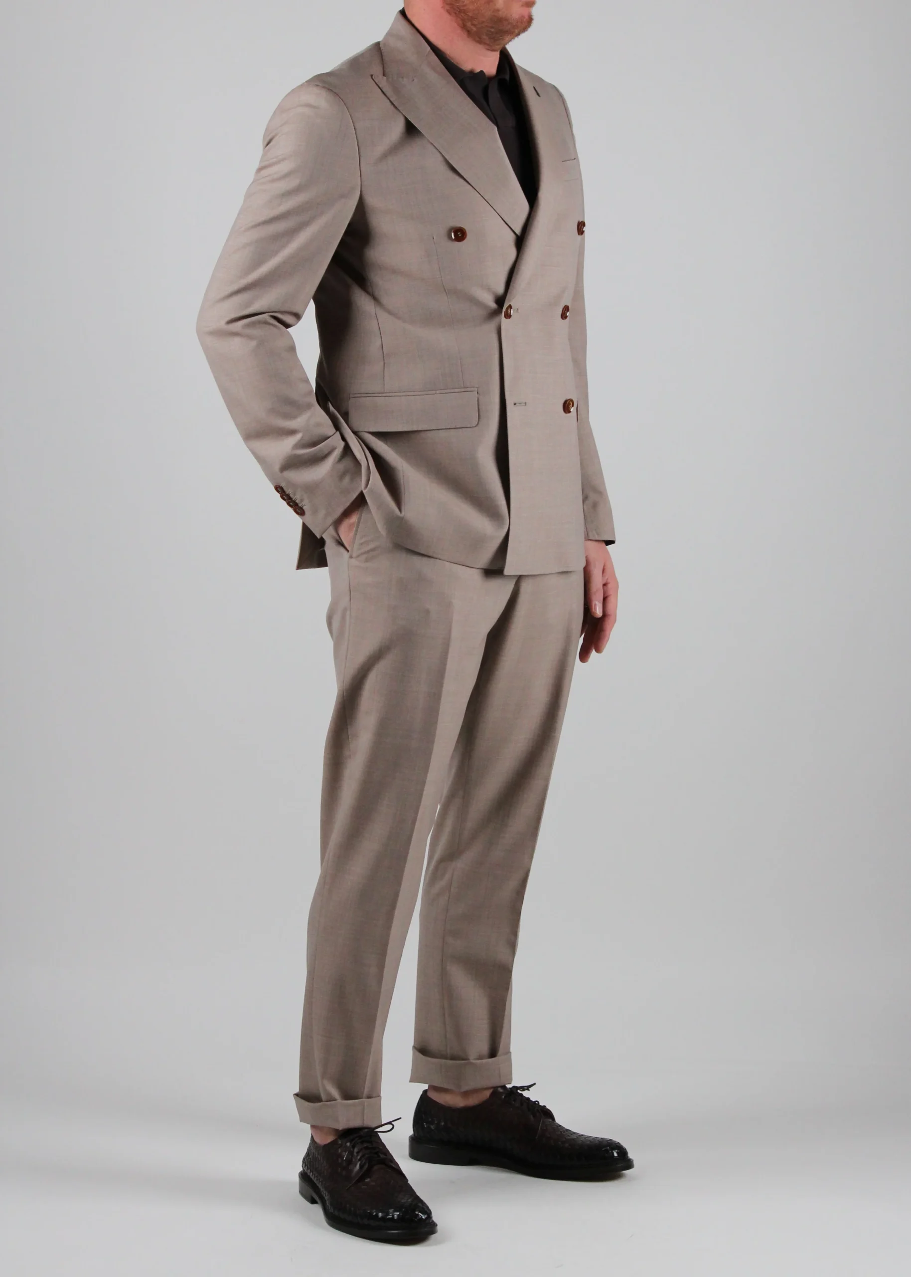 Abito estivo modello doppiopetto, vestibilità slim, colore sabbia. pantalone tasca america con pinces sul davanti, apertura in vita con cerniera e triplo bottone. Made in Italy. Composizione 100% fresco lana.