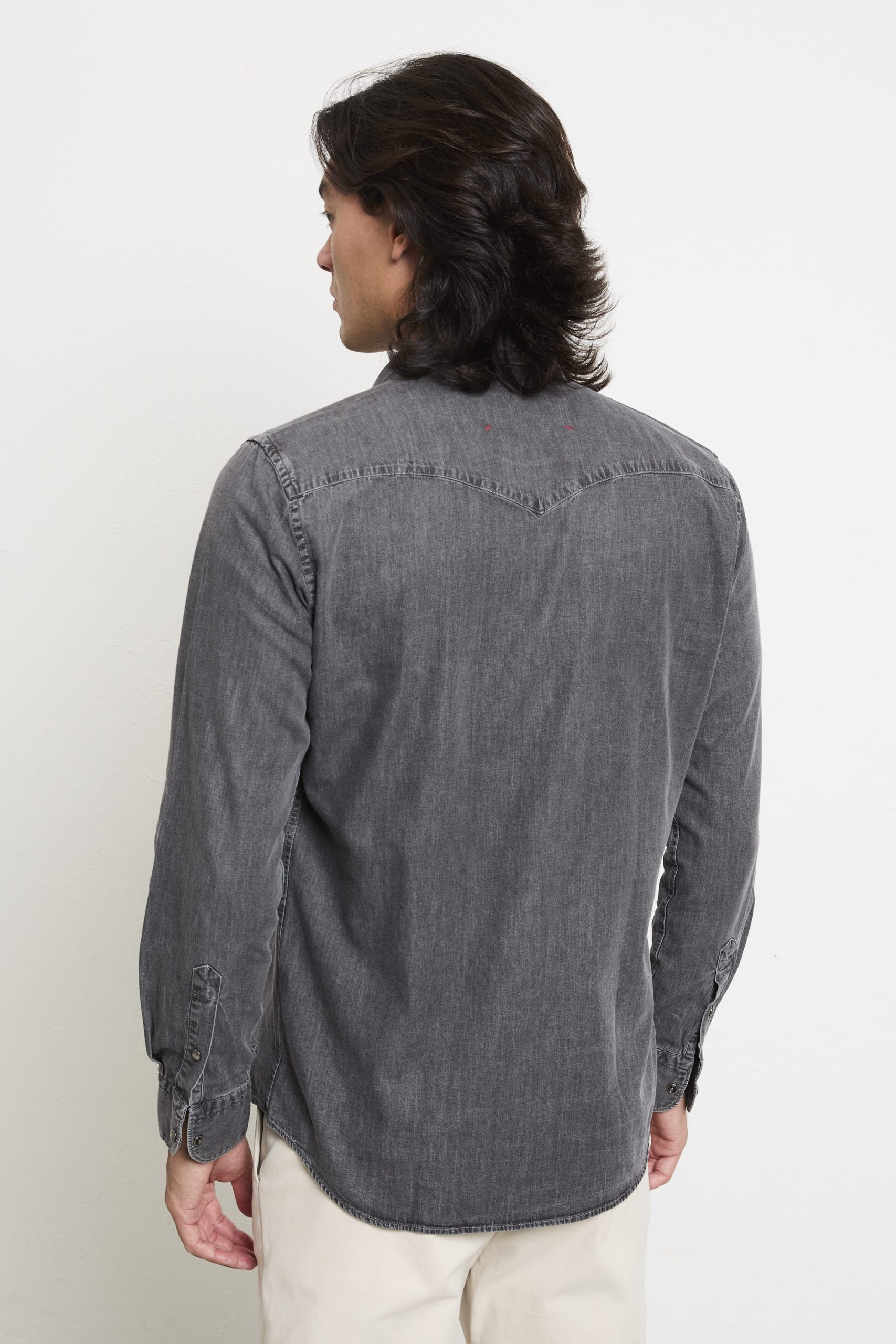 Modello: camicia di jeans con colletto classico, tasche sul petto e fondo stondato