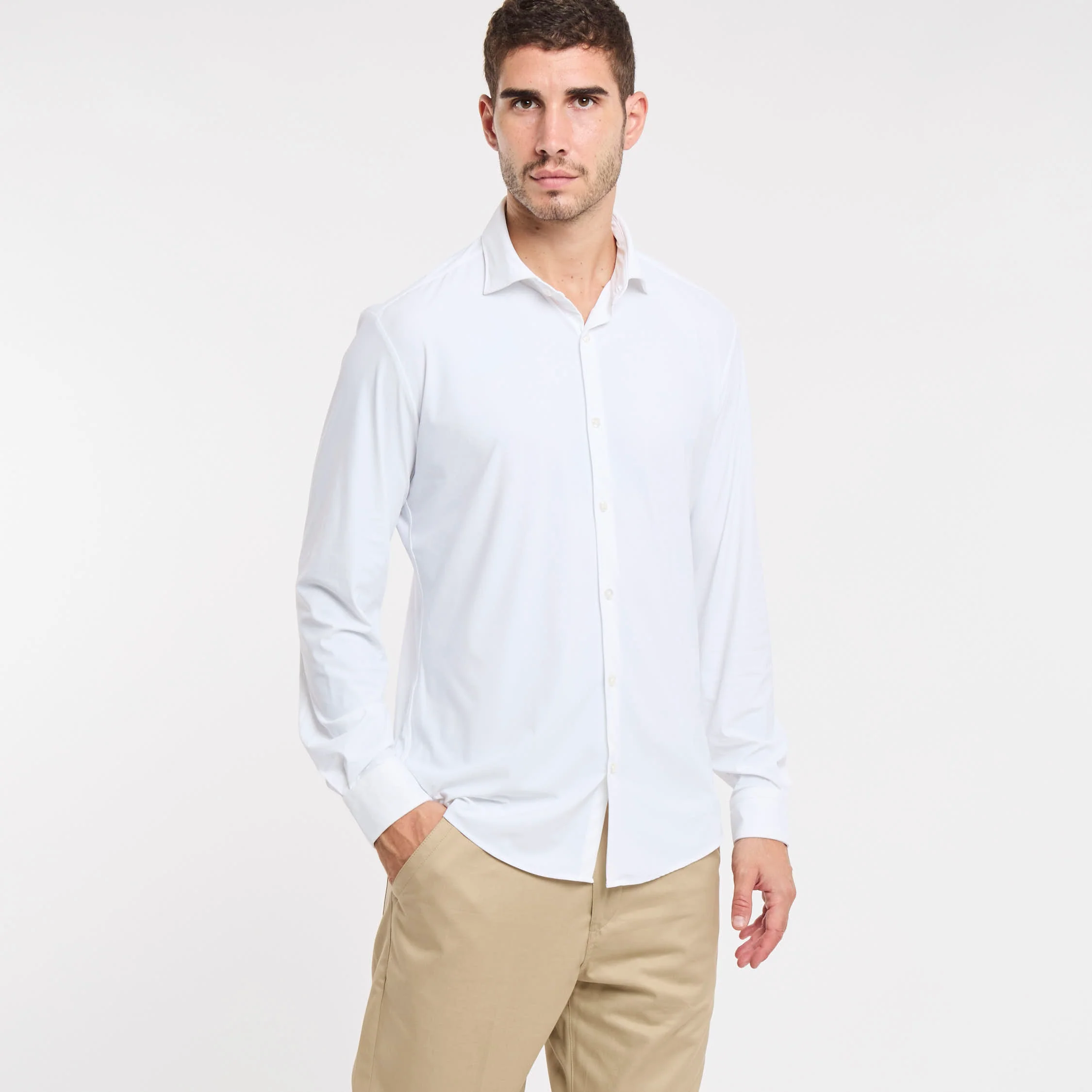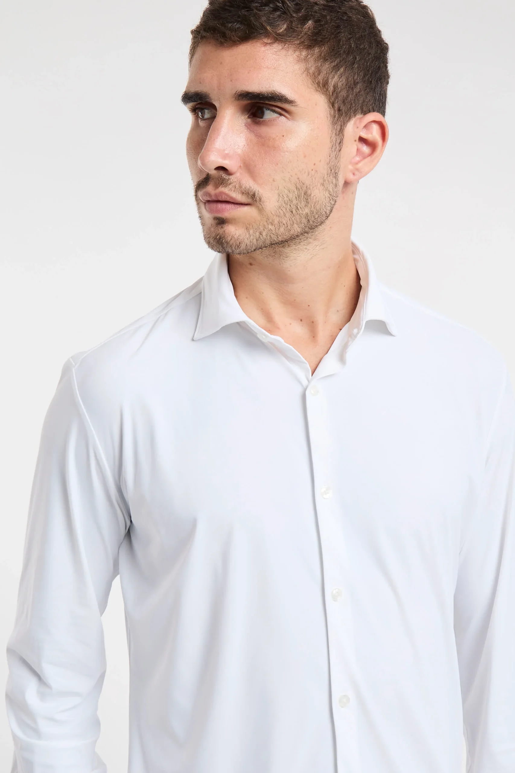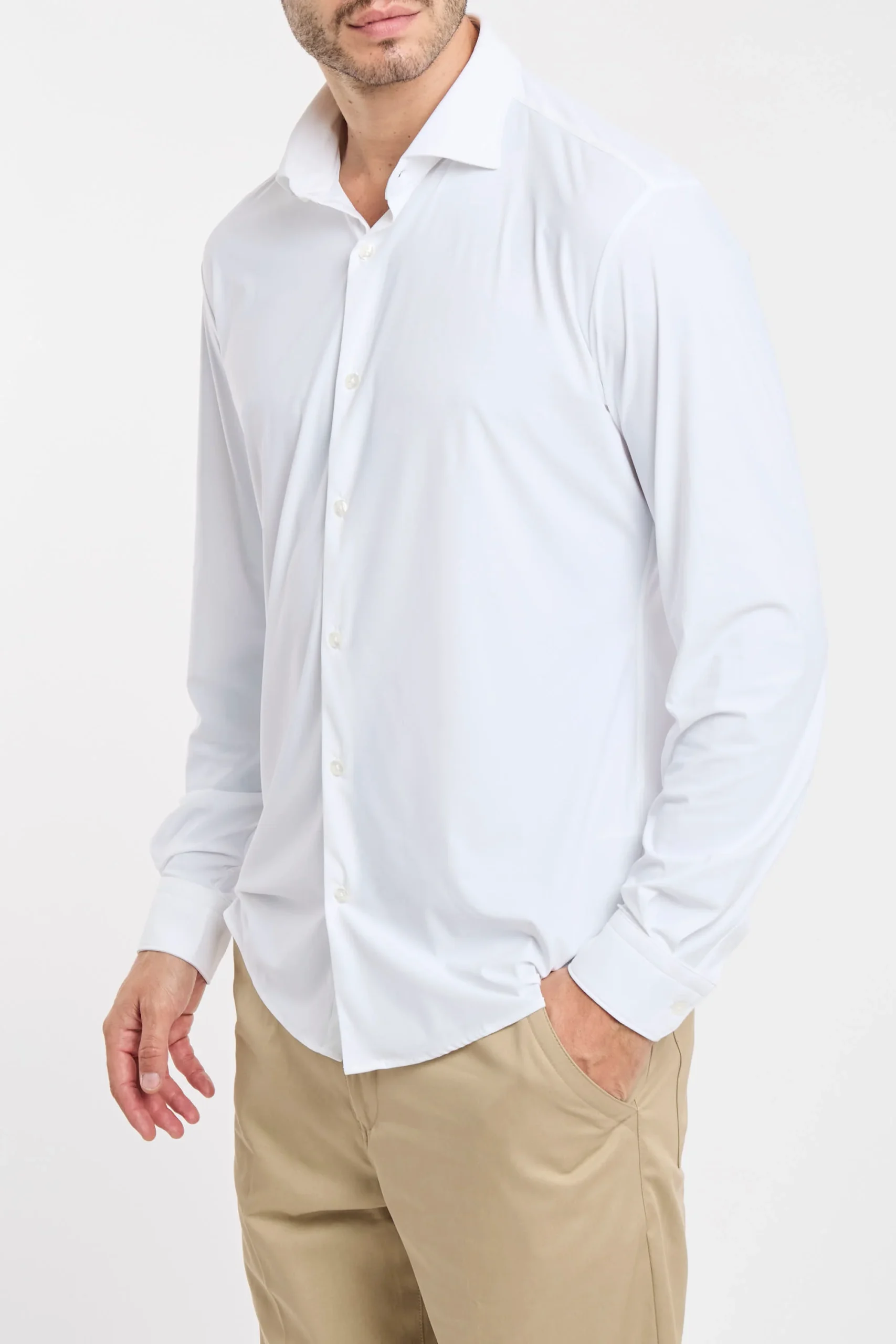 Camicia elasticizzata; Colletto mezzo francese; Chiusura con bottoni; Modello sfiancato; Fondo stondato; Polsini con bottoni; Composizione: 76% Poliammide, 24% Elastane