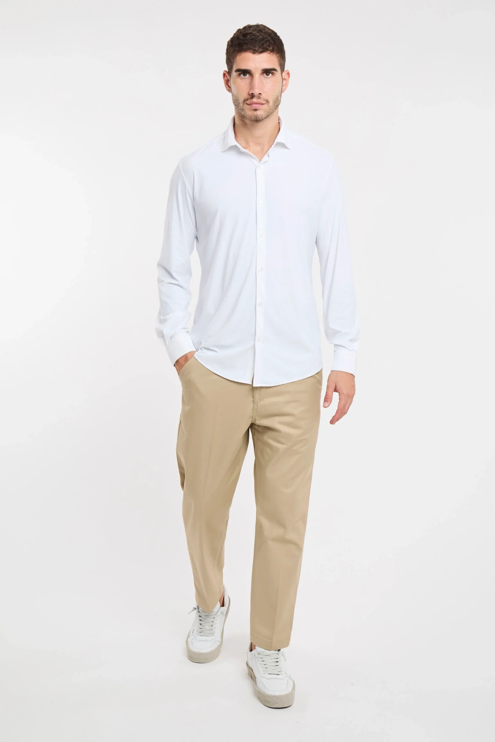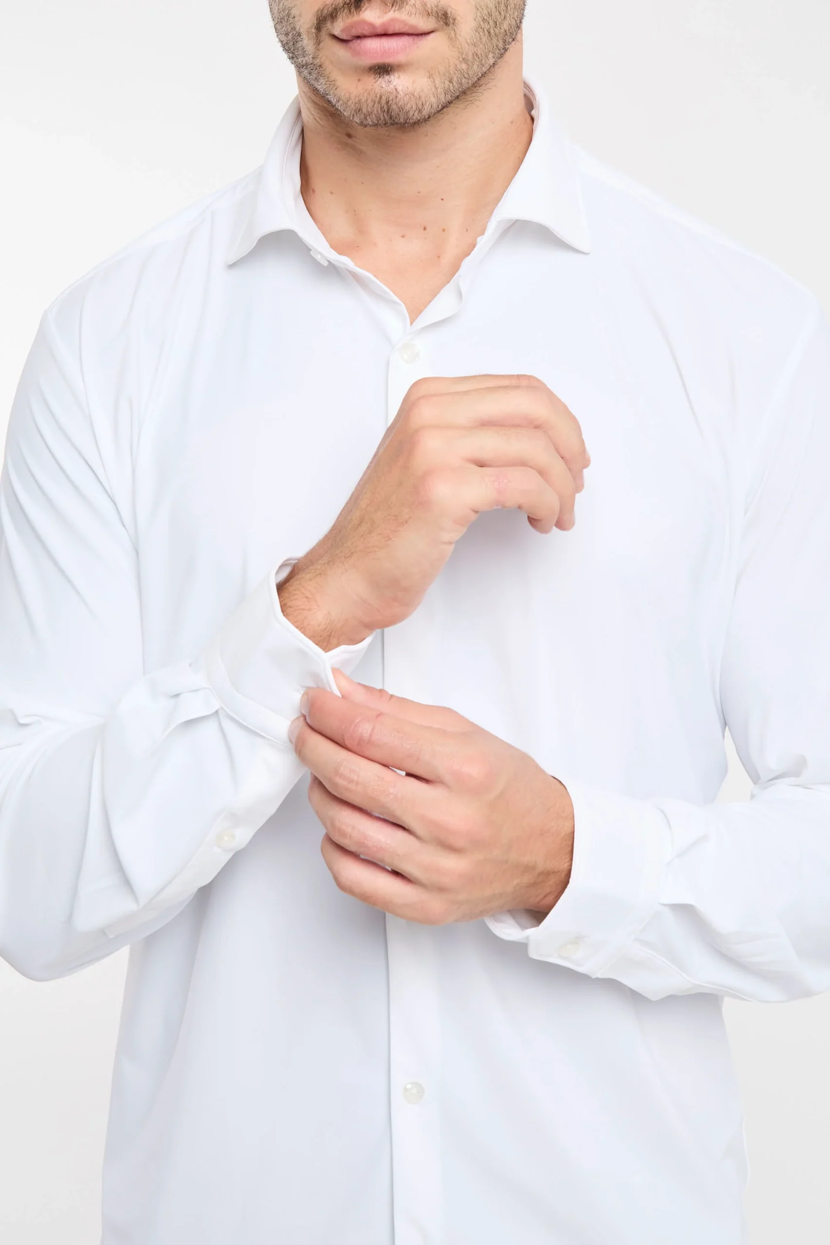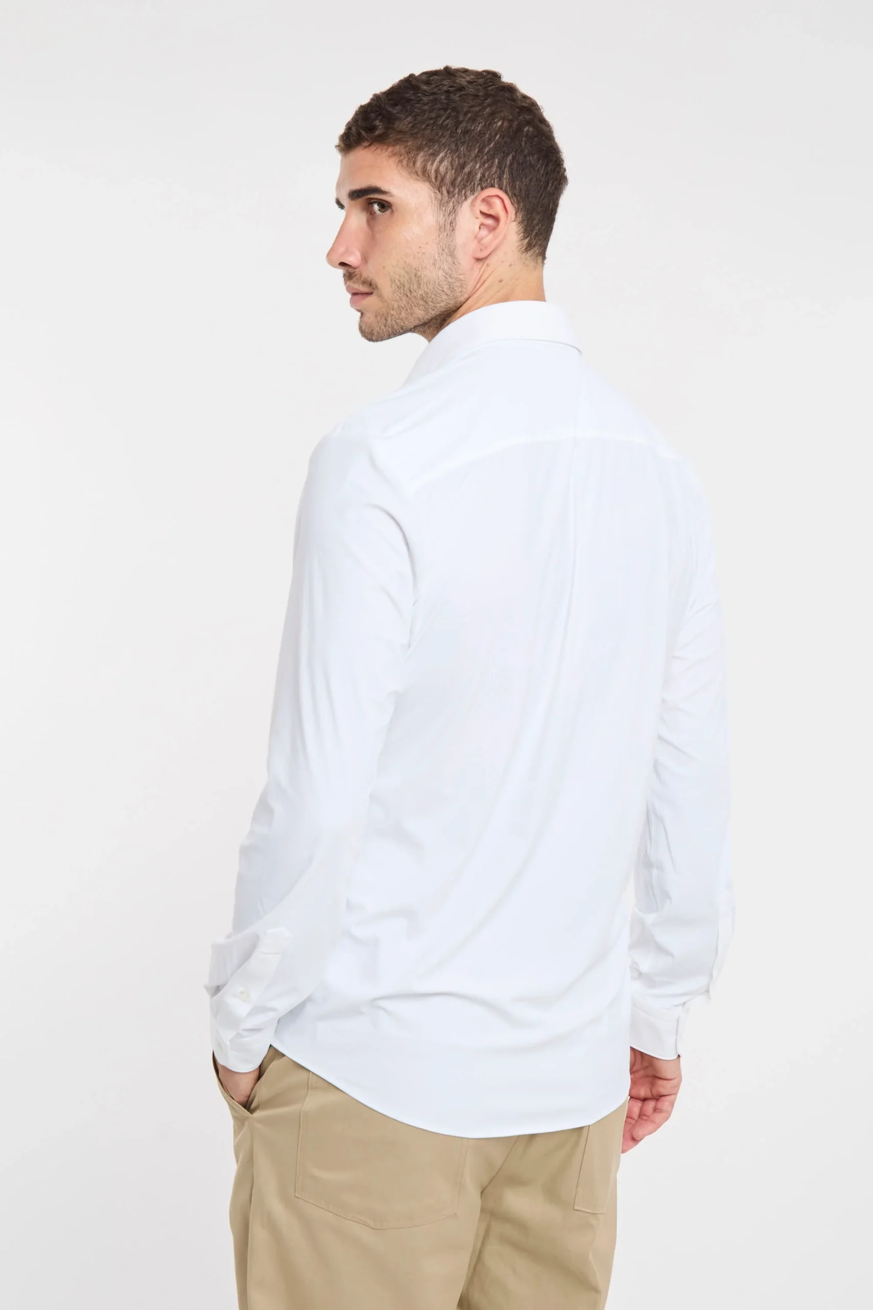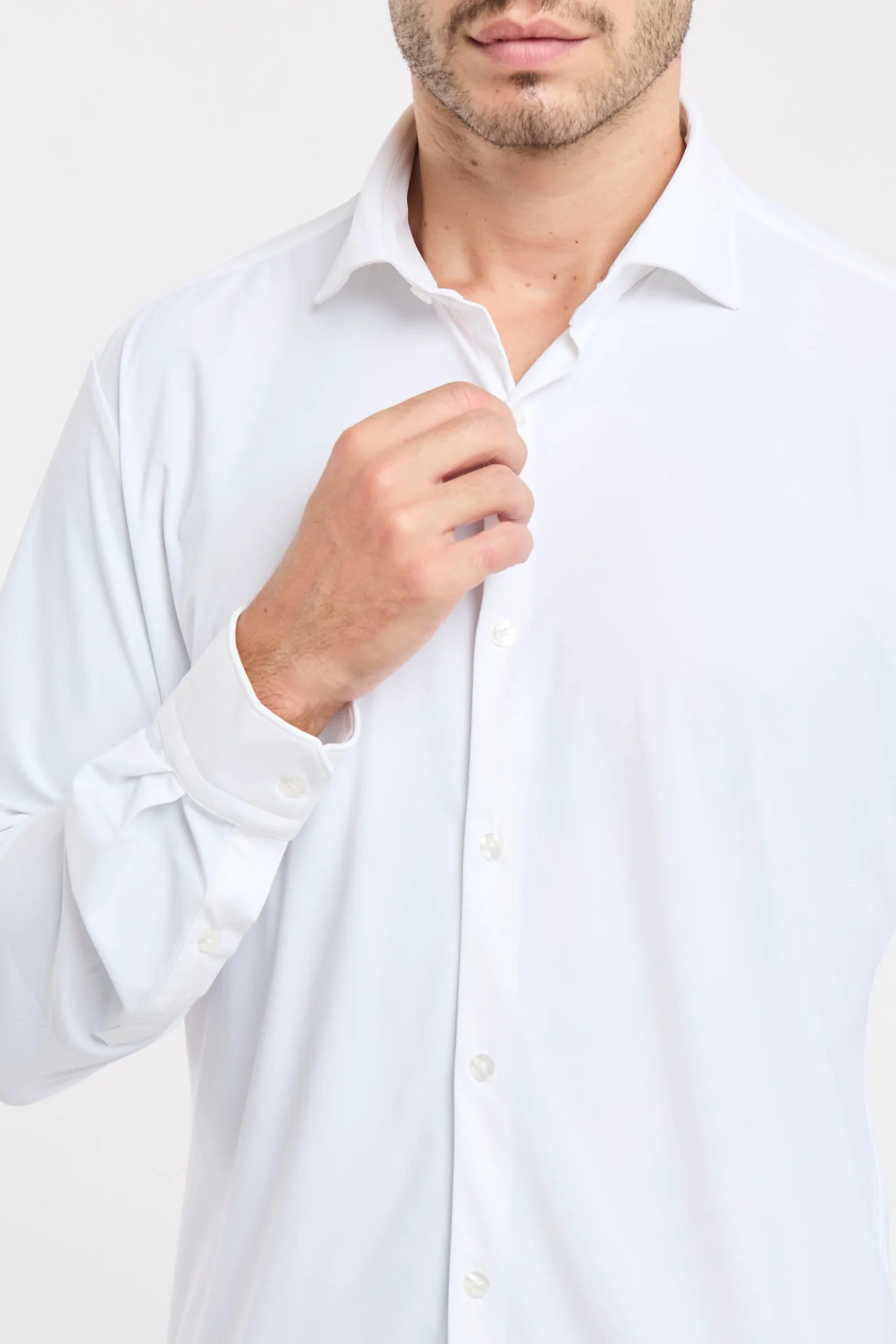 Camicia elasticizzata; Colletto mezzo francese; Chiusura con bottoni; Modello sfiancato; Fondo stondato; Polsini con bottoni; Composizione: 76% Poliammide, 24% Elastane
