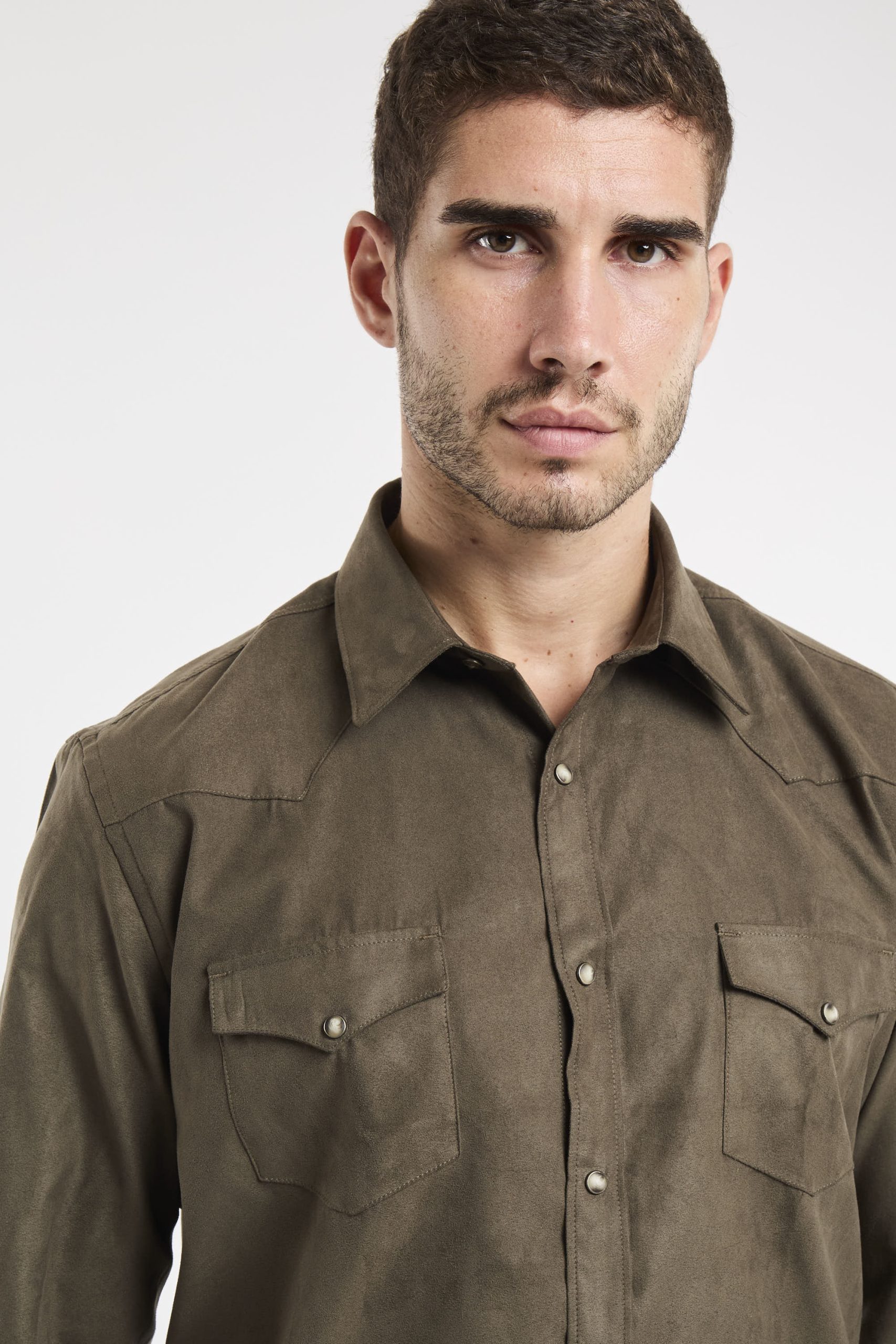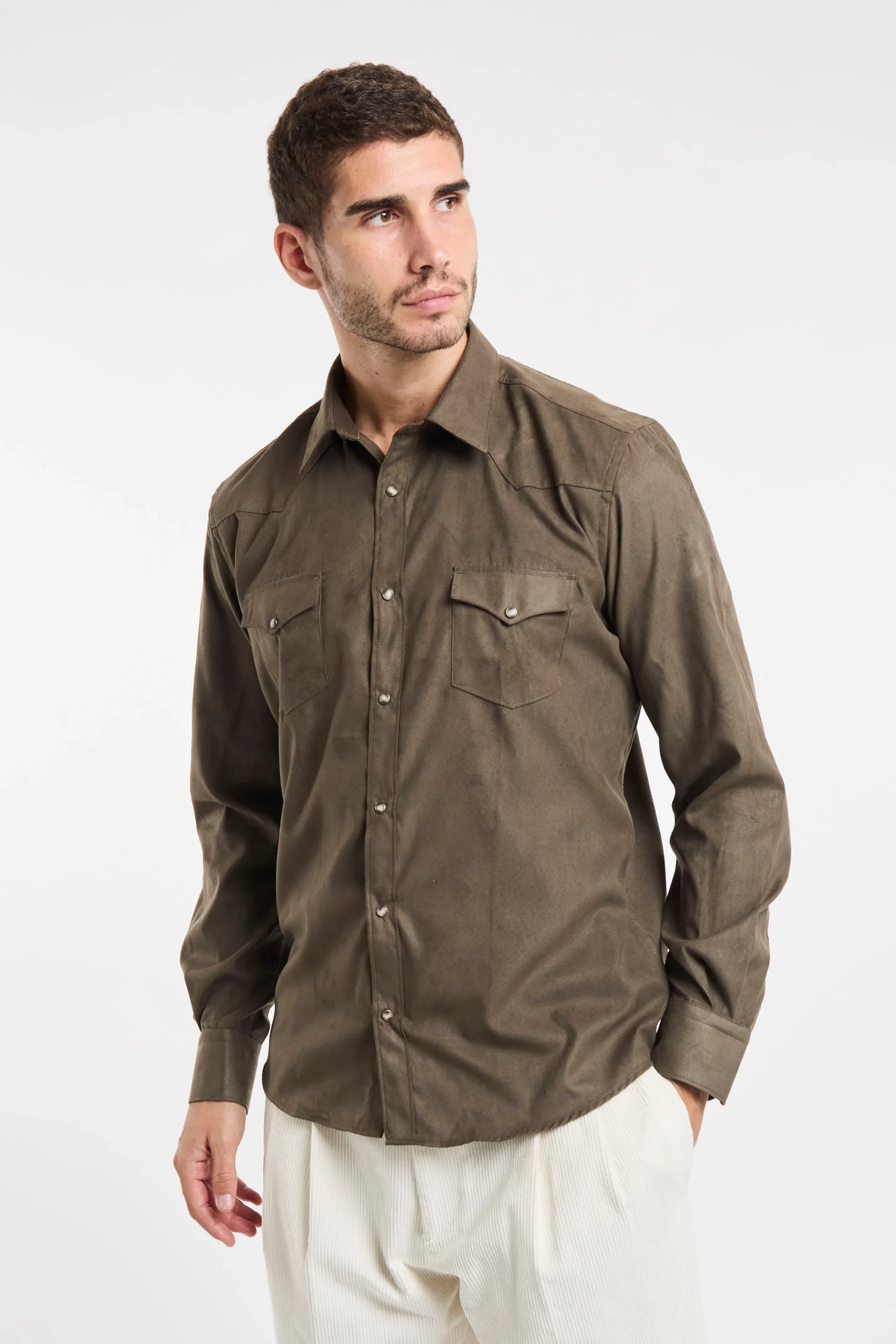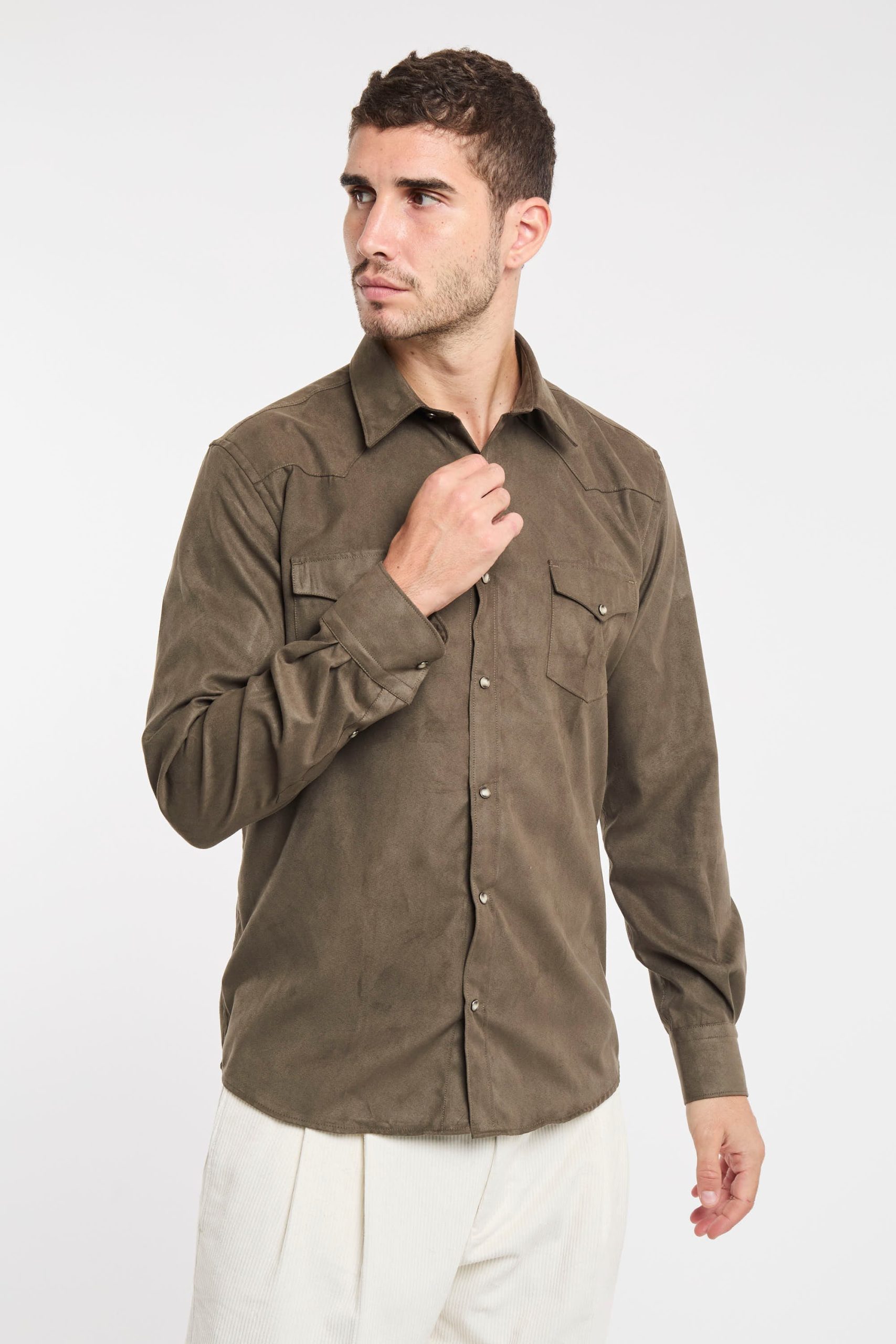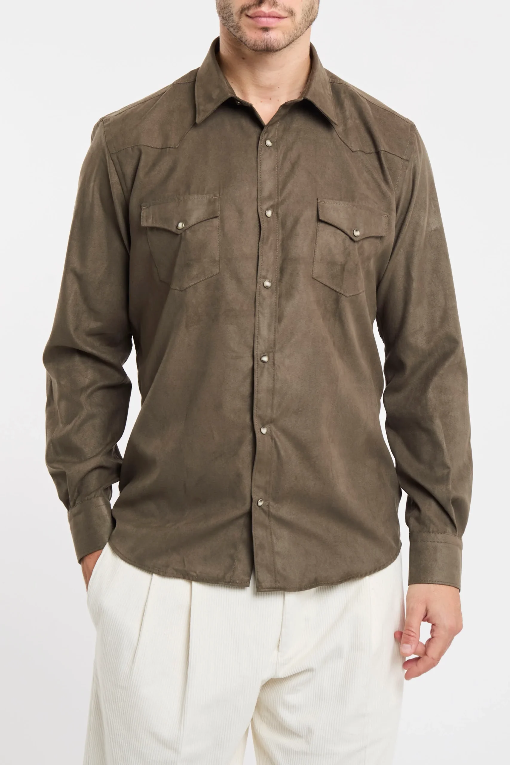 Camicia eco suede; Colletto mezzo francese; Chiusura con bottoni automatici; Due tasche sul petto con patta e bottone; Modello sfiancato; Fondo stondato; Polsini con bottoni; Composizione: 100% Poliestere