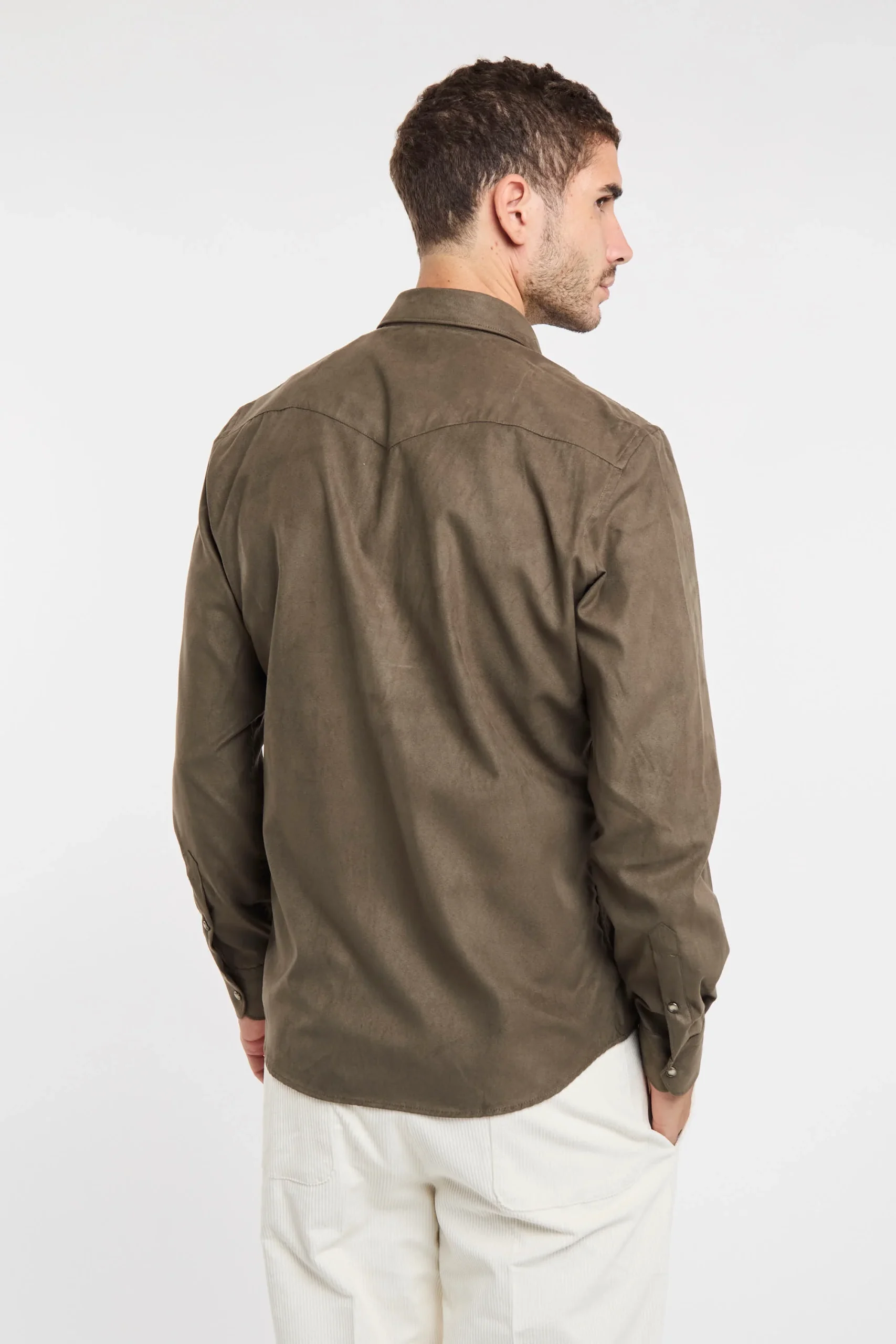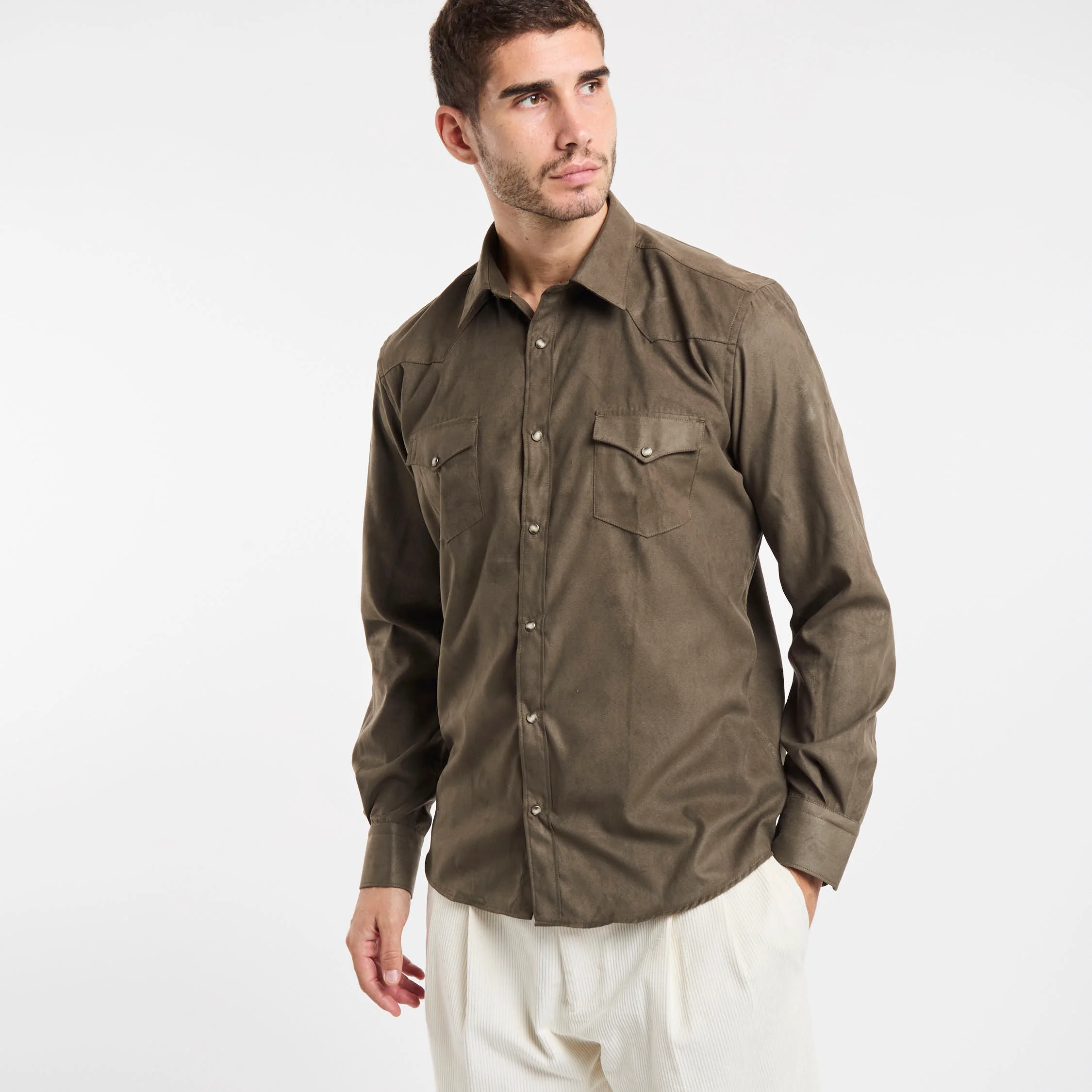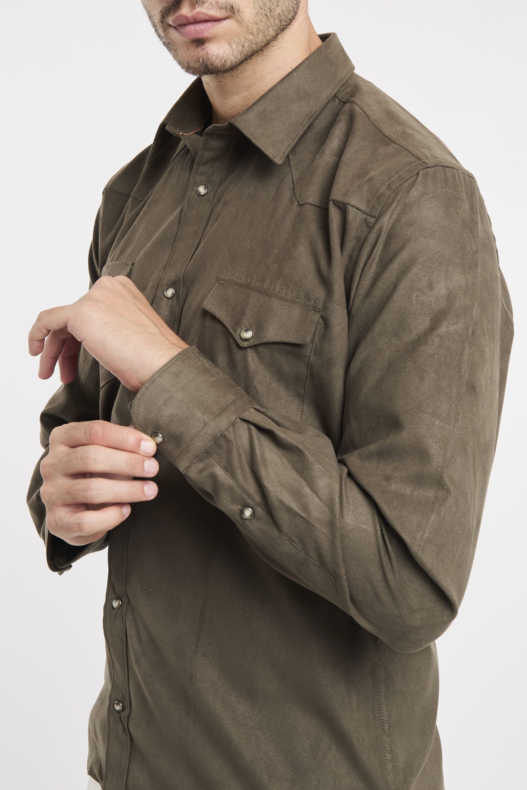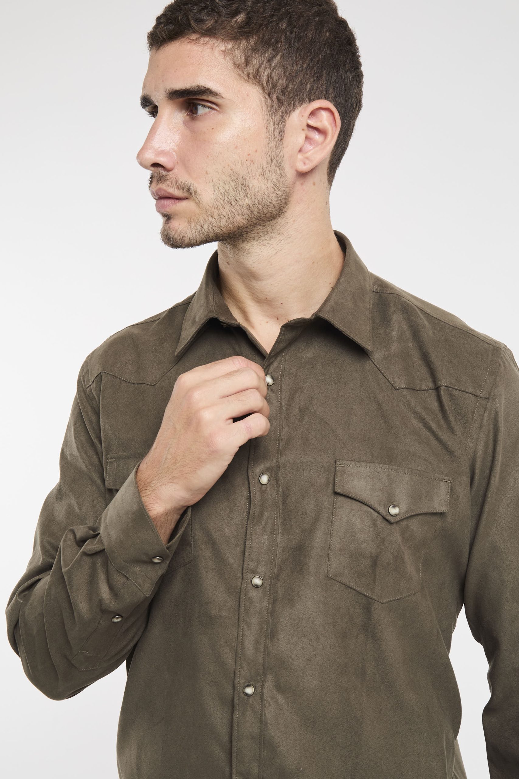 Camicia eco suede; Colletto mezzo francese; Chiusura con bottoni automatici; Due tasche sul petto con patta e bottone; Modello sfiancato; Fondo stondato; Polsini con bottoni; Composizione: 100% Poliestere