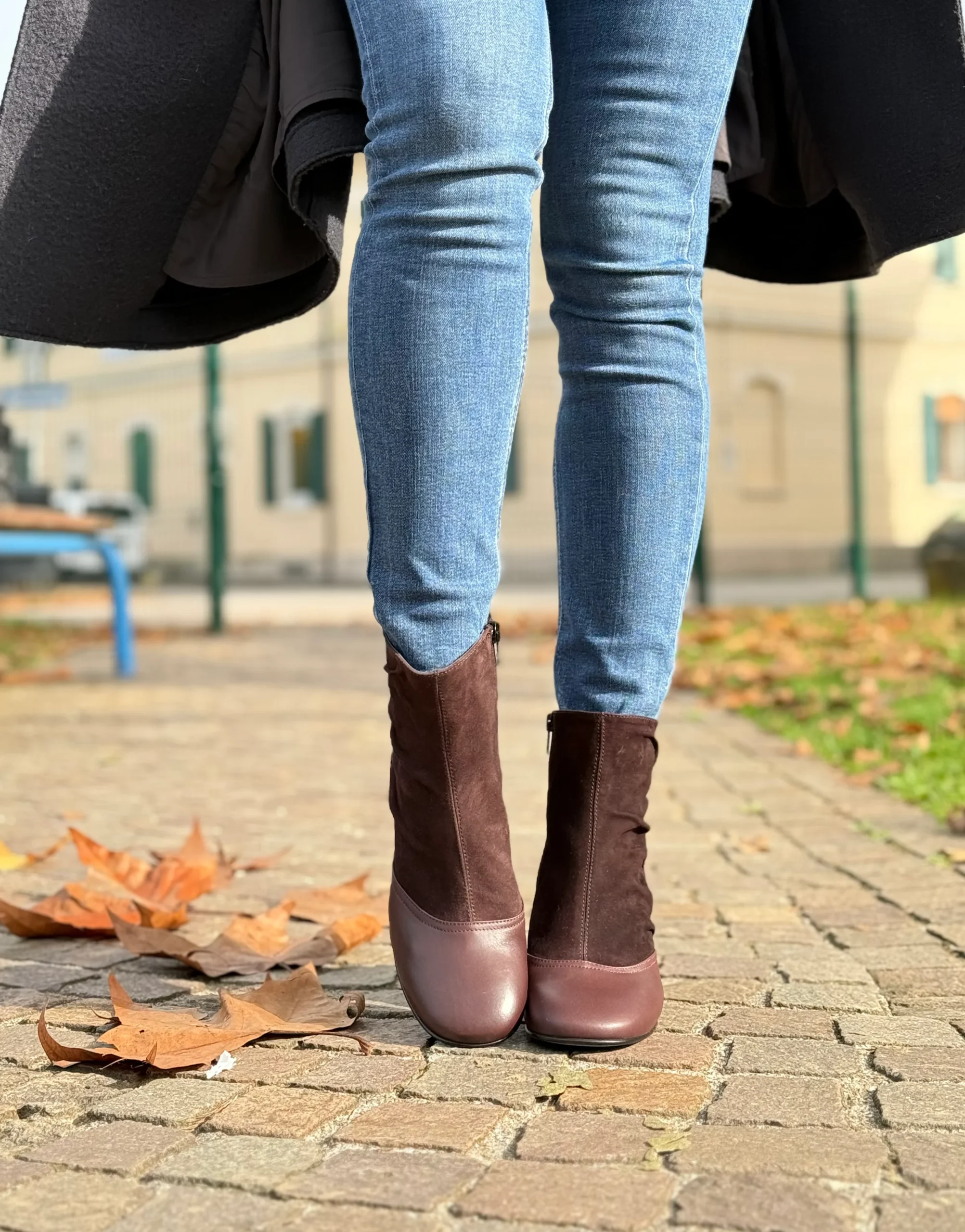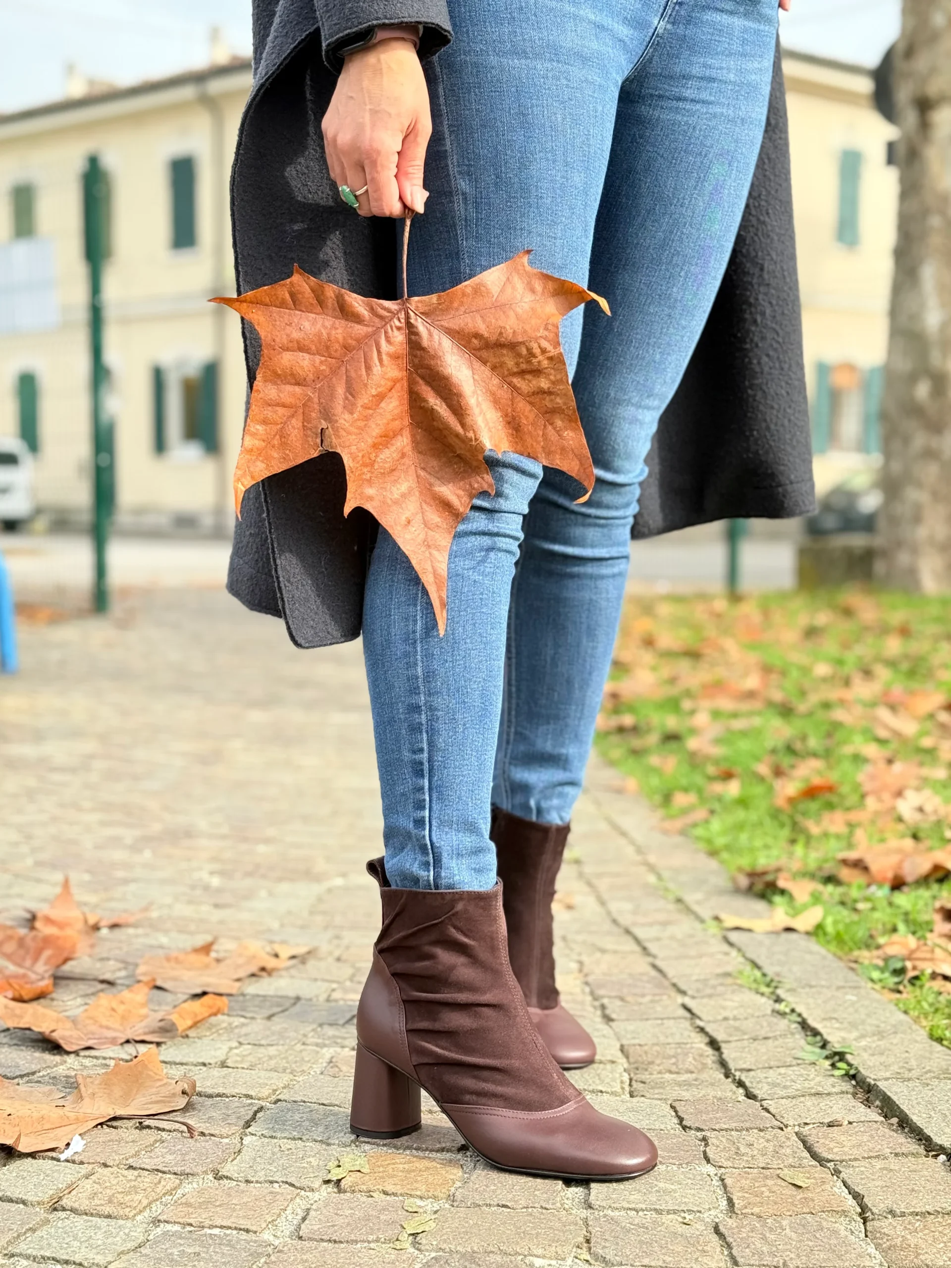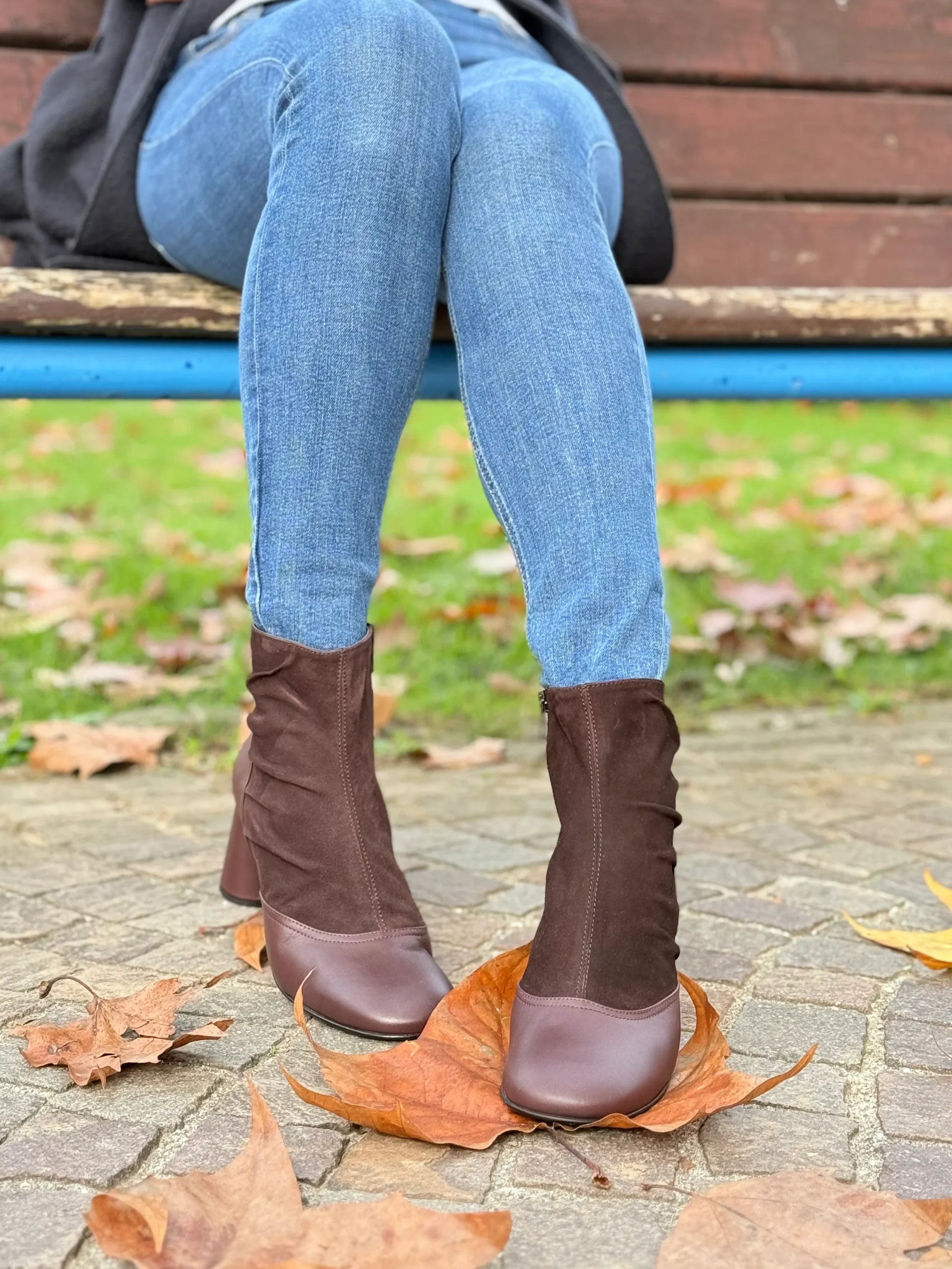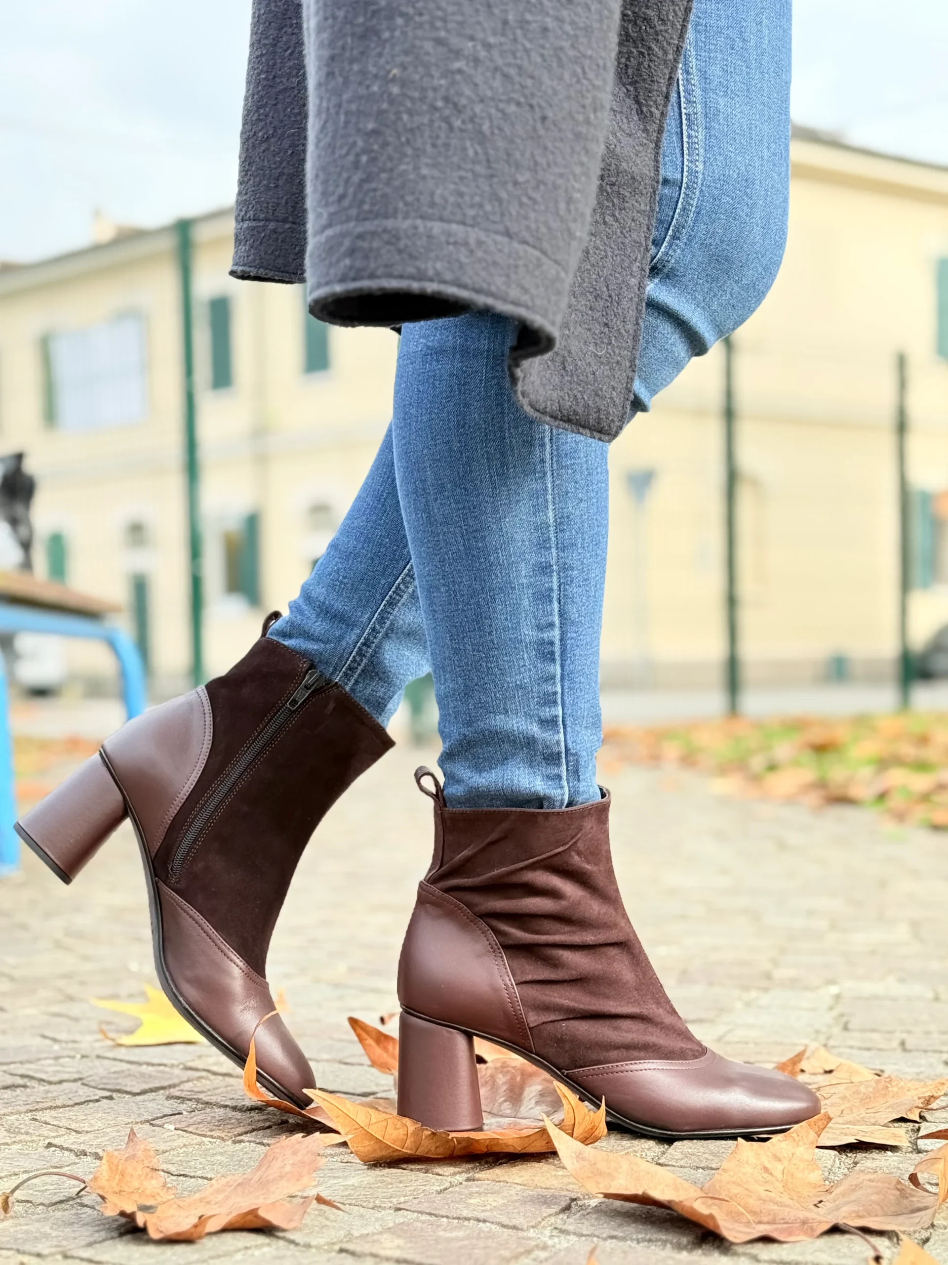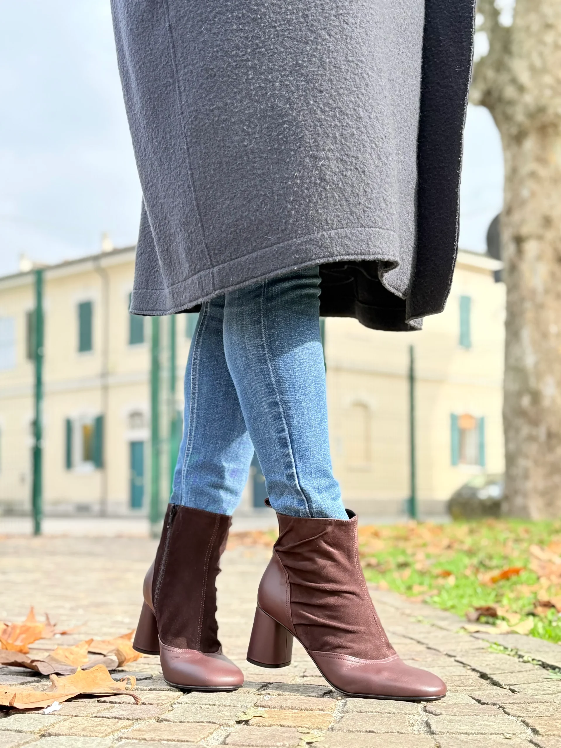 La tomaia combina due materiali pregiati: la nappa color prugna, liscia e setosa, avvolge la parte frontale e il tallone donando struttura e lucentezza naturale, mentre il camoscio marrone sul gambale aggiunge morbidezza visiva e un contrasto materico raffinato.