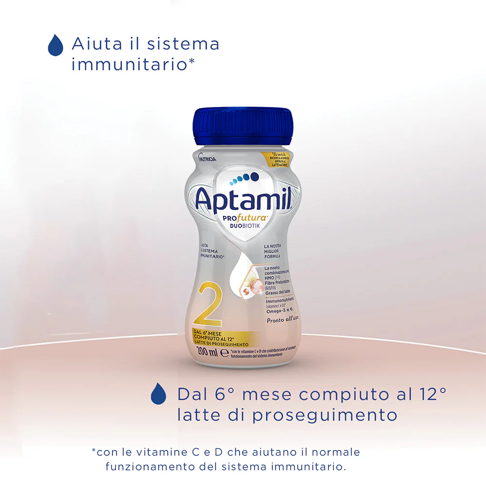 Aptamil Profutura Duobiotik 2 contiene la nostra combinazione unica di HMO 2’FL e HMO 3’GL, derivante dal nostro processo esclusivo, Fibre Prebiotiche GOS-FOS (galatto-oligosaccaridi e frutto oligosaccaridi) e grasso del latte. Inoltre, contiene Immunonutrienti (vitamine C e D), che contribuiscono al normale funzionamento del sistema immunitario, Omega-3 (ALA e DHA) e 6.