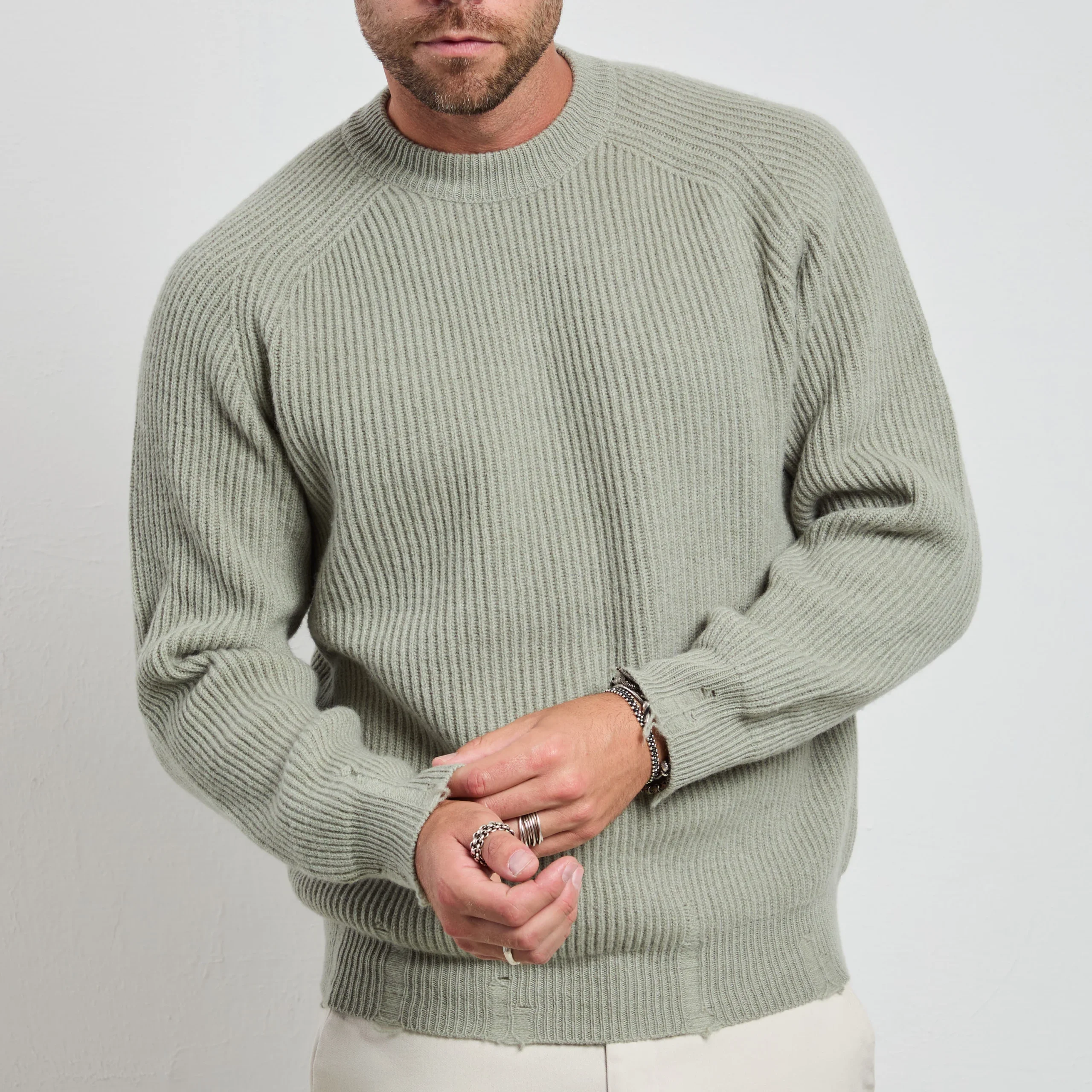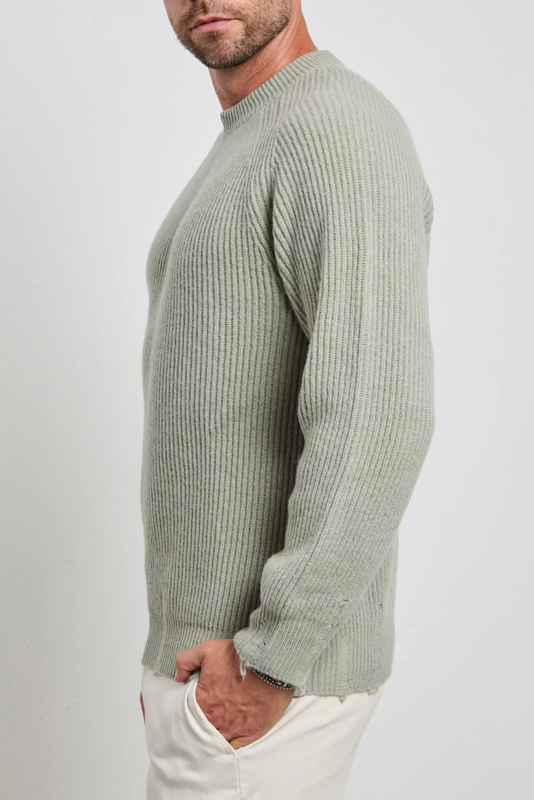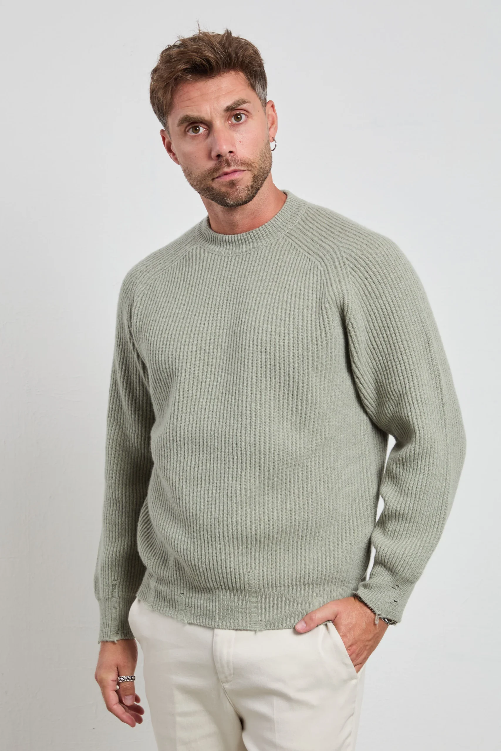 Un maglione a coste in verde salvia dal taglio moderno: la texture marcata del fondo e dei polsi dona struttura e personalità a un capo altrimenti minimal. Abbinalo a pantaloni a palazzo grigi e mocassini in pelle scamosciata per un look raffinato oppure con denim nero e stivaletti per un’uscita serale più audace.