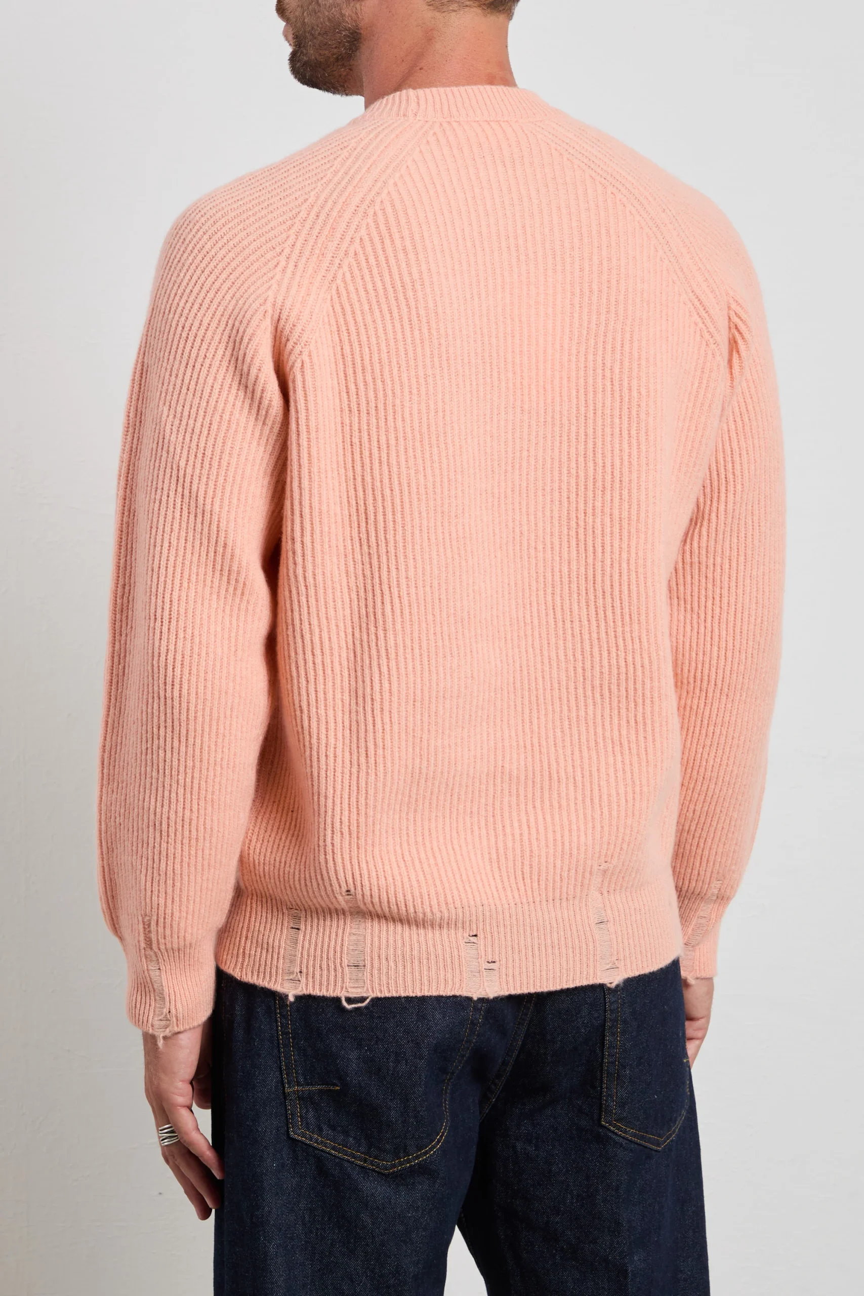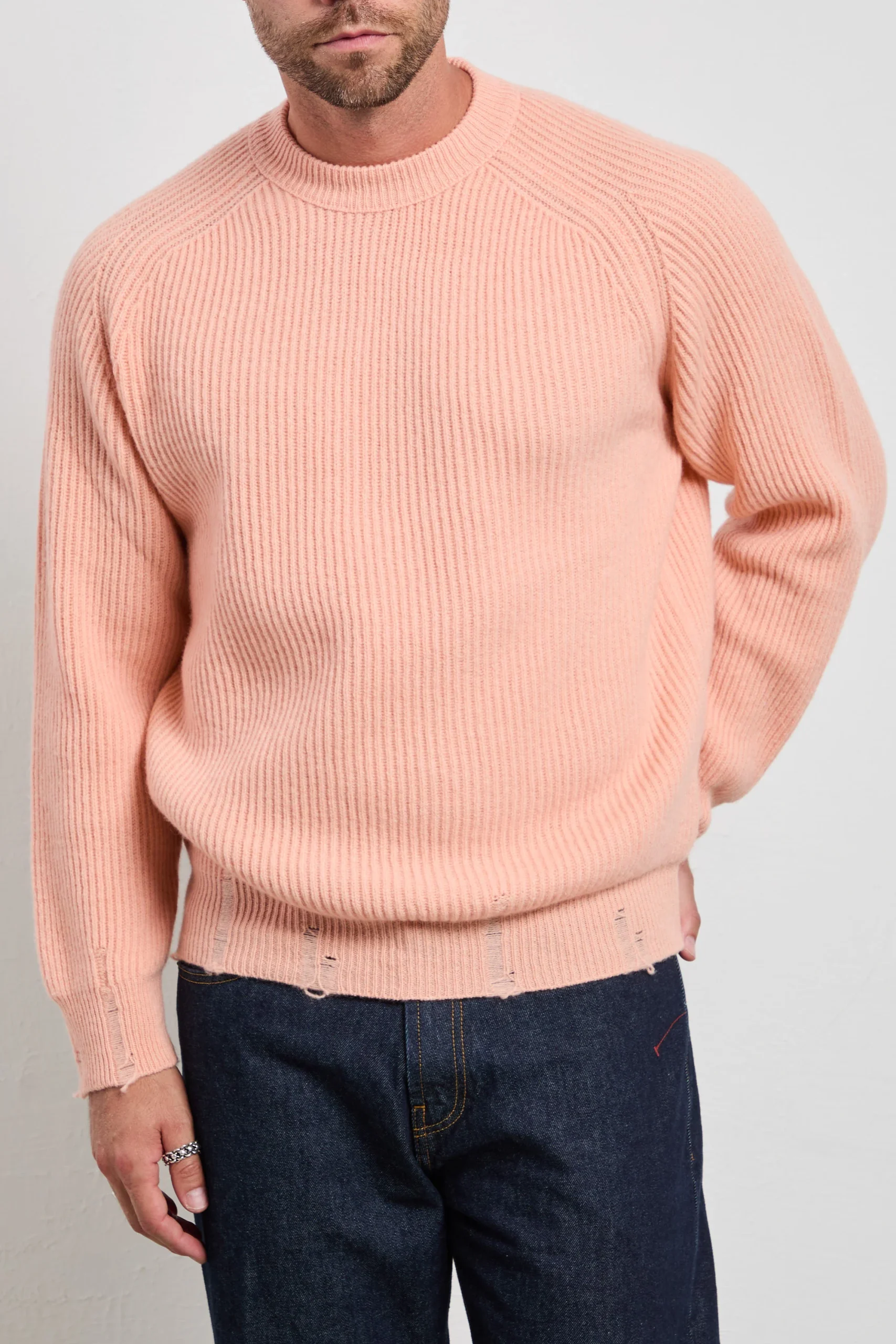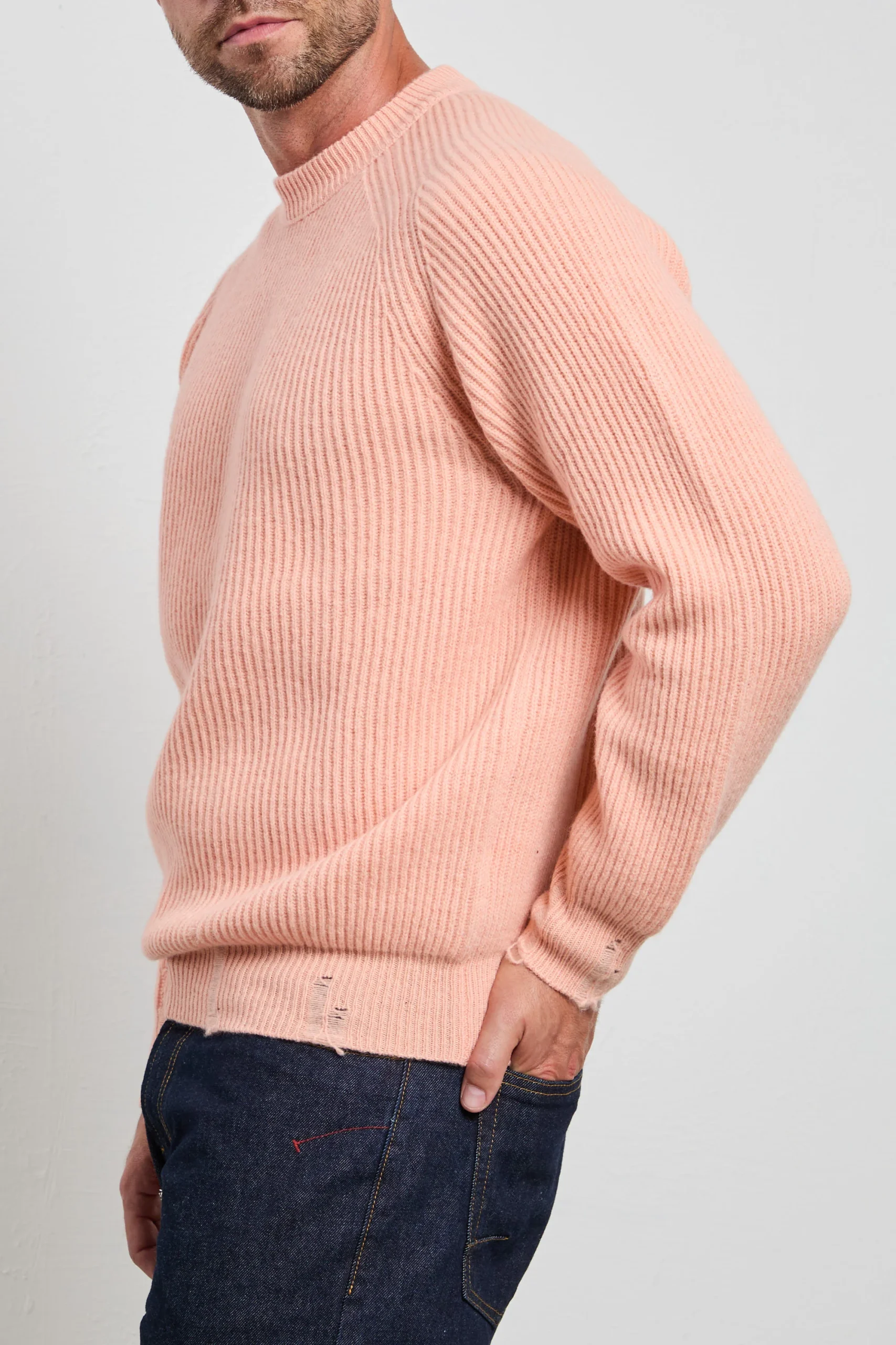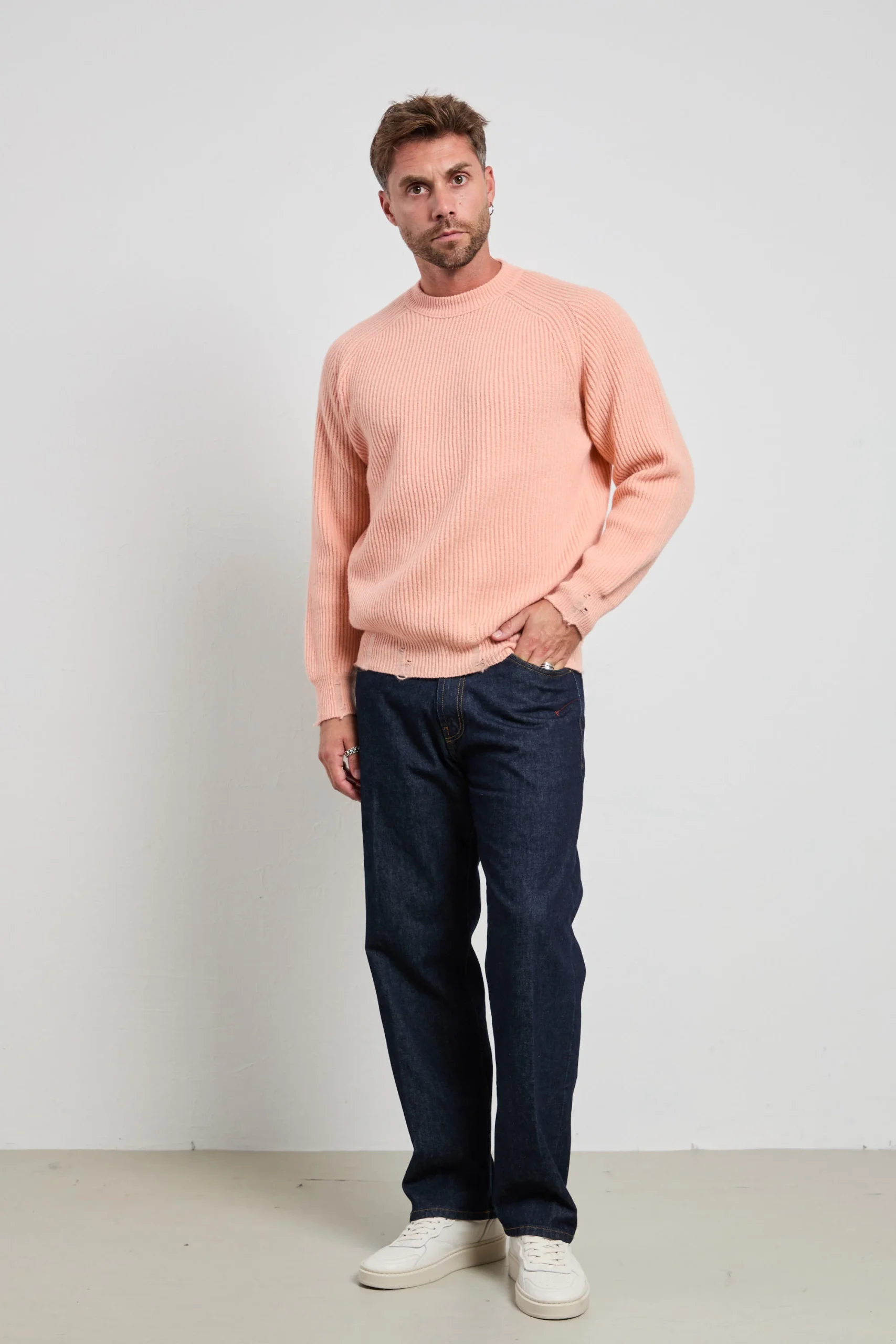 Un maglione a coste color salmone dal taglio moderno che illumina l’incarnato e dona un tocco deciso ma raffinato. La texture marcata del fondo e dei polsi aggiunge struttura e movimento, mantenendo un’eleganza rilassata. Indossalo con pantaloni color burro e loafers in pelle per un look luminoso e sofisticato, oppure con cargo beige e sneakers bianche per un’eleganza casual contemporanea.