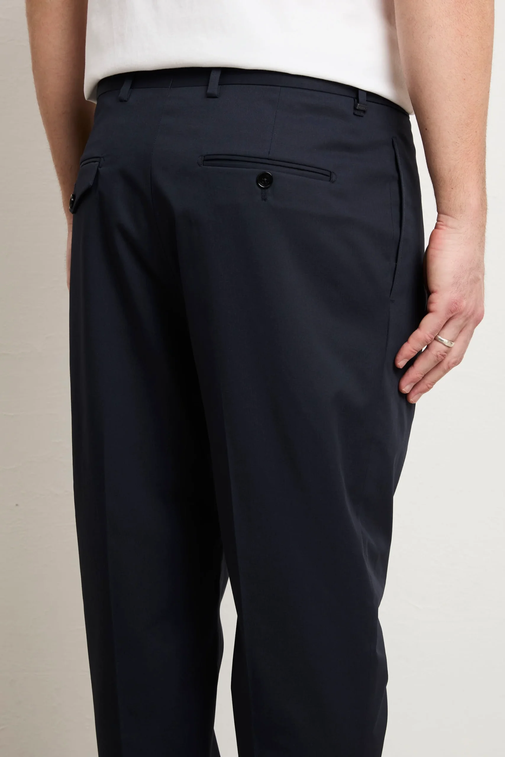 Tasche: due laterali dritte, due posteriori a patta chiuse da bottoni