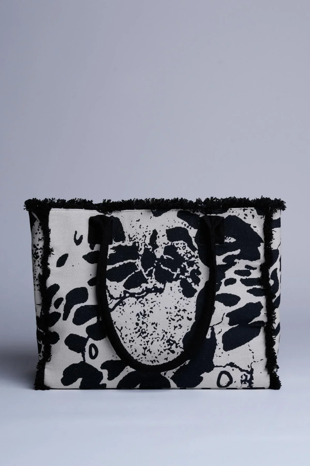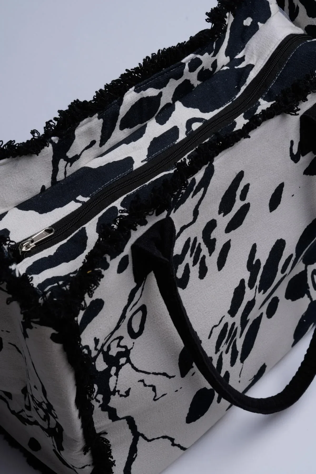 Una borsa stampata con un mix di bianco, nero e avorio che richiama il fascino del design animalier. Un accessorio chic e pratico per ogni occasione.