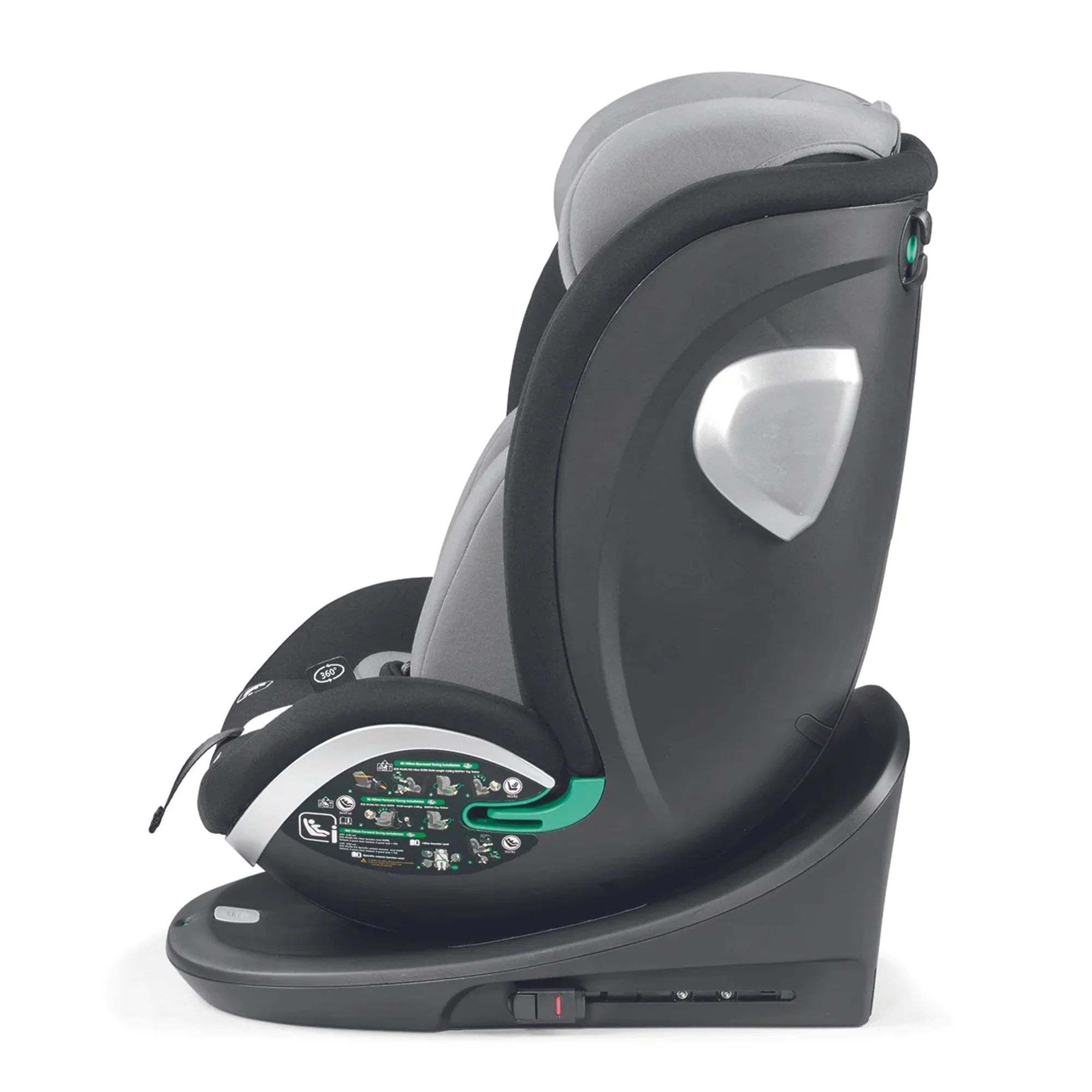 Seggiolino auto girevole “all in one” omologato I-SIZE ECE R129 per bambini da 40 cm a 150 cm di altezza. Massimo comfort e sicurezza dalla nascita fino a 12 anni.