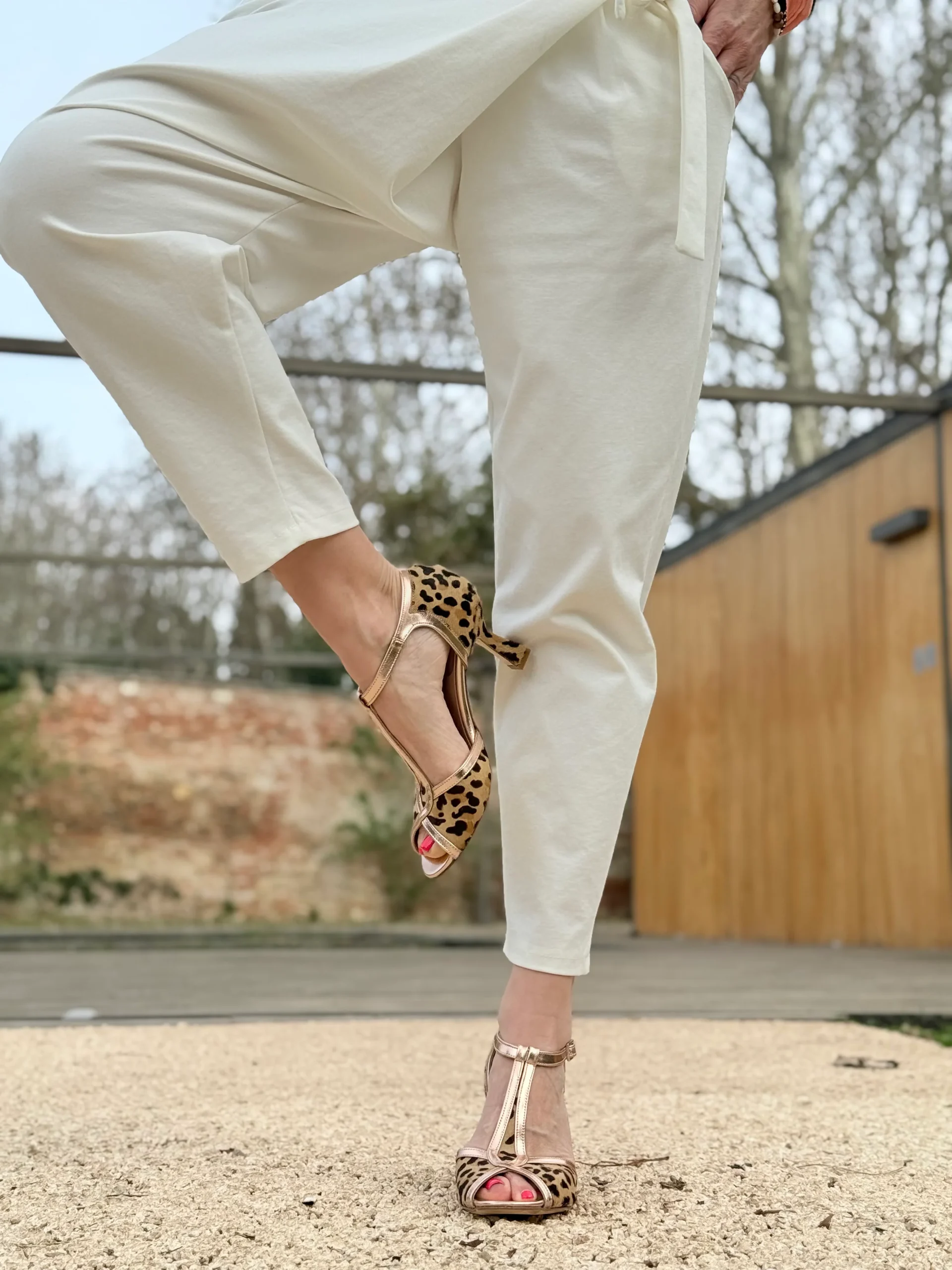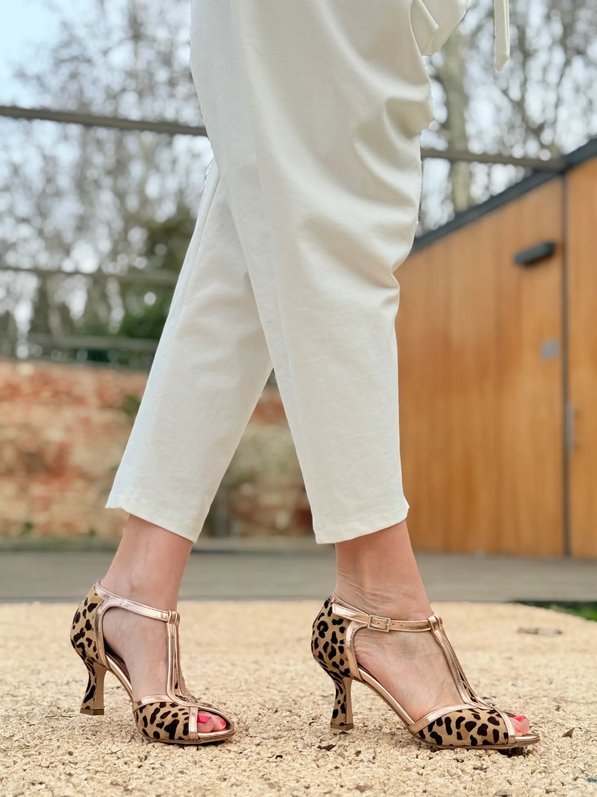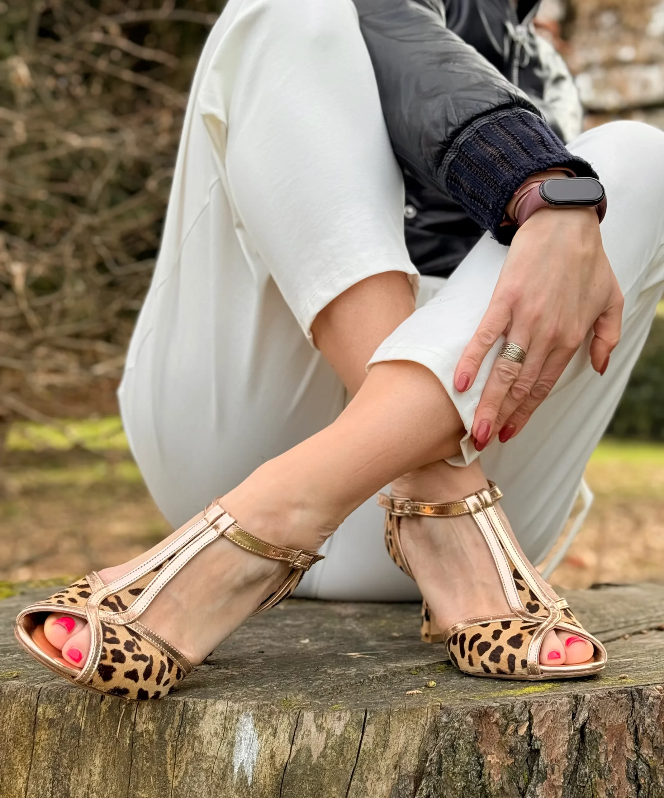 La tomaia in prezioso cavallino maculato si abbina ai profili e al cinturino in pelle laminata cipria, per un equilibrio perfetto tra stile e luminosità .