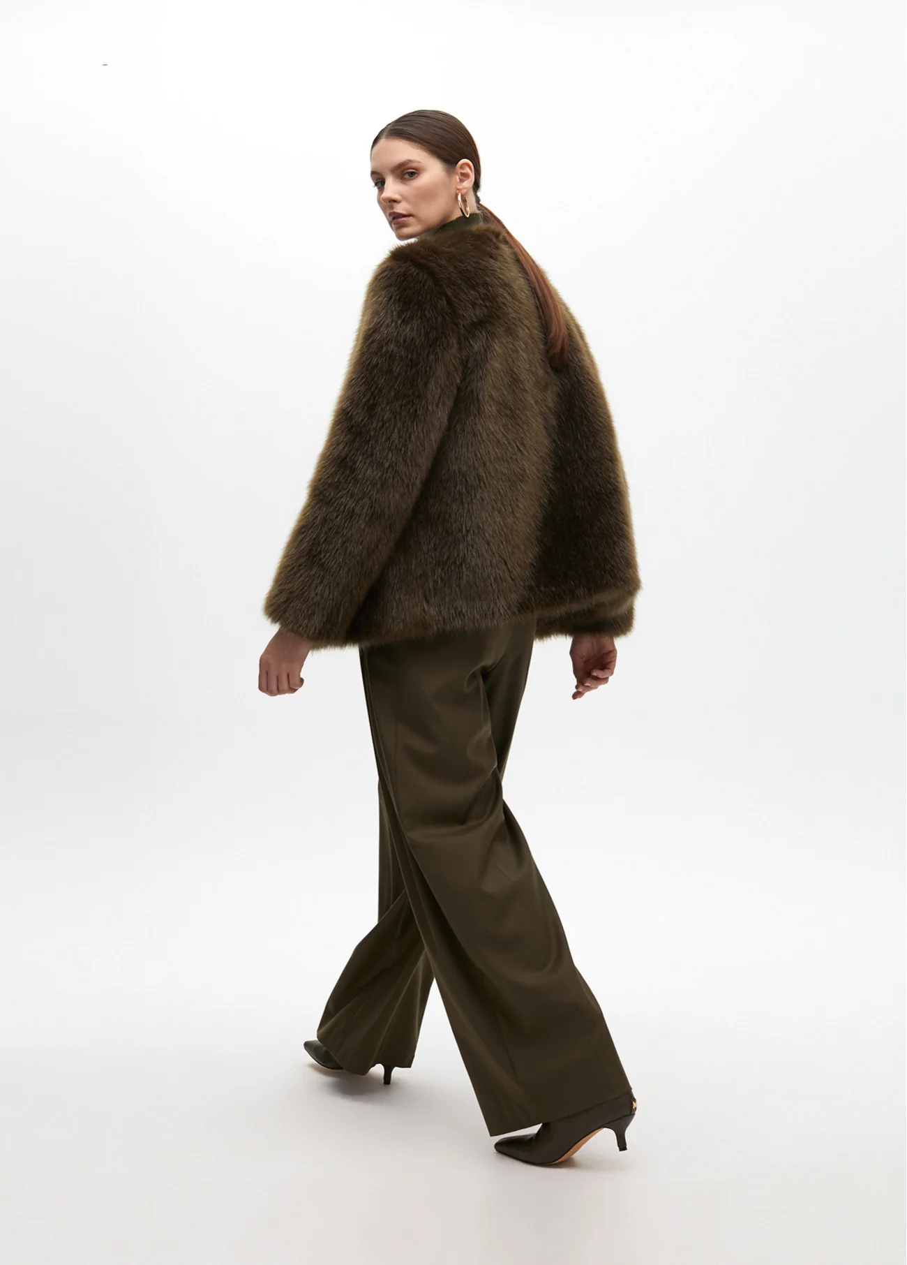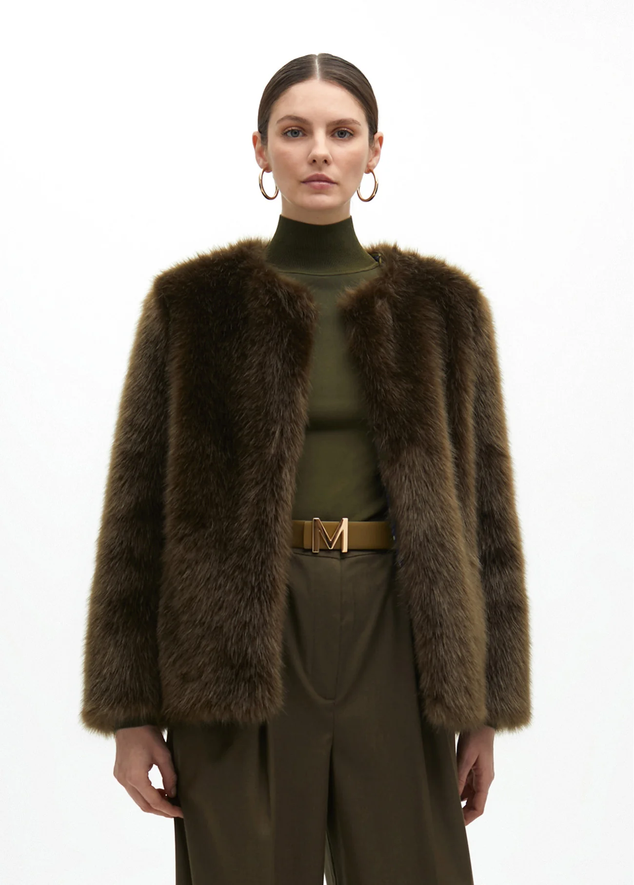 Elegante cappotto realizzato in materiale sintetico di alta qualità che imita la pelliccia naturale. Design dritto con collo rotondo per la versatilità . Fodera interna stampata e chiusura frontale nascosta.