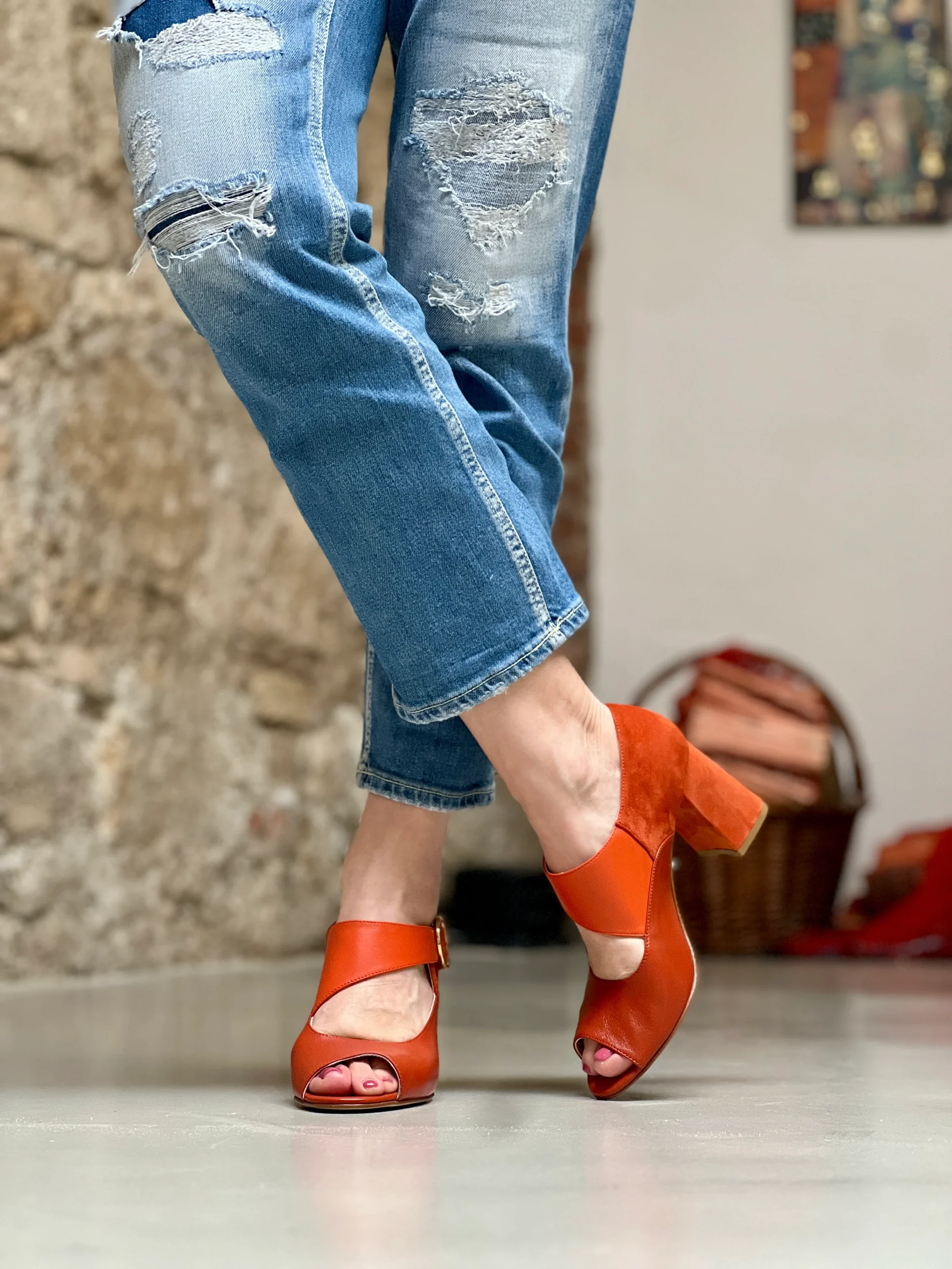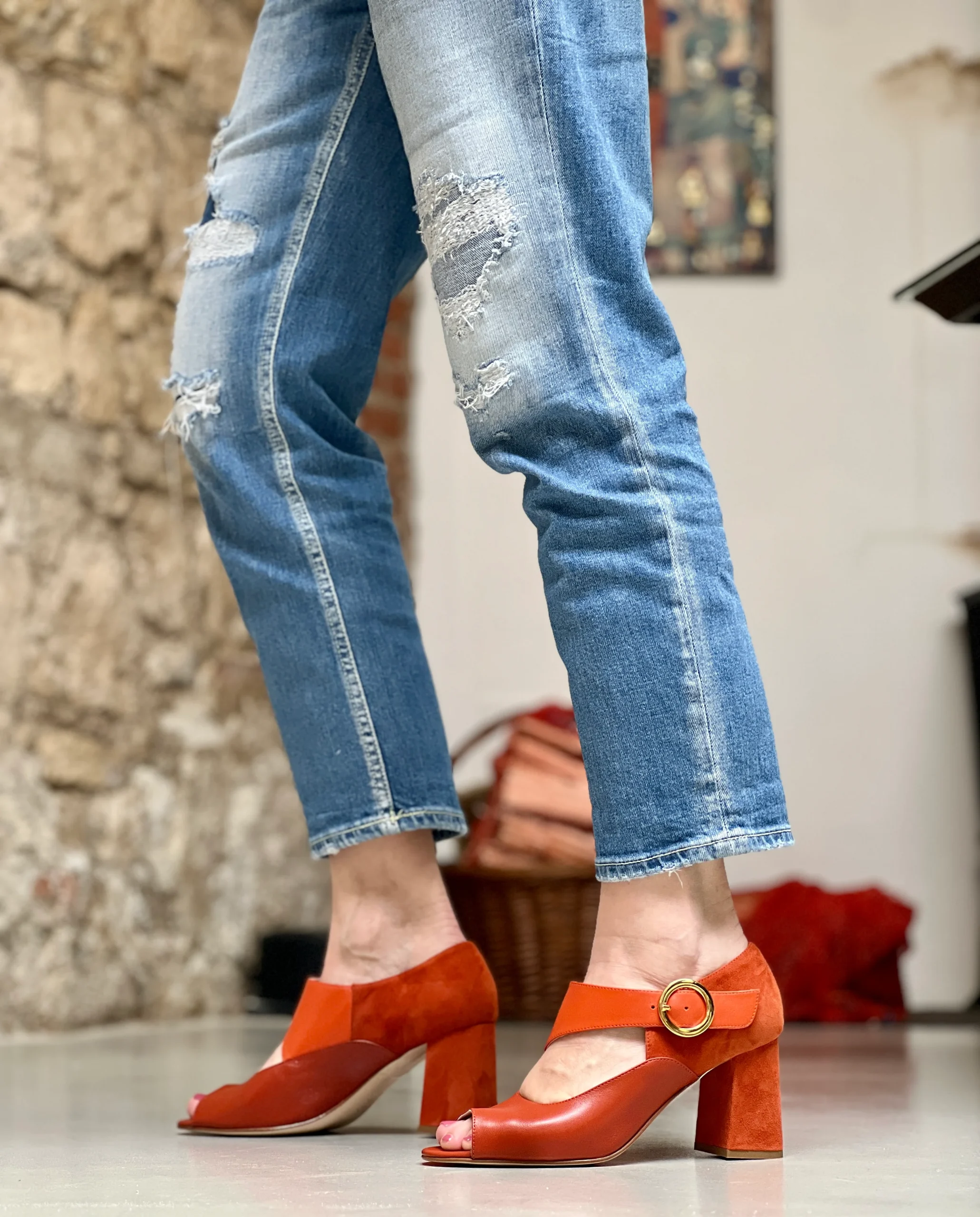 Il suo colore ruggine, caldo e avvolgente, si esprime attraverso un raffinato mix di pelle liscia e camoscio, creando un gioco di texture che dona profondità e ricercatezza al design.