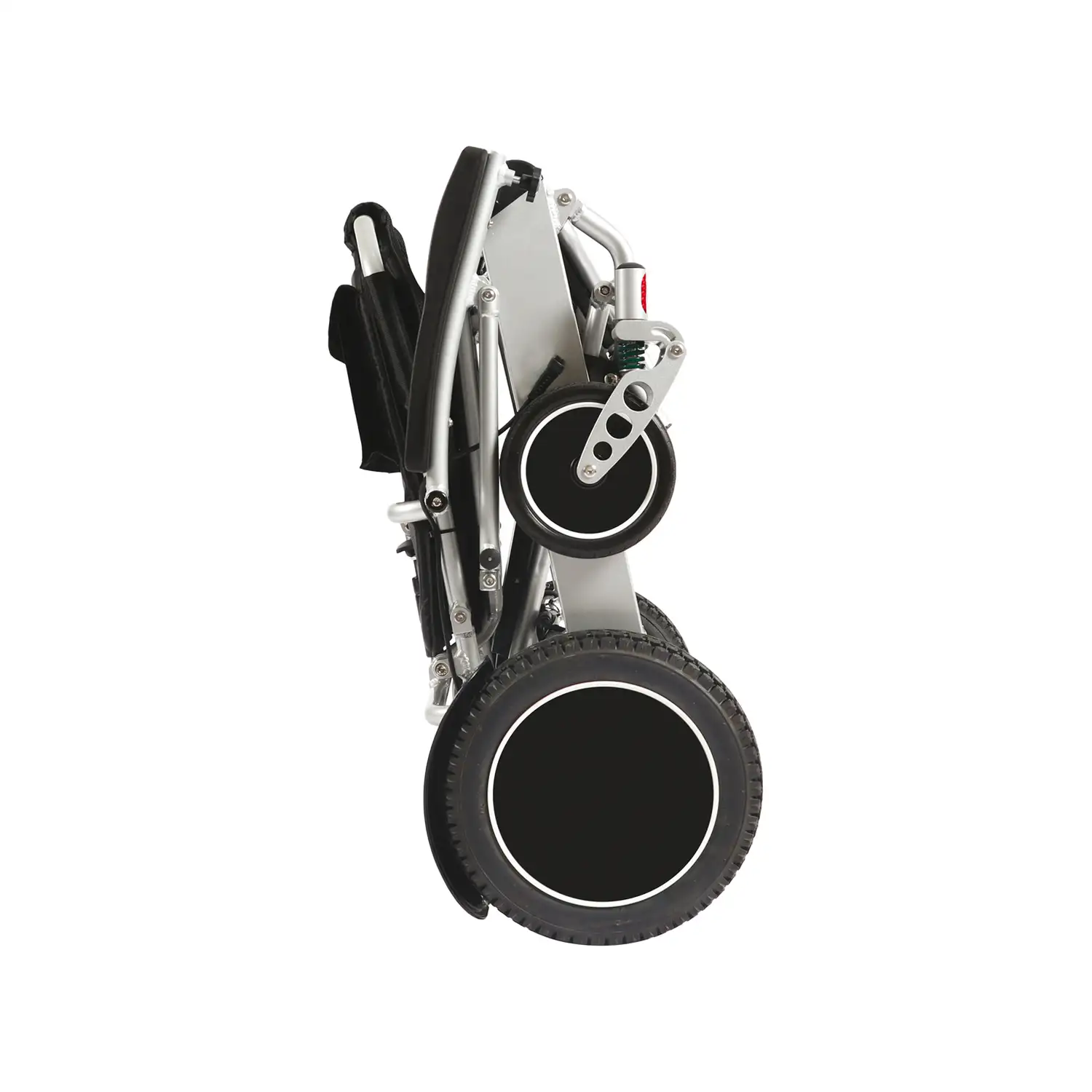 - Telaio in alluminio pieghevole: La struttura leggera e pieghevole rende la carrozzina facile da trasportare e riporre.