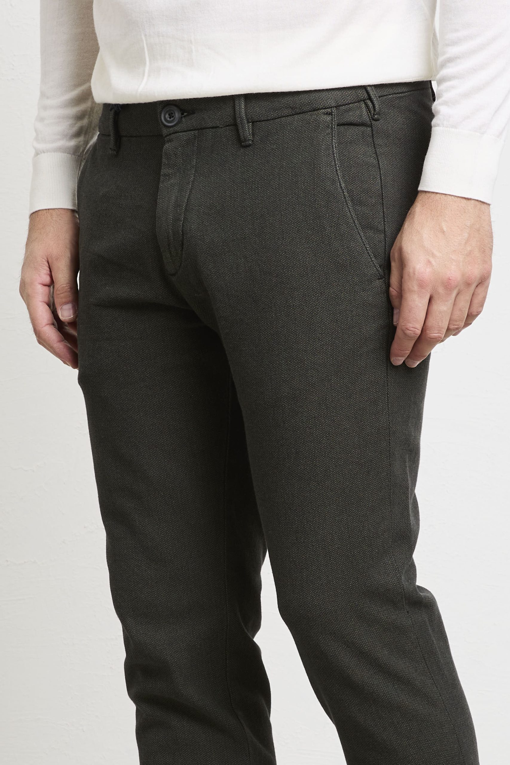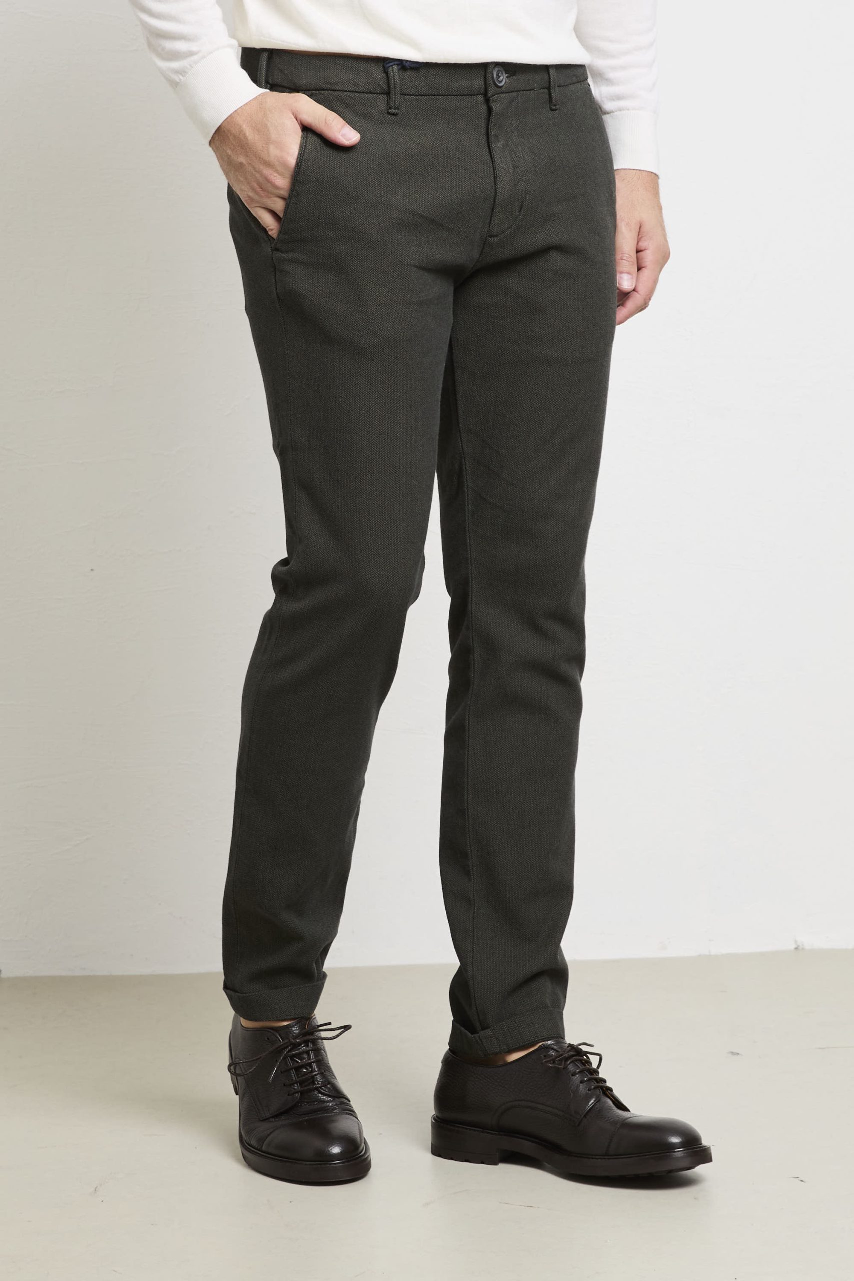 Pantalone Mark: un chino elegante e versatile in verde con microfantasia bicolore, perfetto per chi cerca stile contemporaneo e comfort quotidiano. La linea regolare e il tessuto stretch lo rendono ideale per outfit smart‑casual: abbinalo a camicia in lino bianca e blazer blu navy con mocassini in pelle per un look office‑ready, oppure a maglione color crema e sneakers minimal per un weekend urbano raffinato.