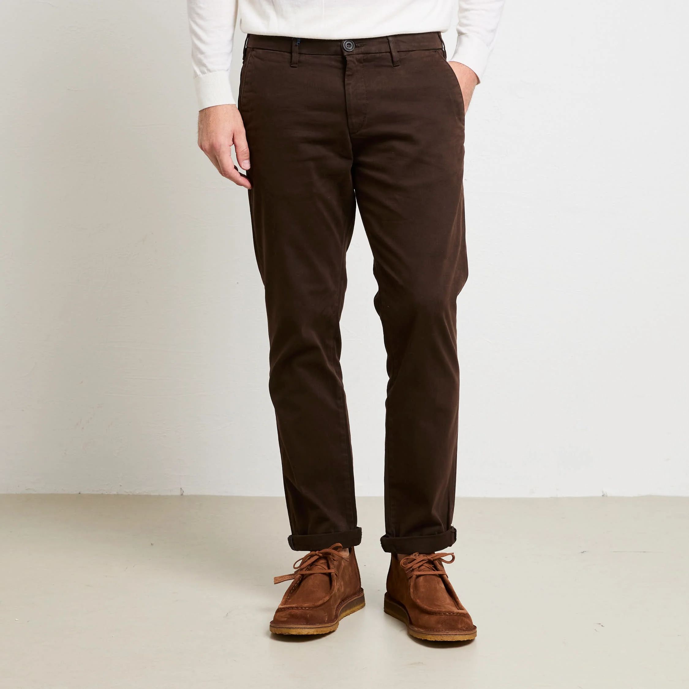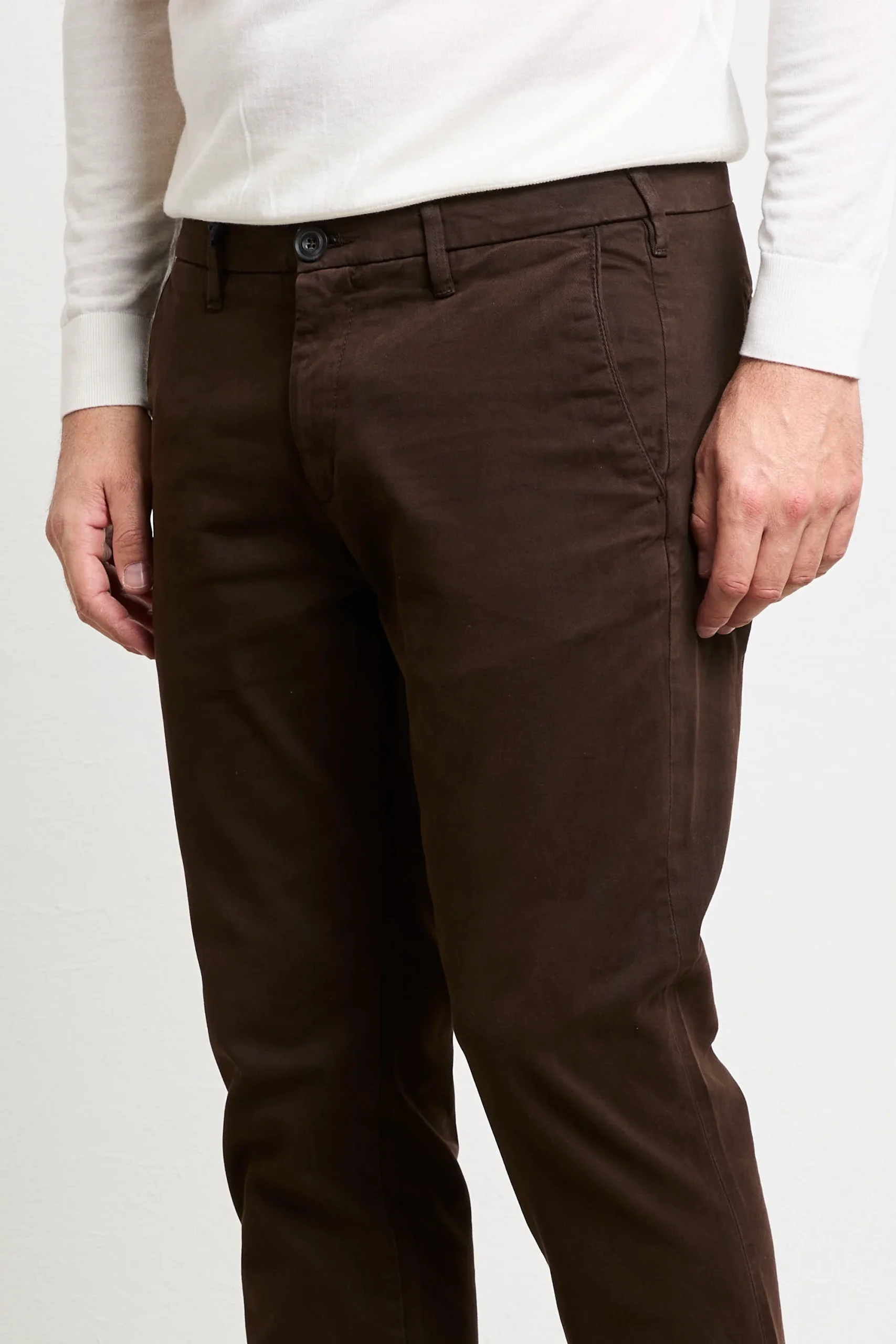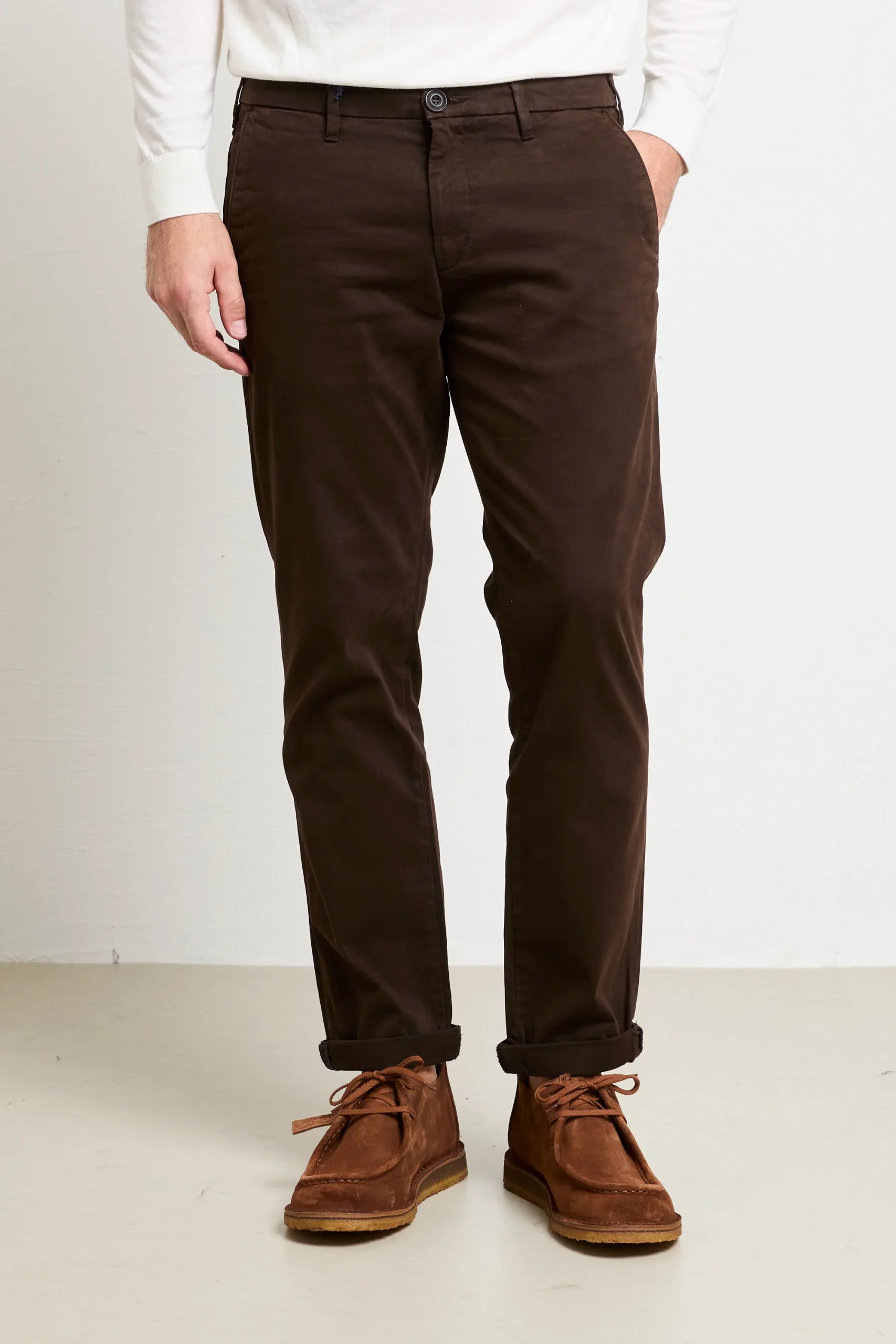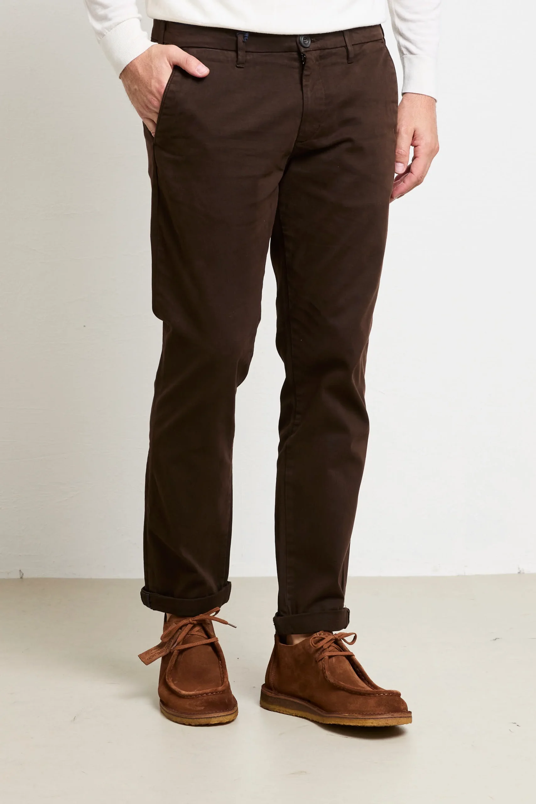 Pantalone Mark: un chino elegante in gabardina marrone, con logo in evidenza, perfetto per chi cerca stile contemporaneo e comfort quotidiano. La linea regolare e il tessuto stretch lo rendono ideale per outfit smart‑casual: abbinalo a camicia chiara e blazer blu scuro con mocassini in pelle per un look office‑ready, oppure a dolcevita e stivaletti in pelle per un weekend urbano sofisticato.