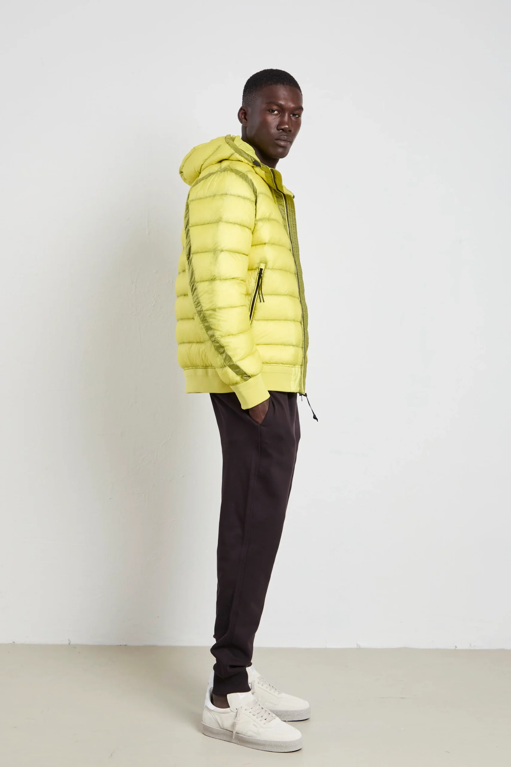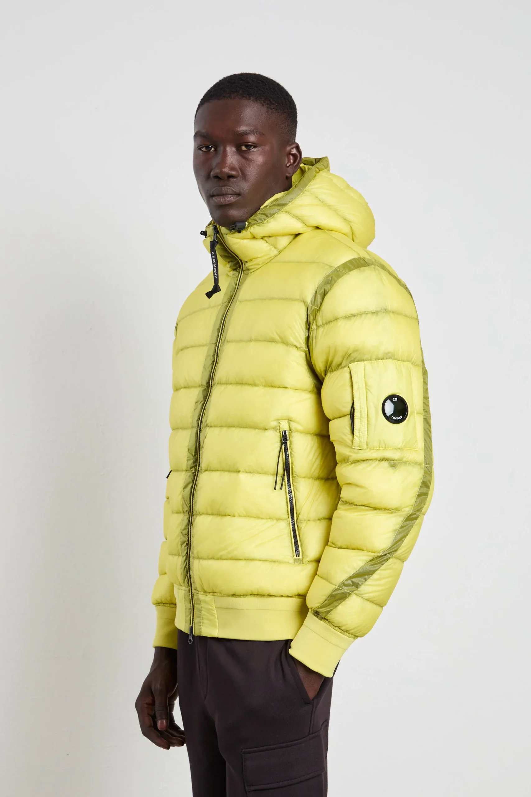 Il giallo di questo giubbotto C.P. Company è un’esplosione di colore e stile urbano. Realizzato in D.D. Shell, un nylon micro-ripstop leggero e resistente, con imbottitura in piuma per garantire calore, il cappuccio regolabile e le tasche laterali con zip aggiungono praticità . Perfetto abbinato a jeans neri e sneakers bianche per un look urbano, oppure con pantaloni cargo beige e stivaletti in pelle per un outfit tecnico e contemporaneo.