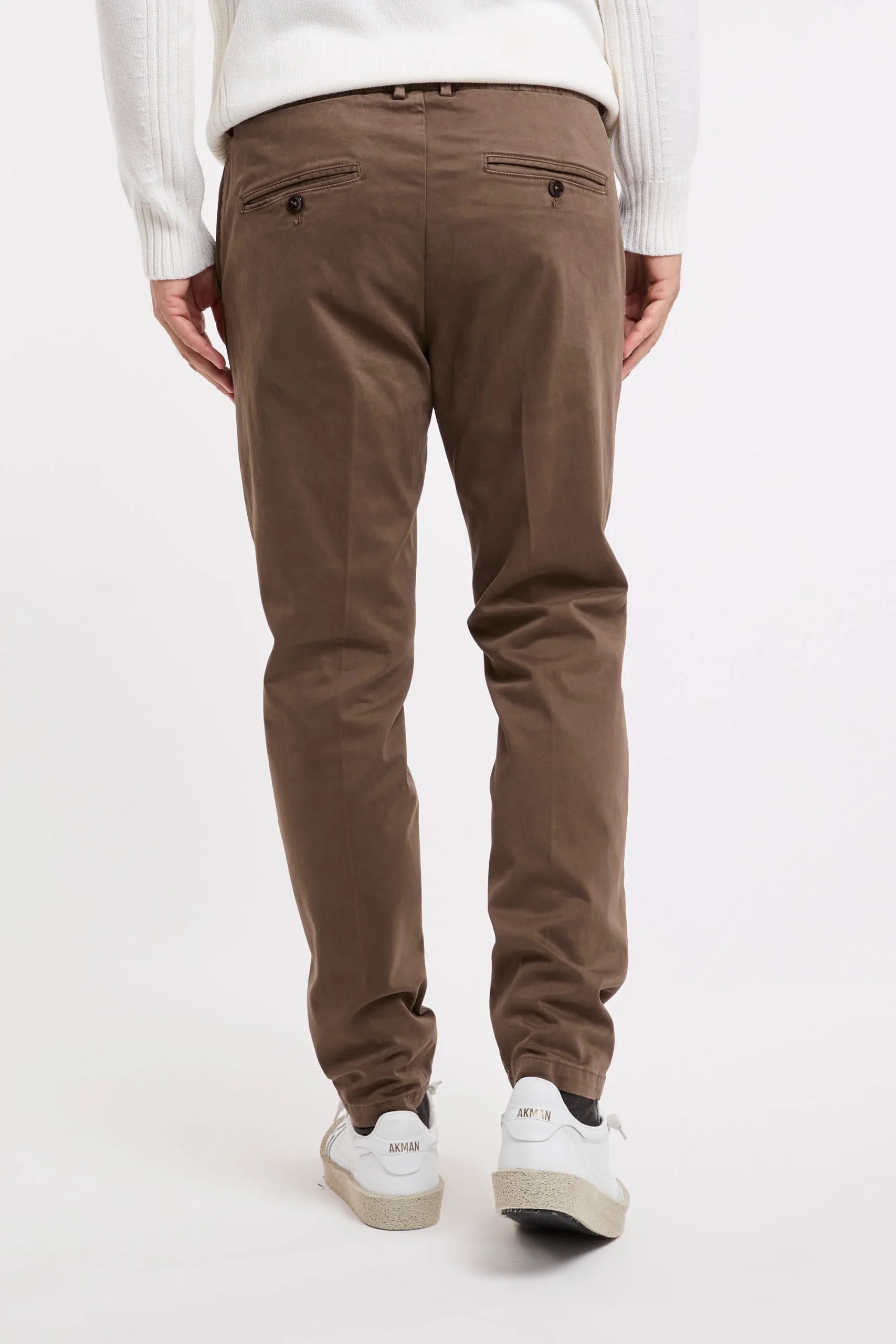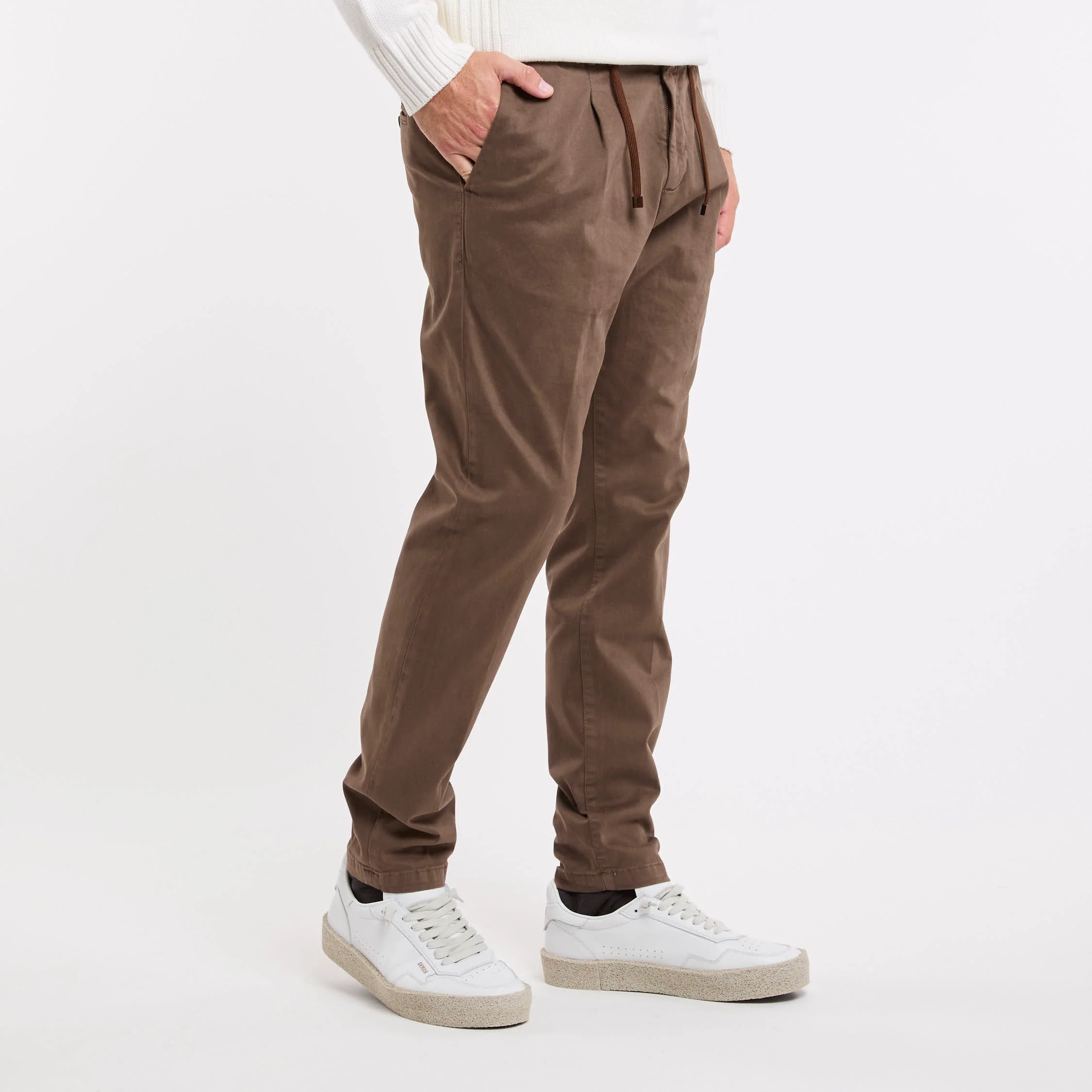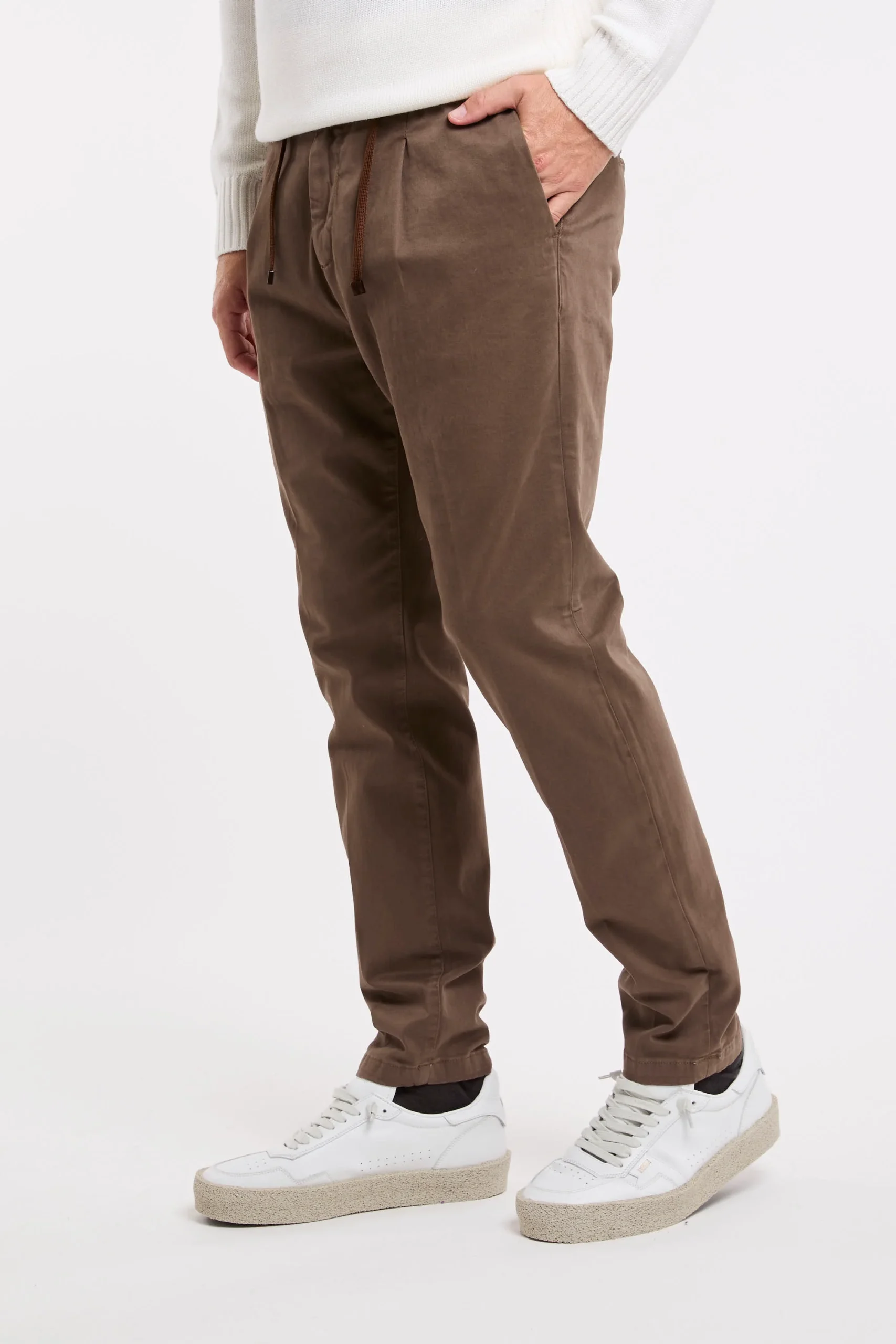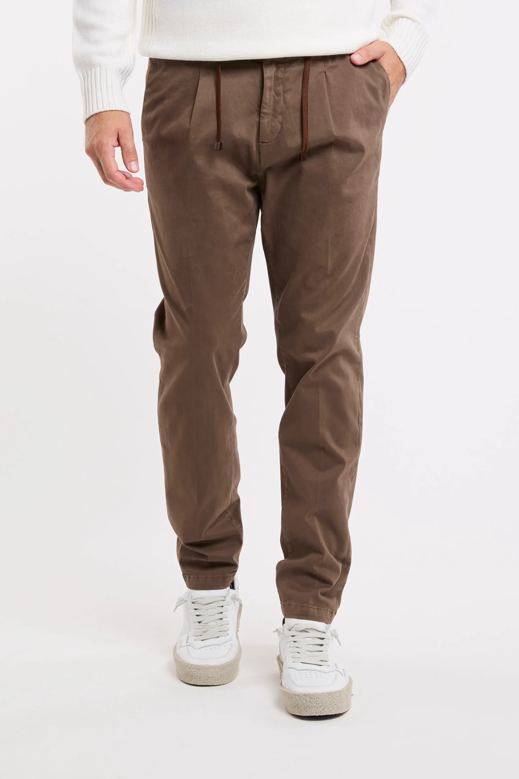 Pantalone in cotone; Chiusura con zip e bottone; Elastico in vita con la coulisse regolabile; Pence; Doppia tasca laterale e tasche posteriori e bottone; Taglio morbido con gambe affusolate che si ristringe sul fondo; Passanti per cintura in vita; Logo in evidenza; Made in Italy; Composizione: 97% Cotone, 3% Elastan; Larghezza fondo: 17,5 cm