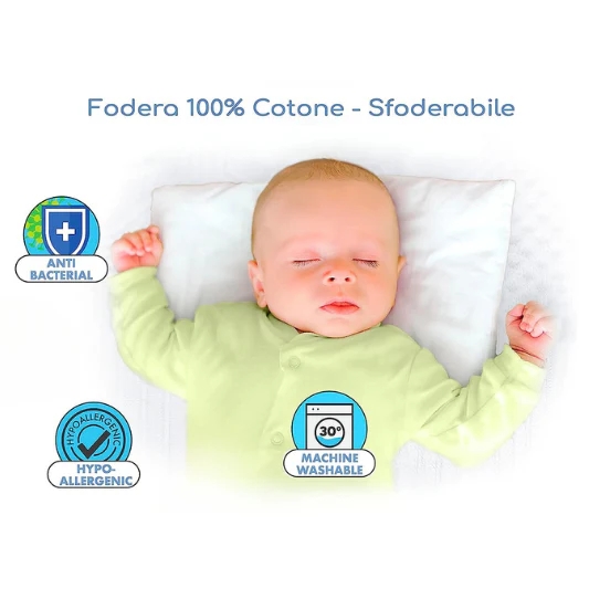 Il rivestimento in cotone 100% cotone sanitizzato, anallergico e antibatterico assicura un ambiente pulito e salubre per il tuo piccolo. Inoltre, il cuscino è lavabile in lavatrice, facilitando la pulizia e l’igiene.