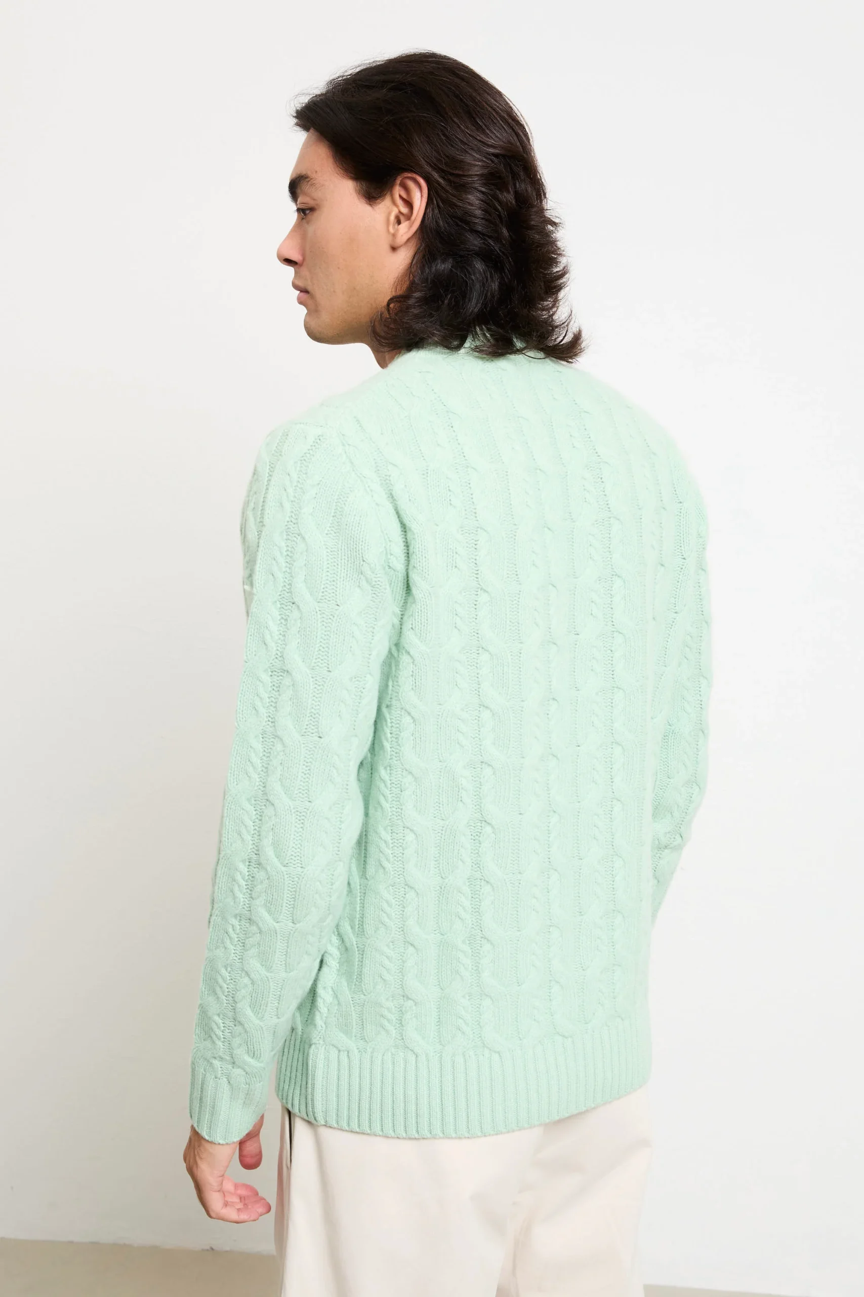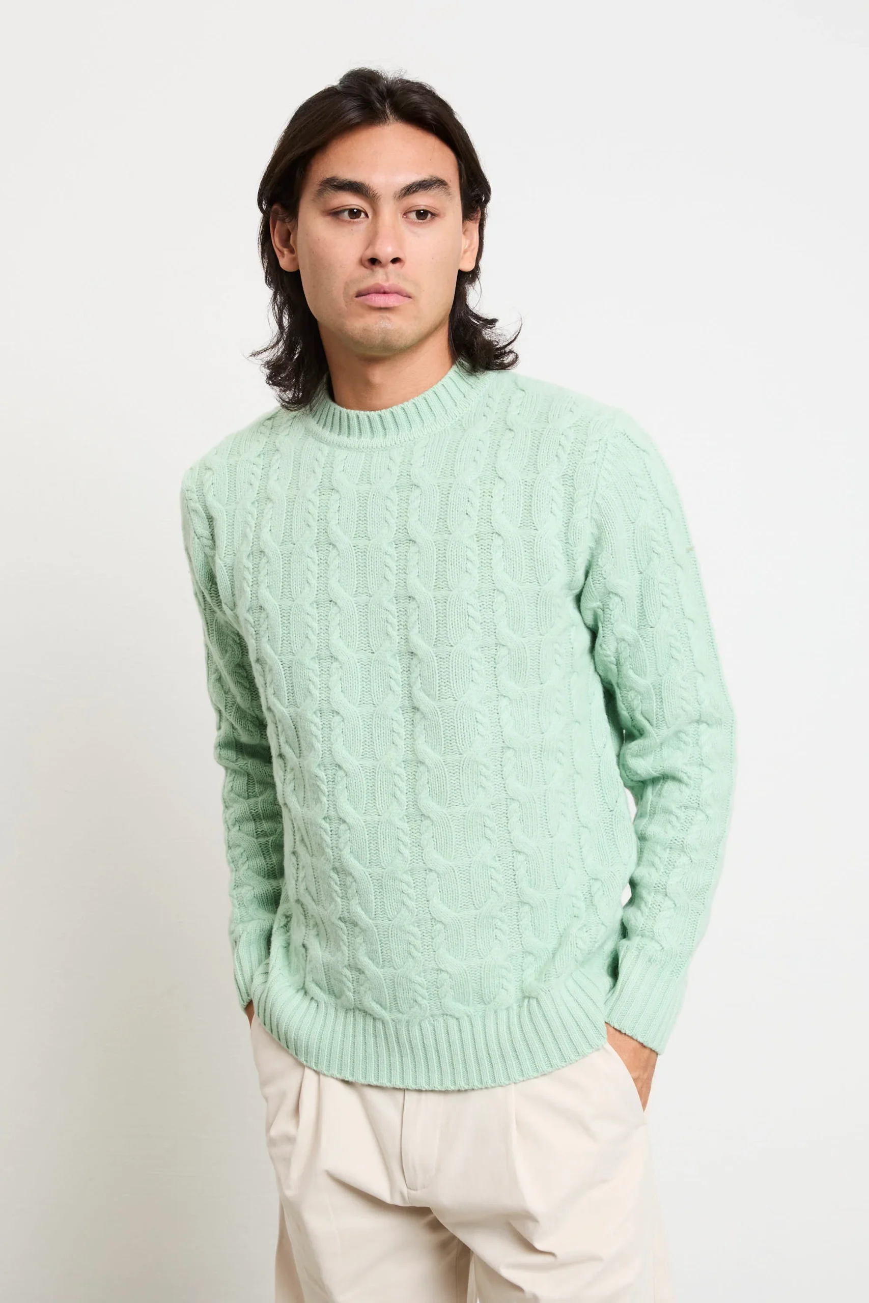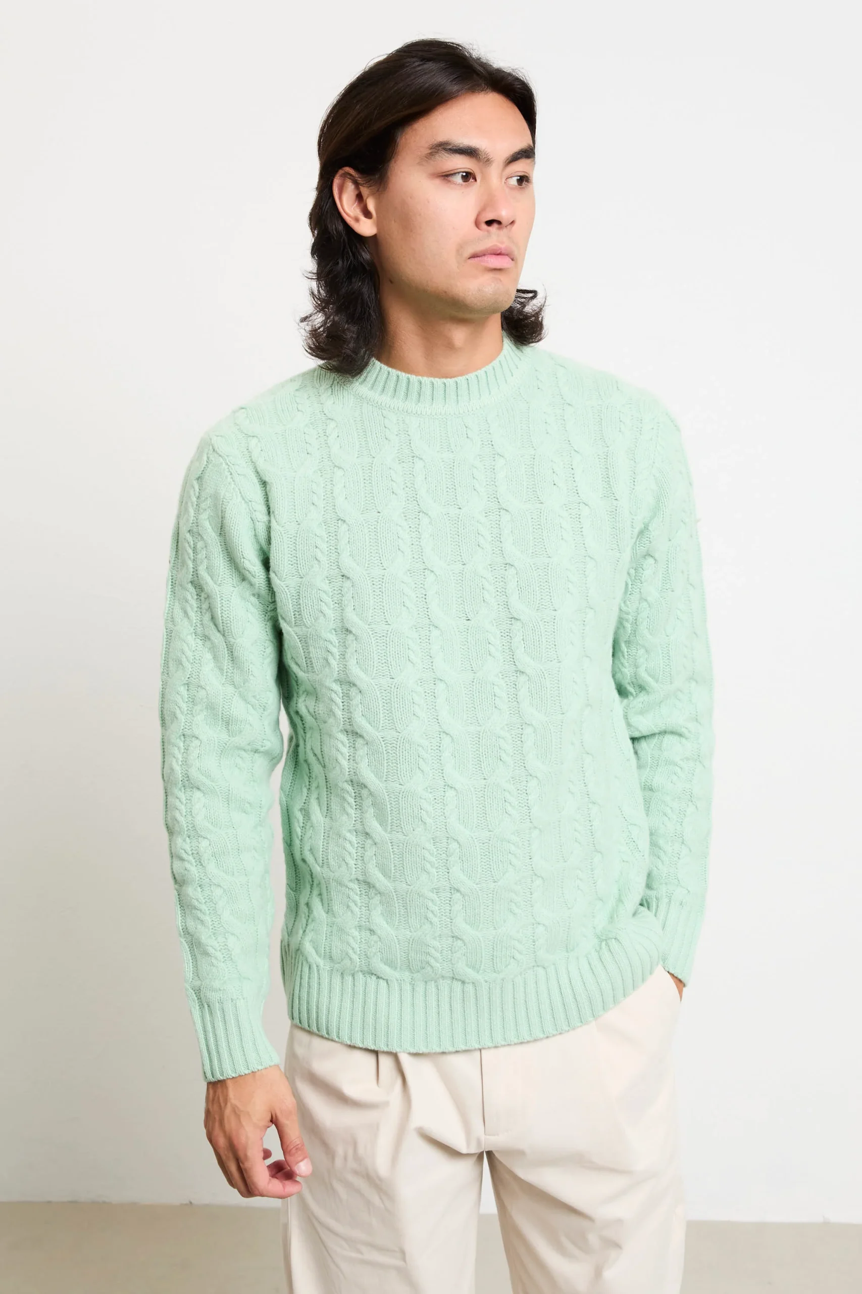 Un maglione paricollo che fonde artigianalità e stile contemporaneo: il colore “germogli” illumina la lavorazione a trecce in lana merino. Ideale con pantaloni in cotone beige e mocassini in pelle per un look raffinato, oppure con jeans scuri e stivaletti per un outfit casual-chic dal carattere deciso. Perfetto per chi cerca stile senza rinunciare al comfort.
