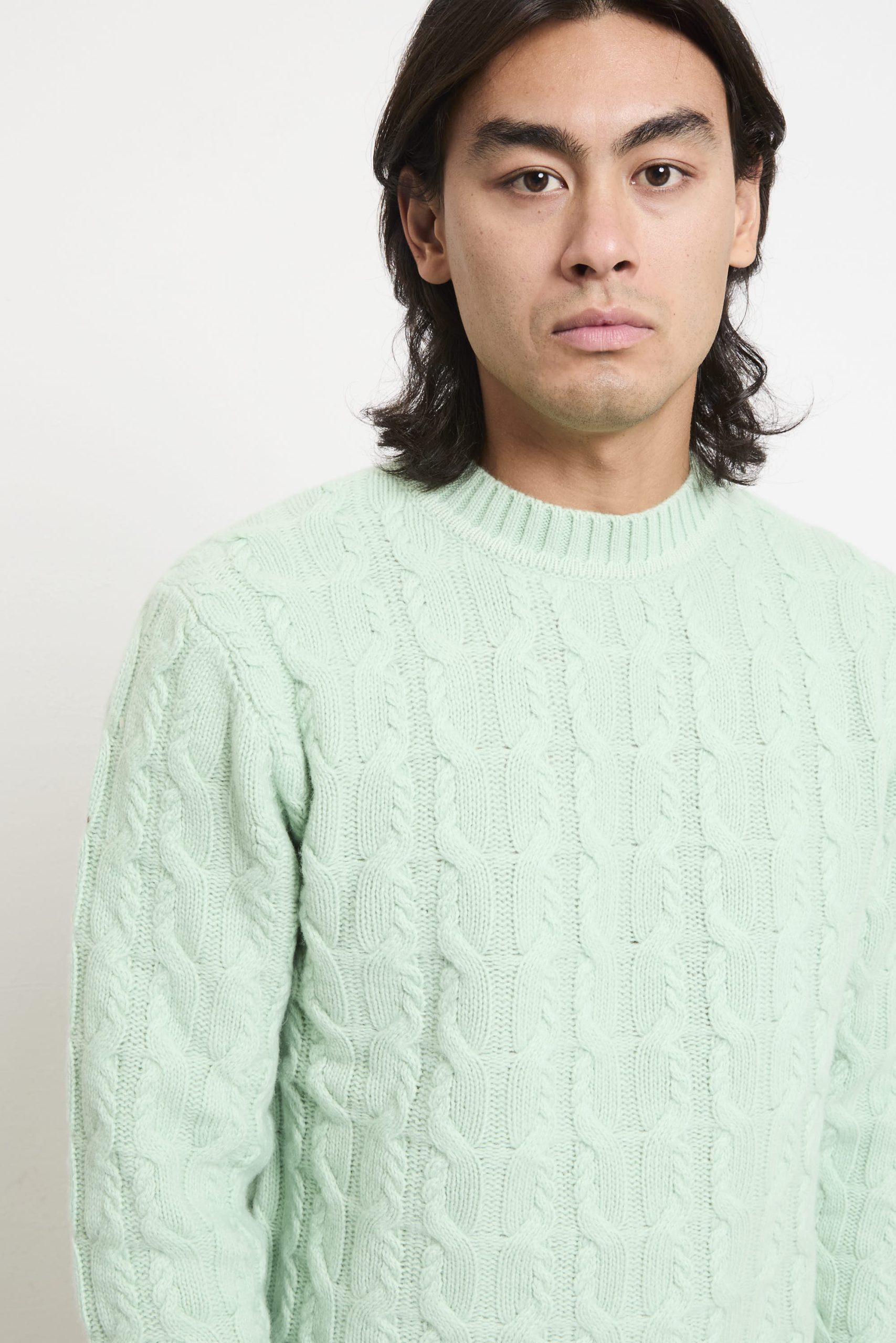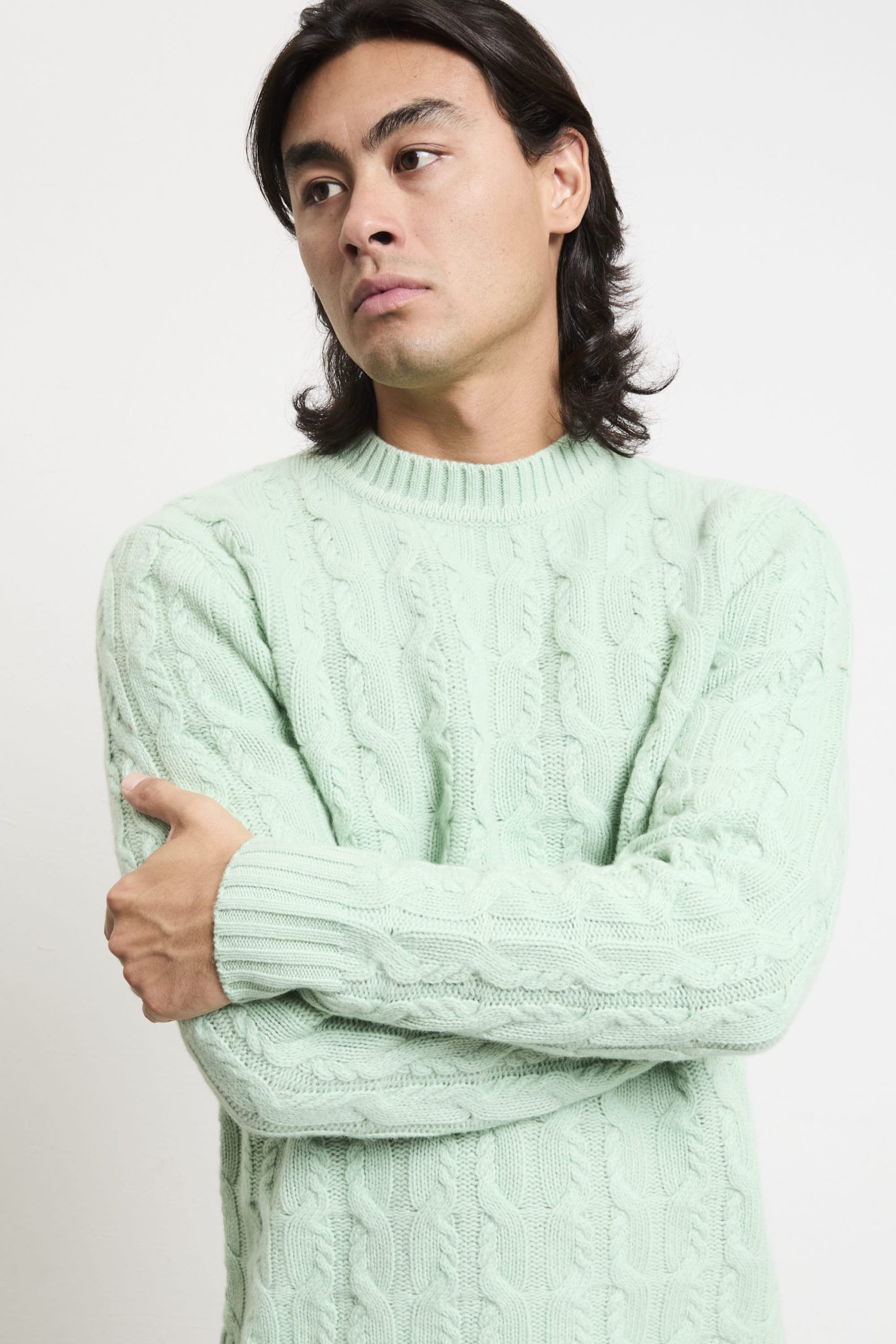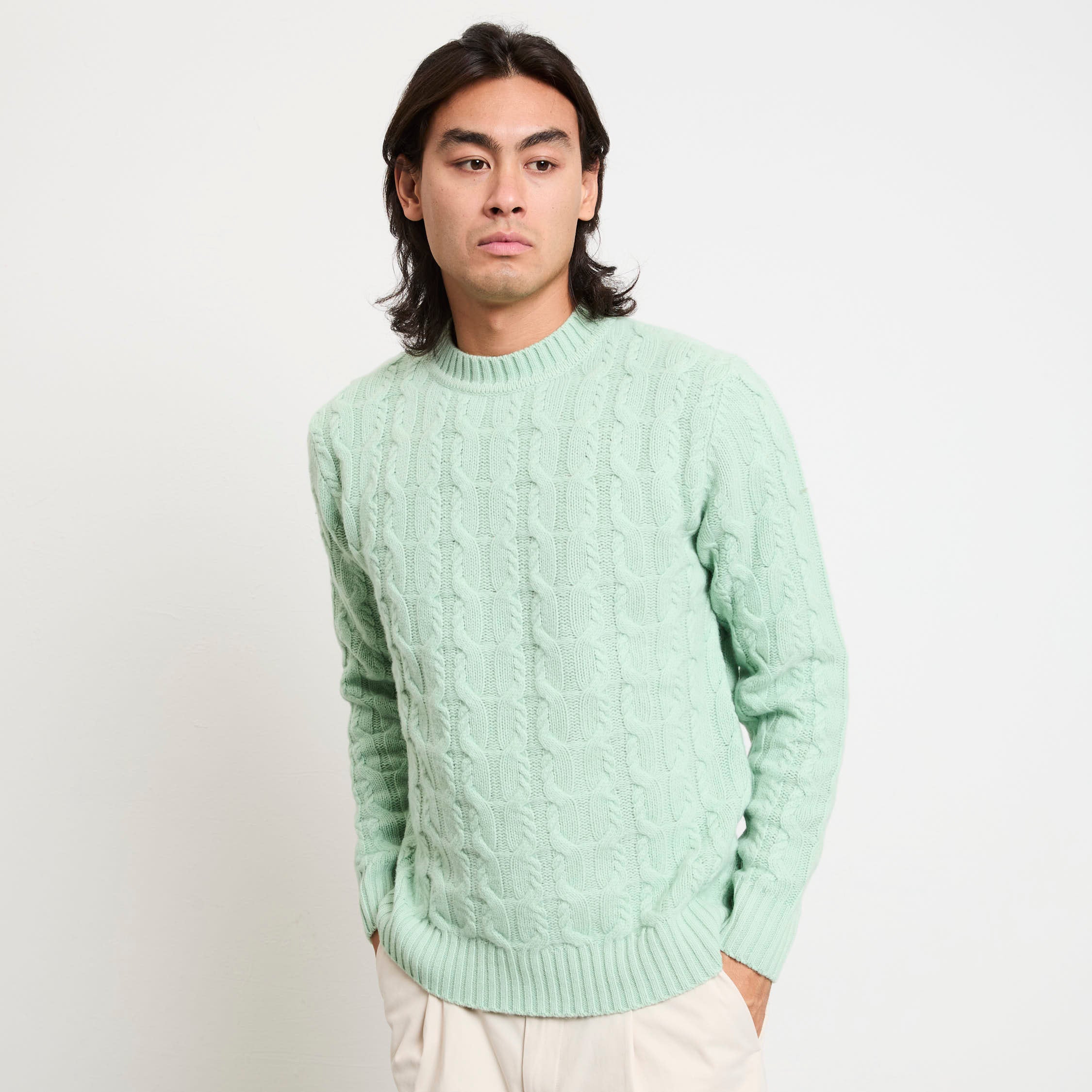 Un maglione paricollo che fonde artigianalità e stile contemporaneo: il colore “germogli” illumina la lavorazione a trecce in lana merino. Ideale con pantaloni in cotone beige e mocassini in pelle per un look raffinato, oppure con jeans scuri e stivaletti per un outfit casual-chic dal carattere deciso. Perfetto per chi cerca stile senza rinunciare al comfort.