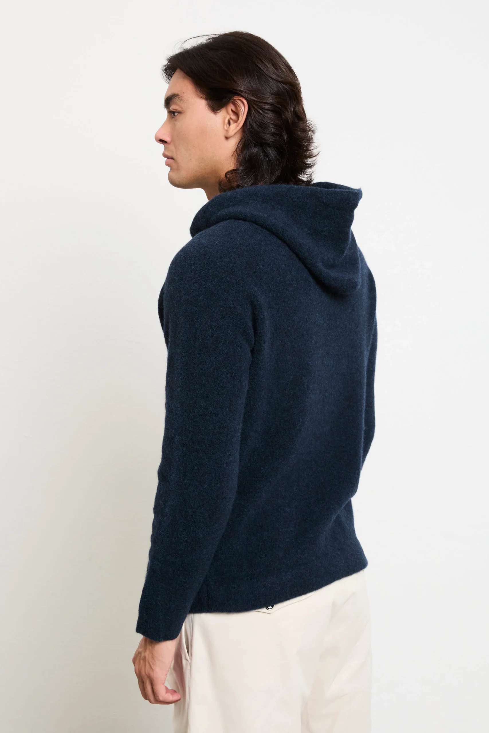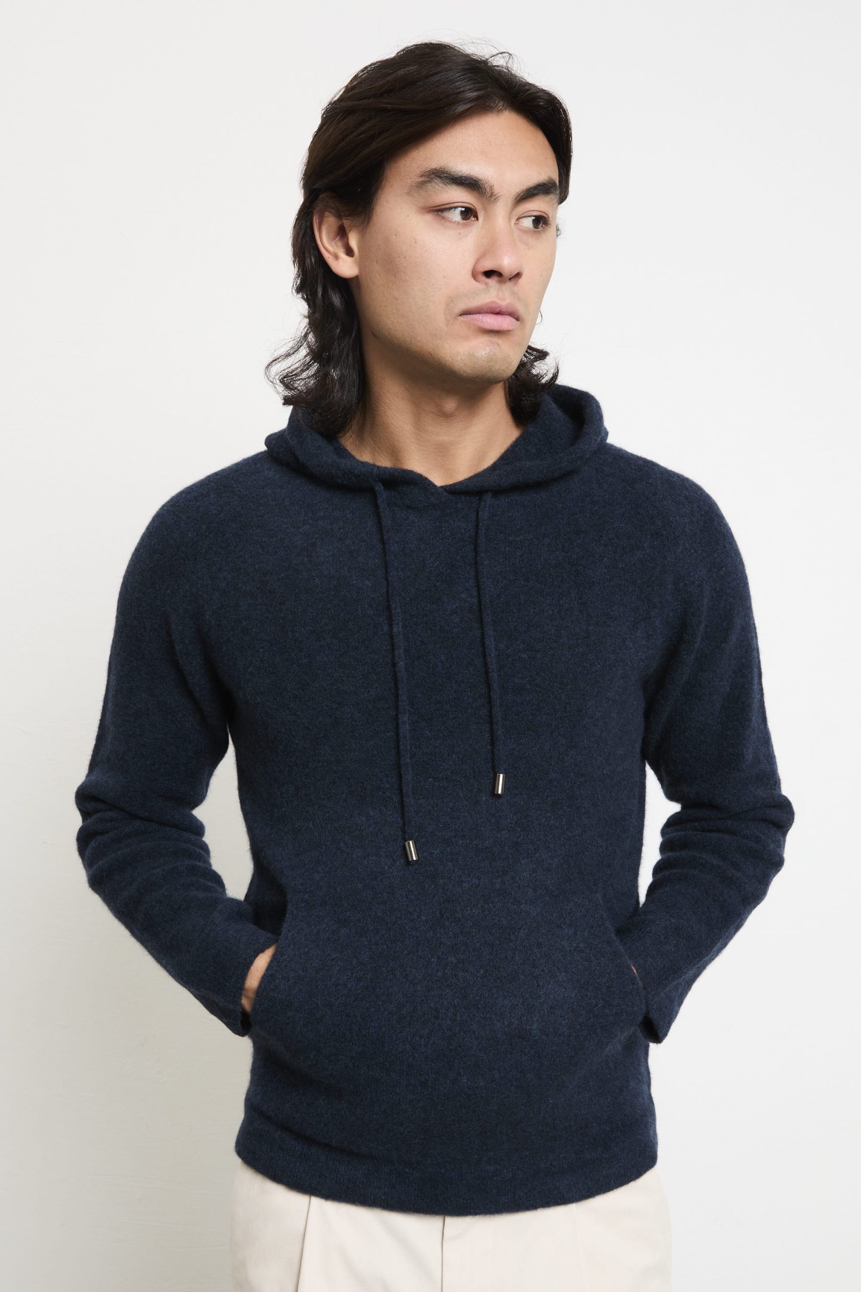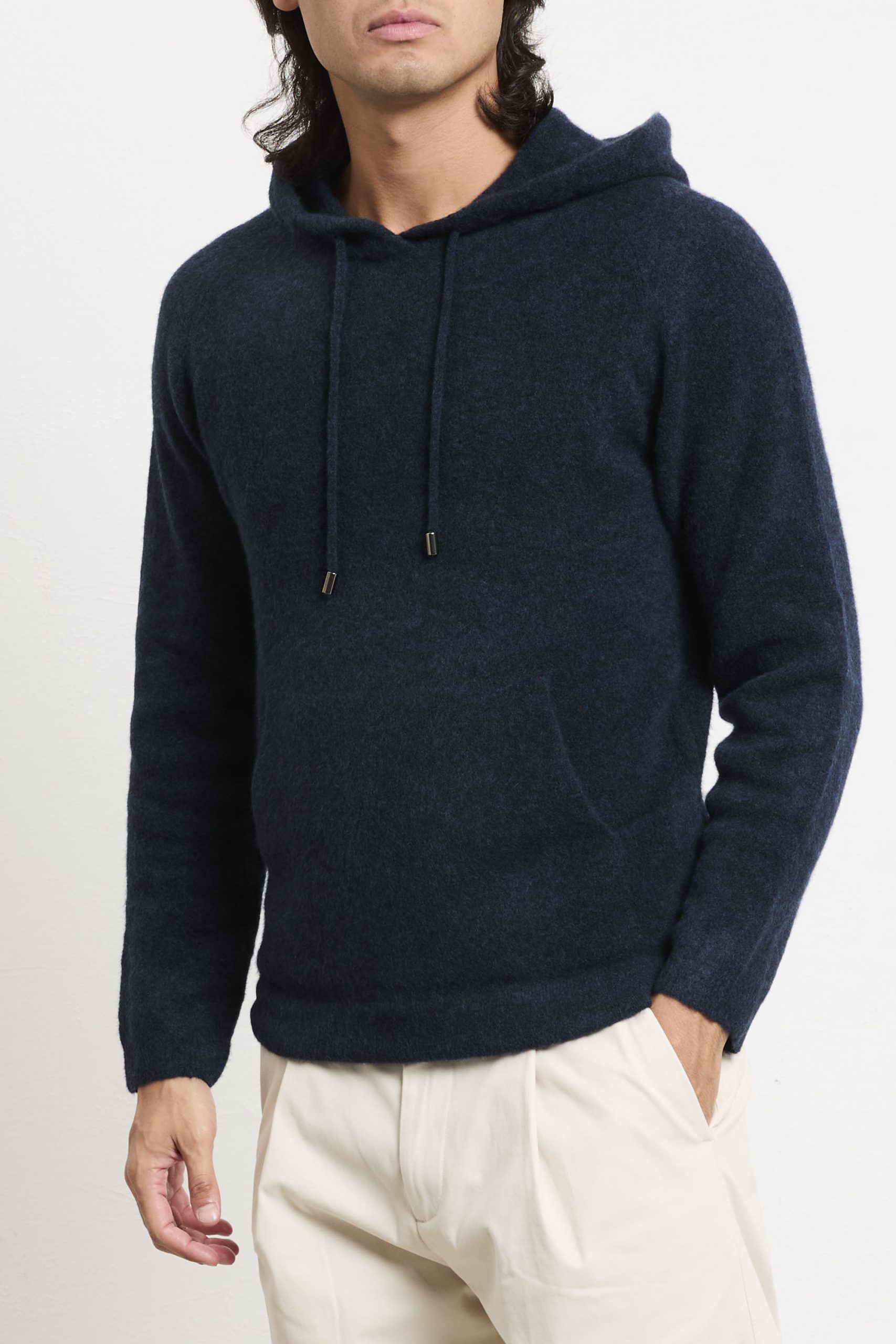Una felpa con cappuccio che combina stile sofisticato e comfort quotidiano: il tono intenso “blue” valorizza la morbidezza della lana merino extrafine, mentre il taglio regolare assicura una calzata naturale e confortevole. Perfetta con chinos chiari e sneakers bianche per un look fresco e moderno, oppure sotto una giacca in pelle scura per un effetto urbano elegante. Un capo versatile, ideale per ogni stagione.