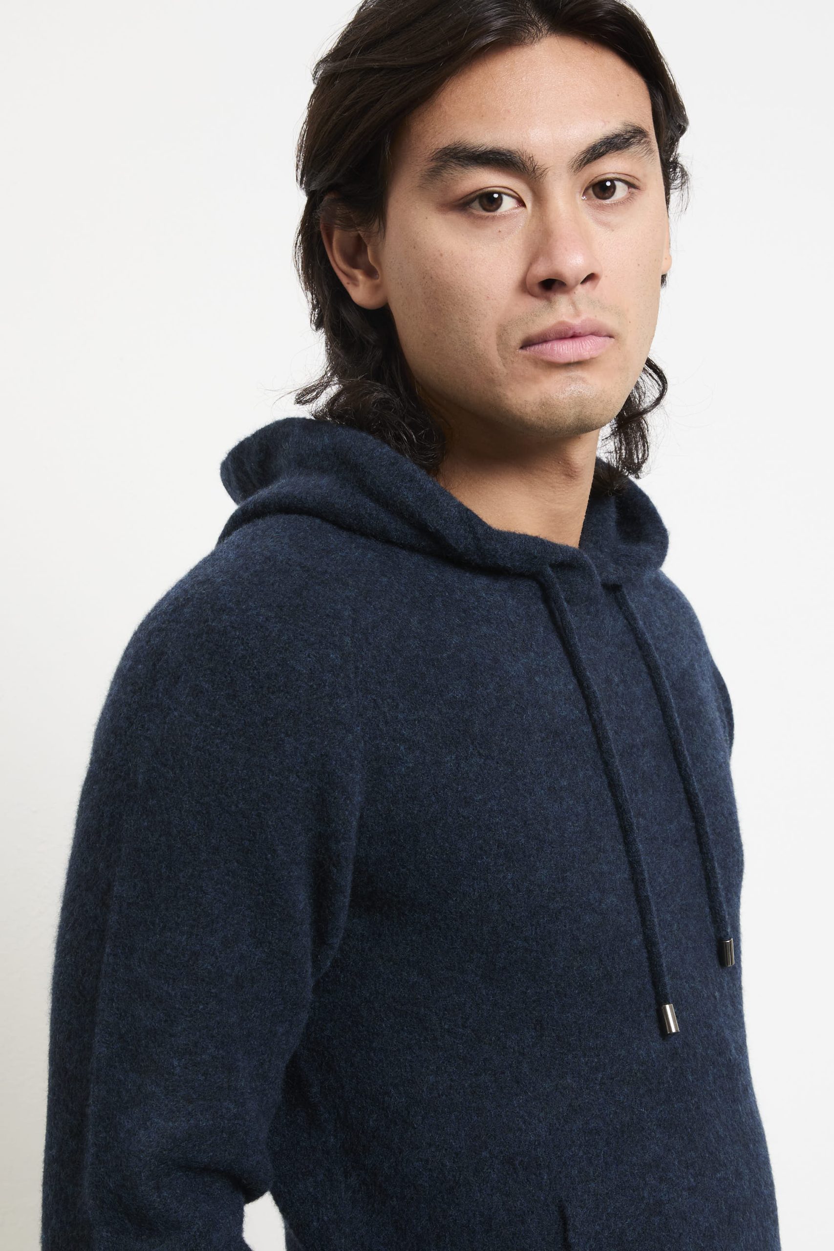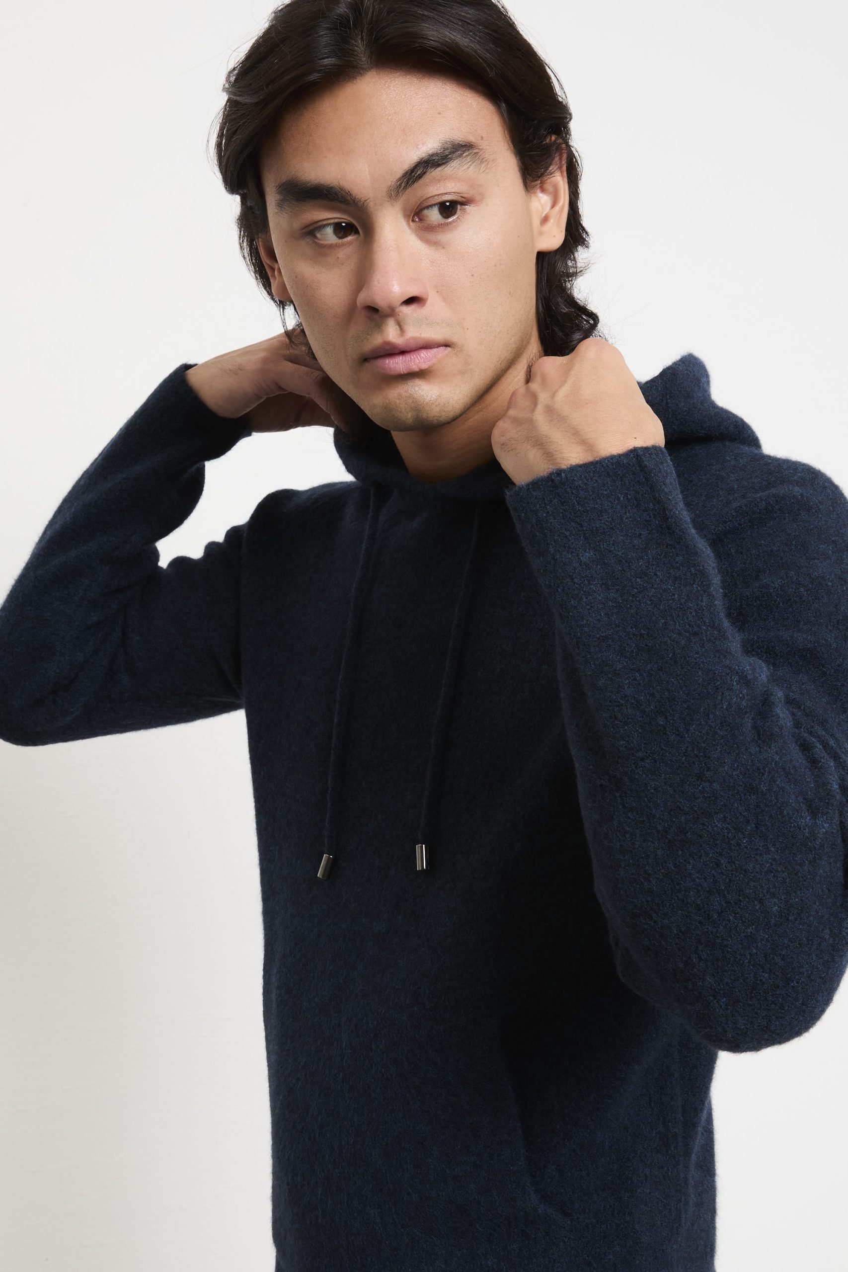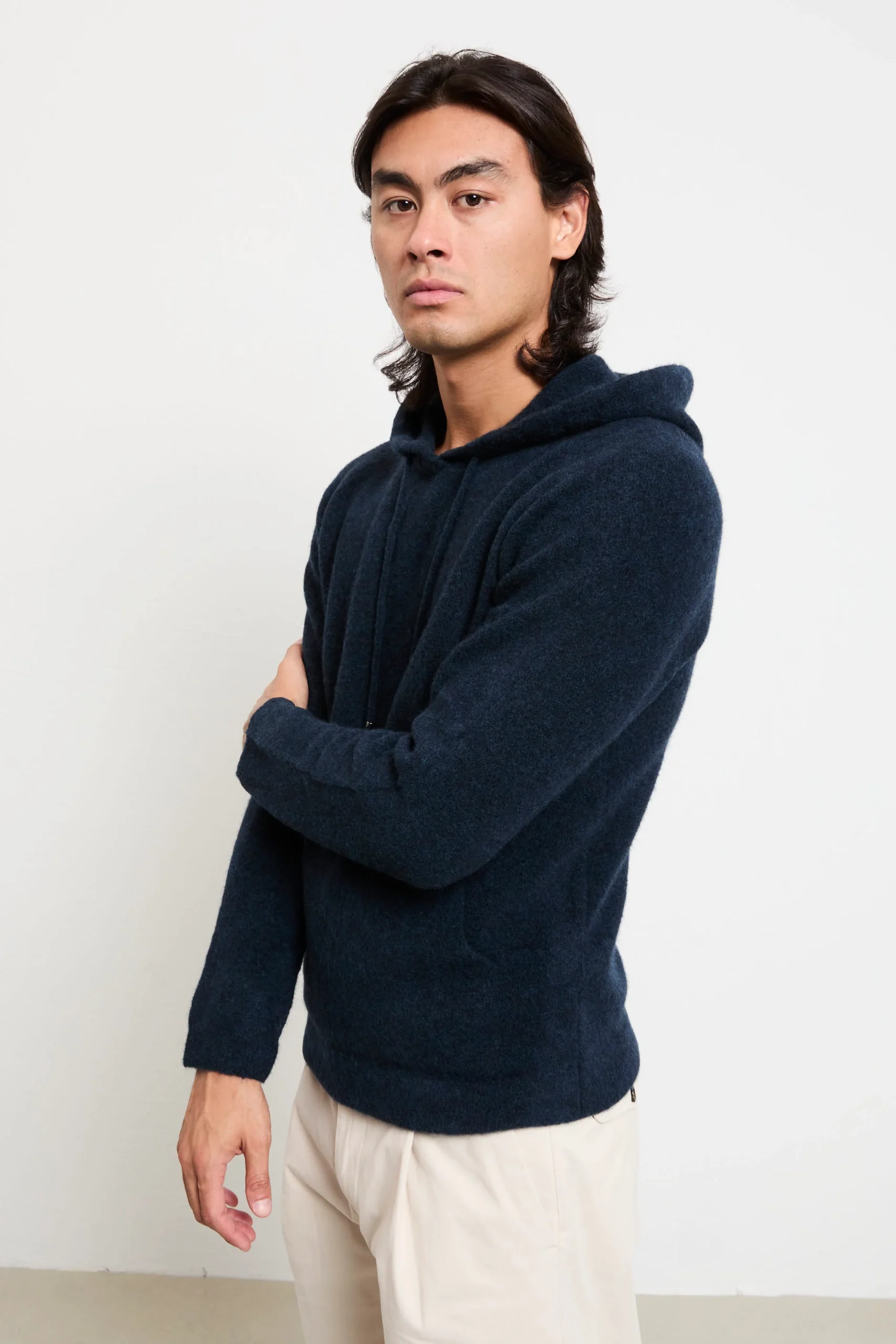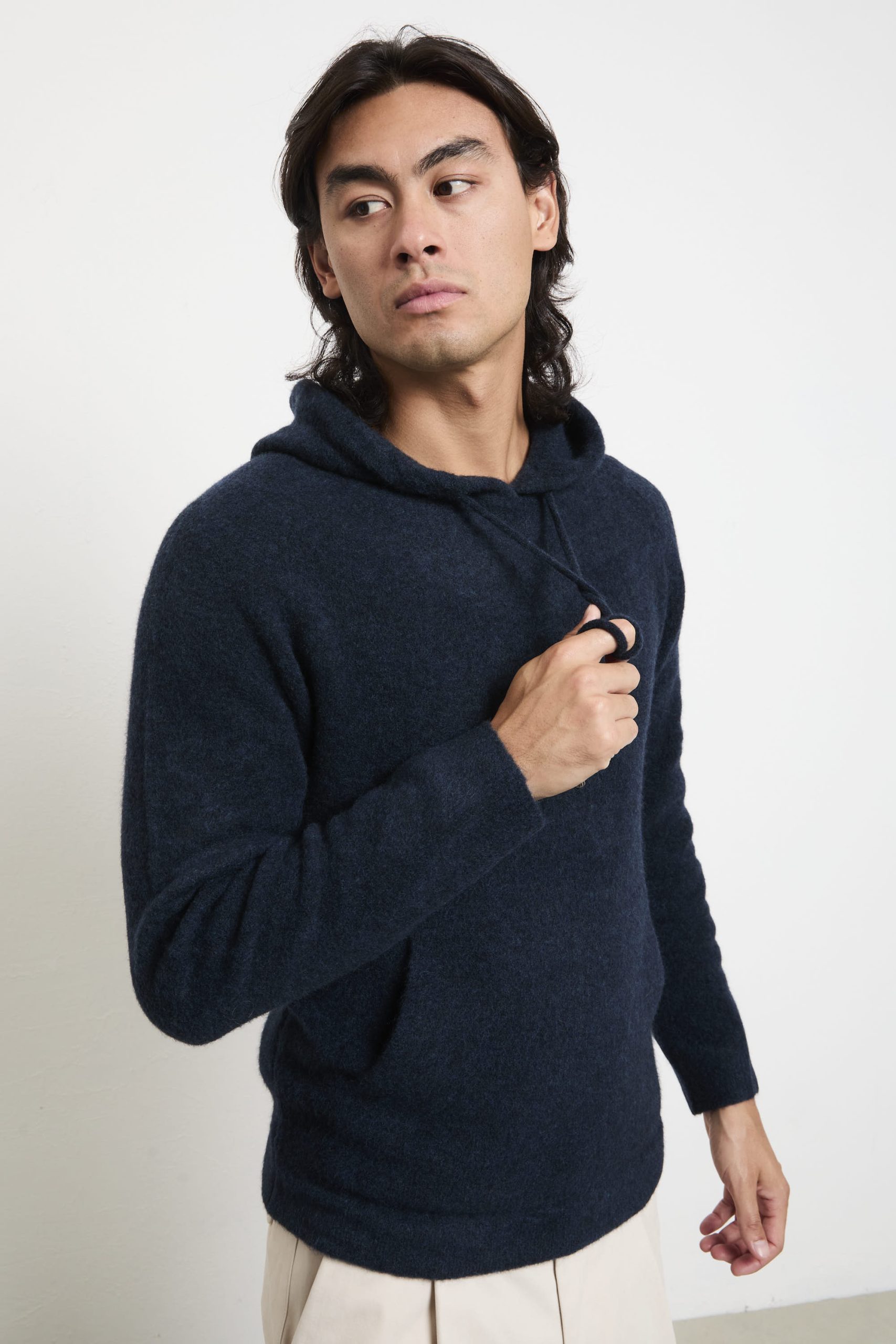 Una felpa con cappuccio che combina stile sofisticato e comfort quotidiano: il tono intenso “blue” valorizza la morbidezza della lana merino extrafine, mentre il taglio regolare assicura una calzata naturale e confortevole. Perfetta con chinos chiari e sneakers bianche per un look fresco e moderno, oppure sotto una giacca in pelle scura per un effetto urbano elegante. Un capo versatile, ideale per ogni stagione.