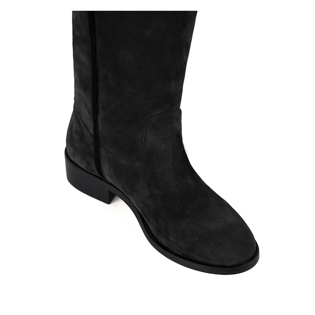 Questi stivali combinano lo stile classico da cavallerizza con la grinta dei cuissardes. Il gambale dritto in pelle segue la forma della gamba senza costringerla. Indossali con un abito in lana morbida o con un abito blazer per un look casual ma di carattere.