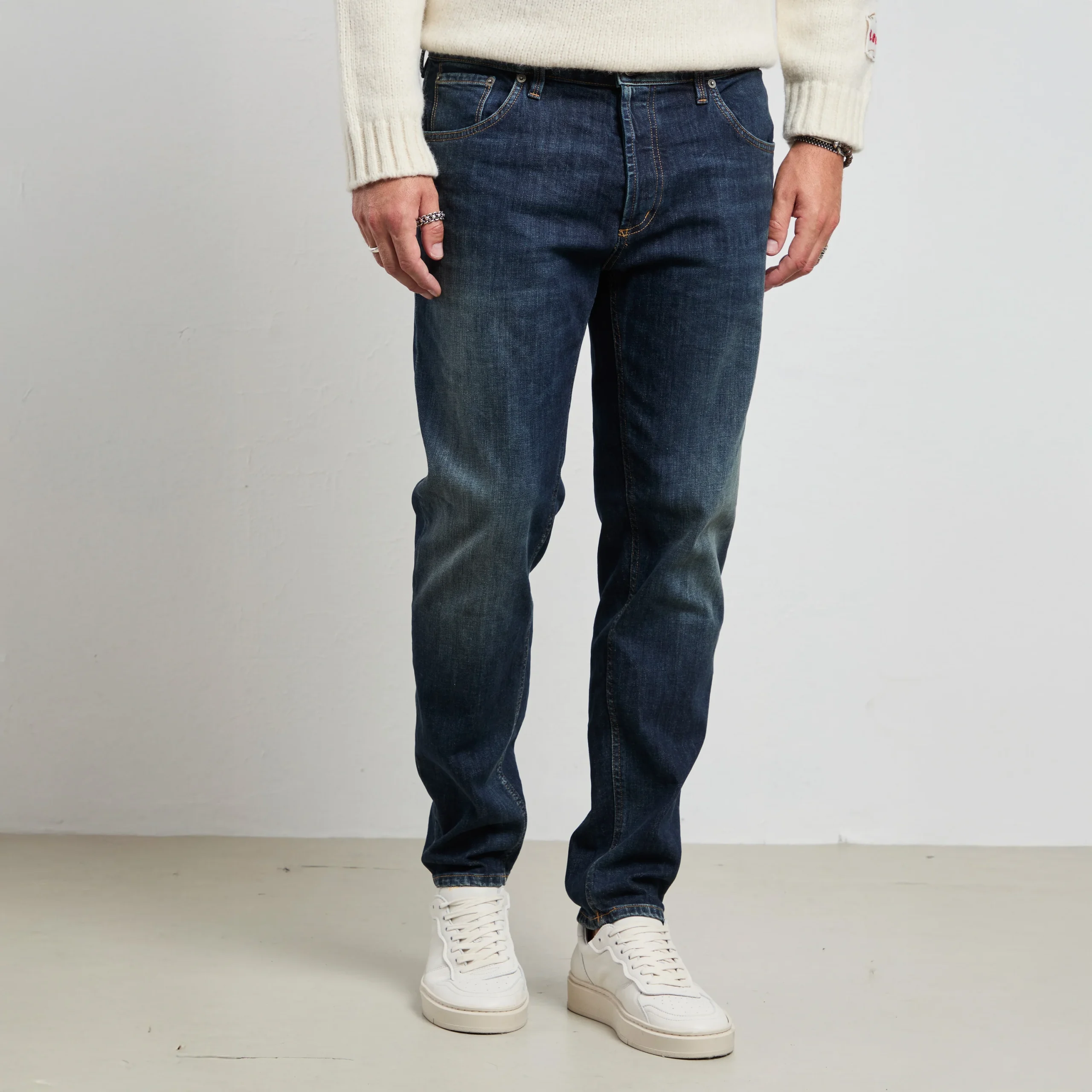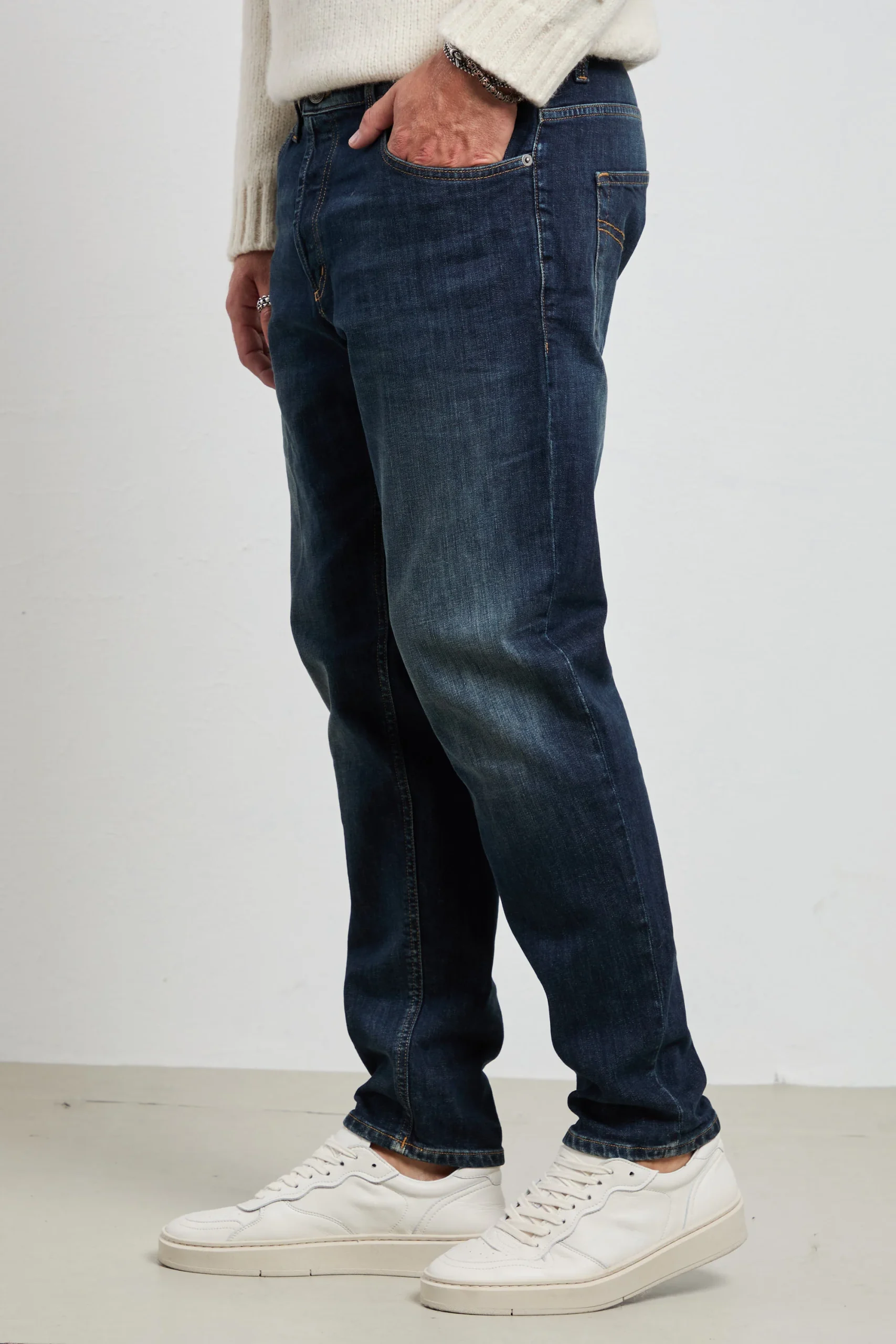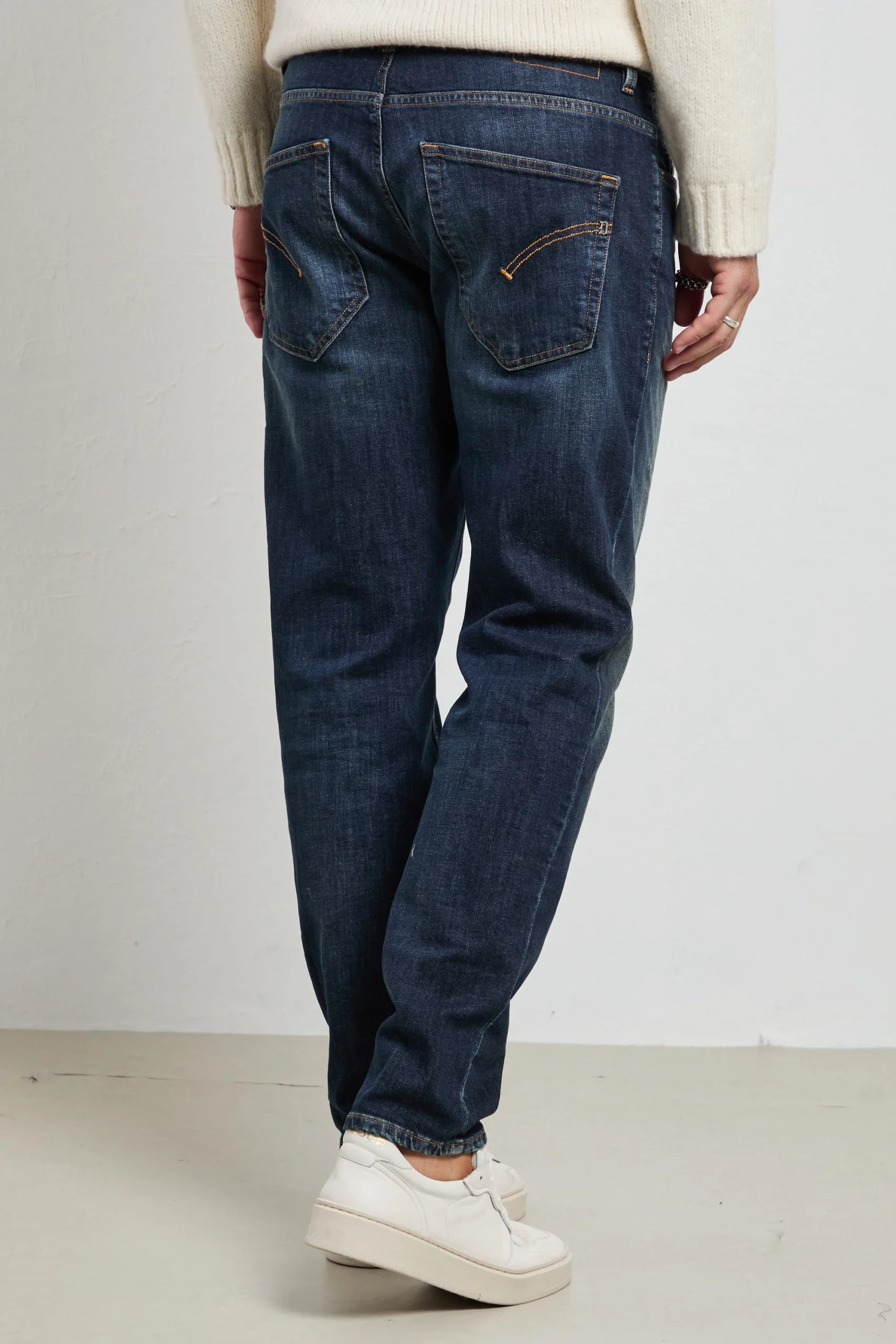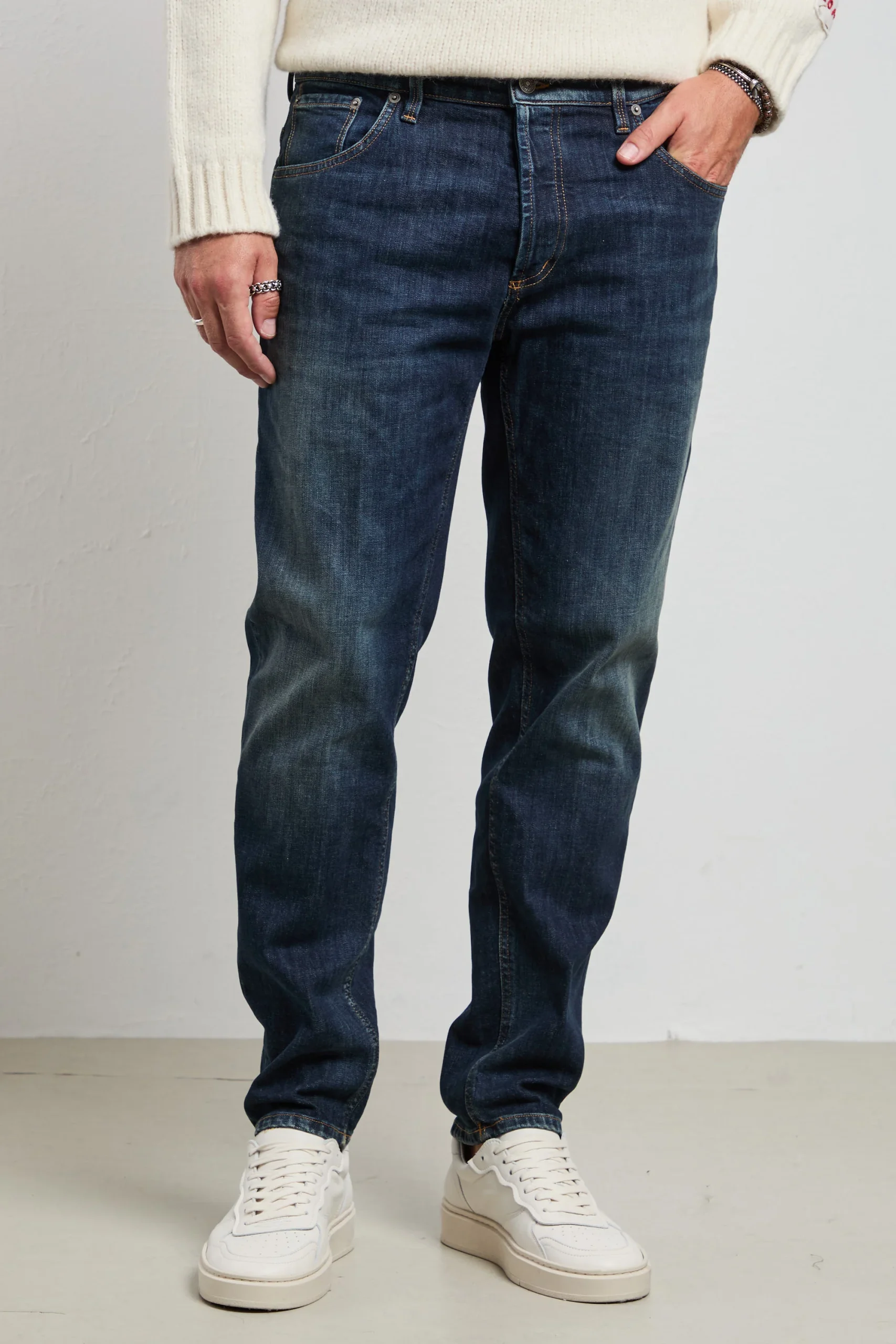 Il Dondup BRIGHTON è il jeans che parla di stile e savoir-faire: un carrot-fit che scolpisce la gamba senza costringere, perfetto per chi vuole un denim distintivo ma portabile ogni giorno. Il lavaggio blu scuro con finitura pulita lo rende ideale dal mattino alla sera, combinando comfort e carattere Made in Italy.