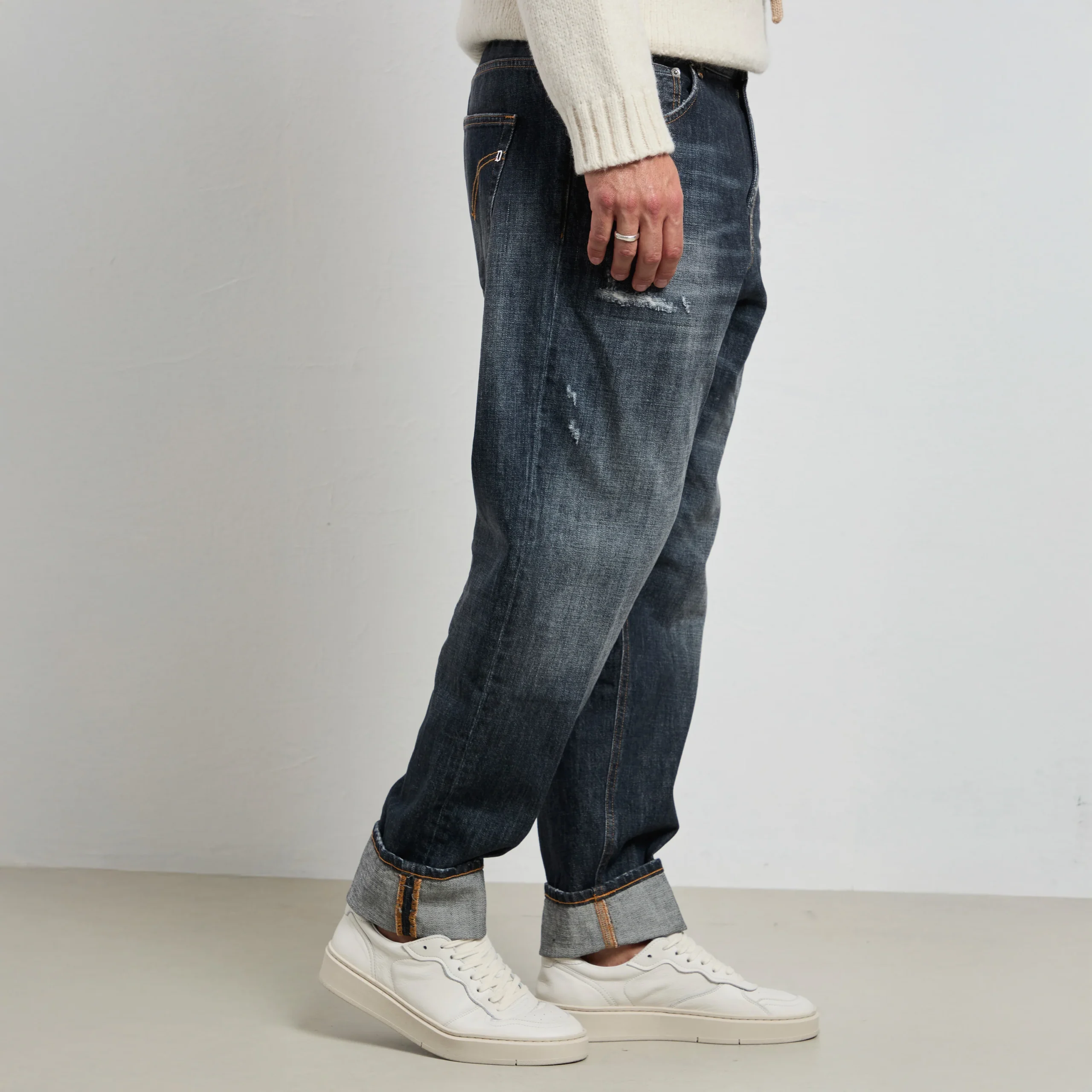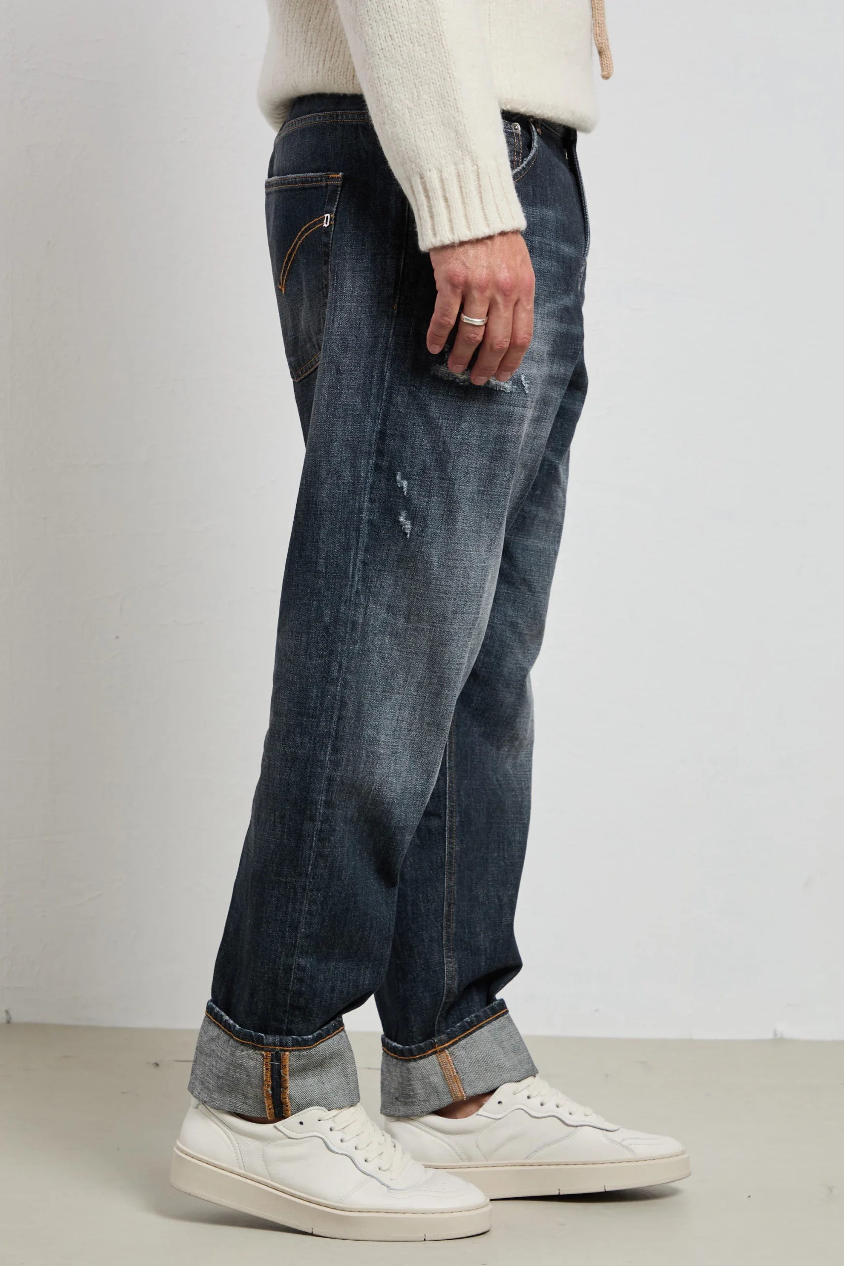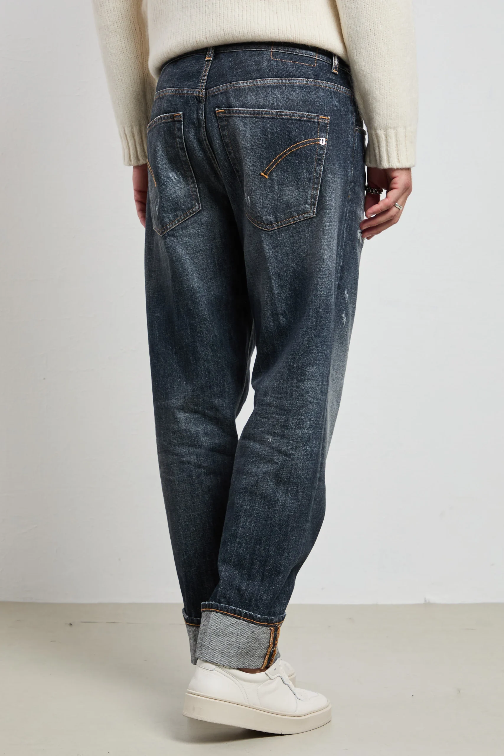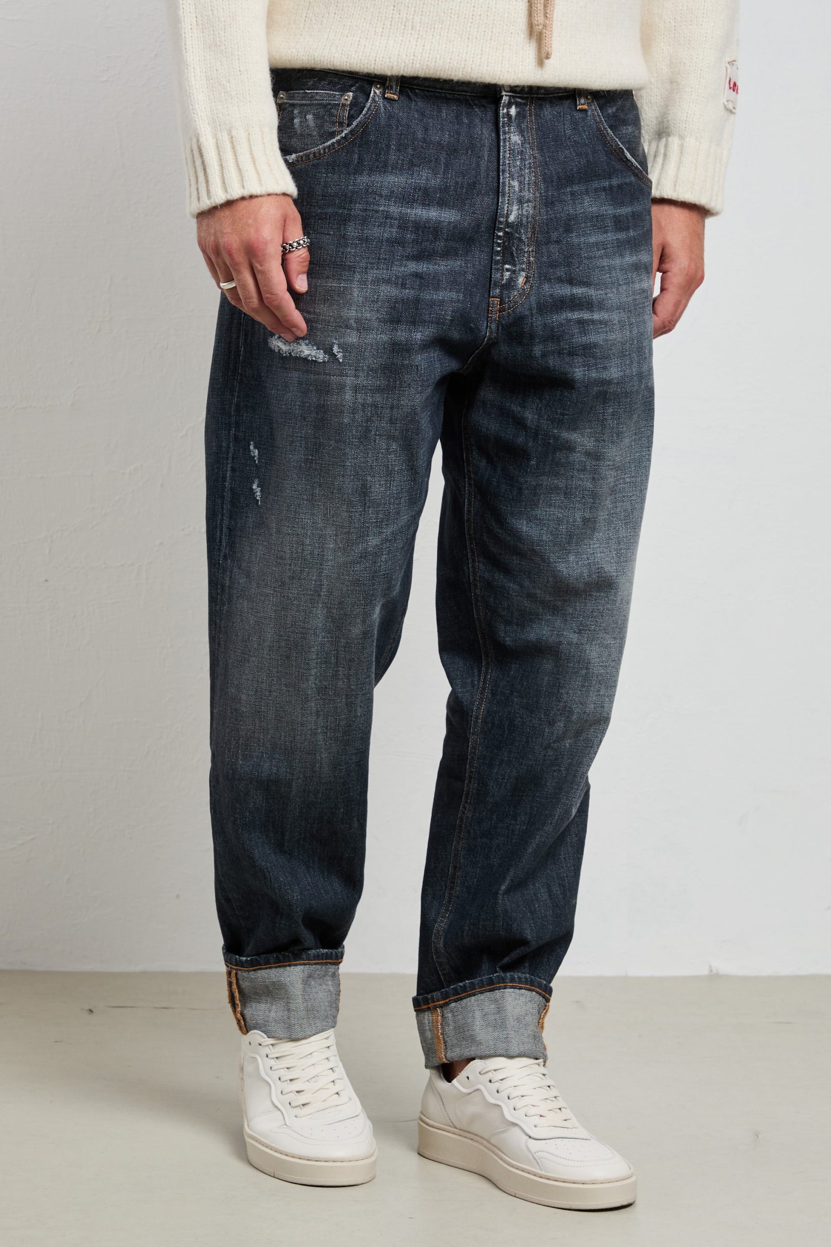 Un jeans dal carattere contemporaneo: il Dondup Paco si distingue per la vestibilità ampia e il lavaggio used blu scuro con dettagli vissuti. Realizzato in denim comfort da 12 oz, unisce stile e praticità, con un look dal sapore urbano ma sempre fedele all’eleganza del brand. Un capo autentico, con tutta la qualità italiana.