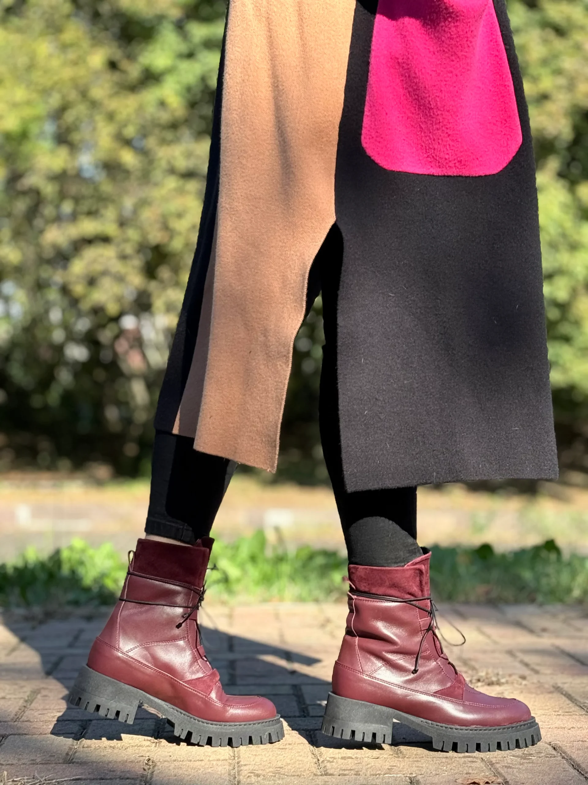 La pelle bordeaux avvolge una forma equilibrata e decisa, esaltata dal dettaglio ribelle del collo con linguettone oversize e dal piccolo passalacci in camoscio in tinta: un tocco di contrasto che spacca, senza togliere nulla alla sua versatilità .