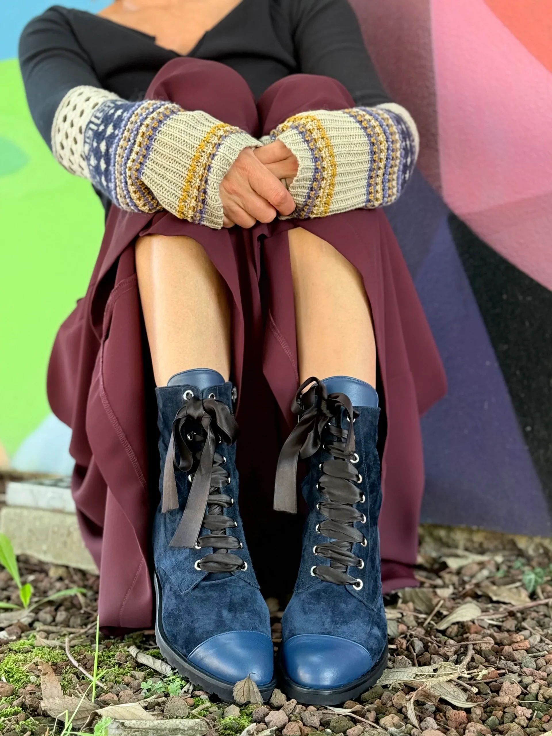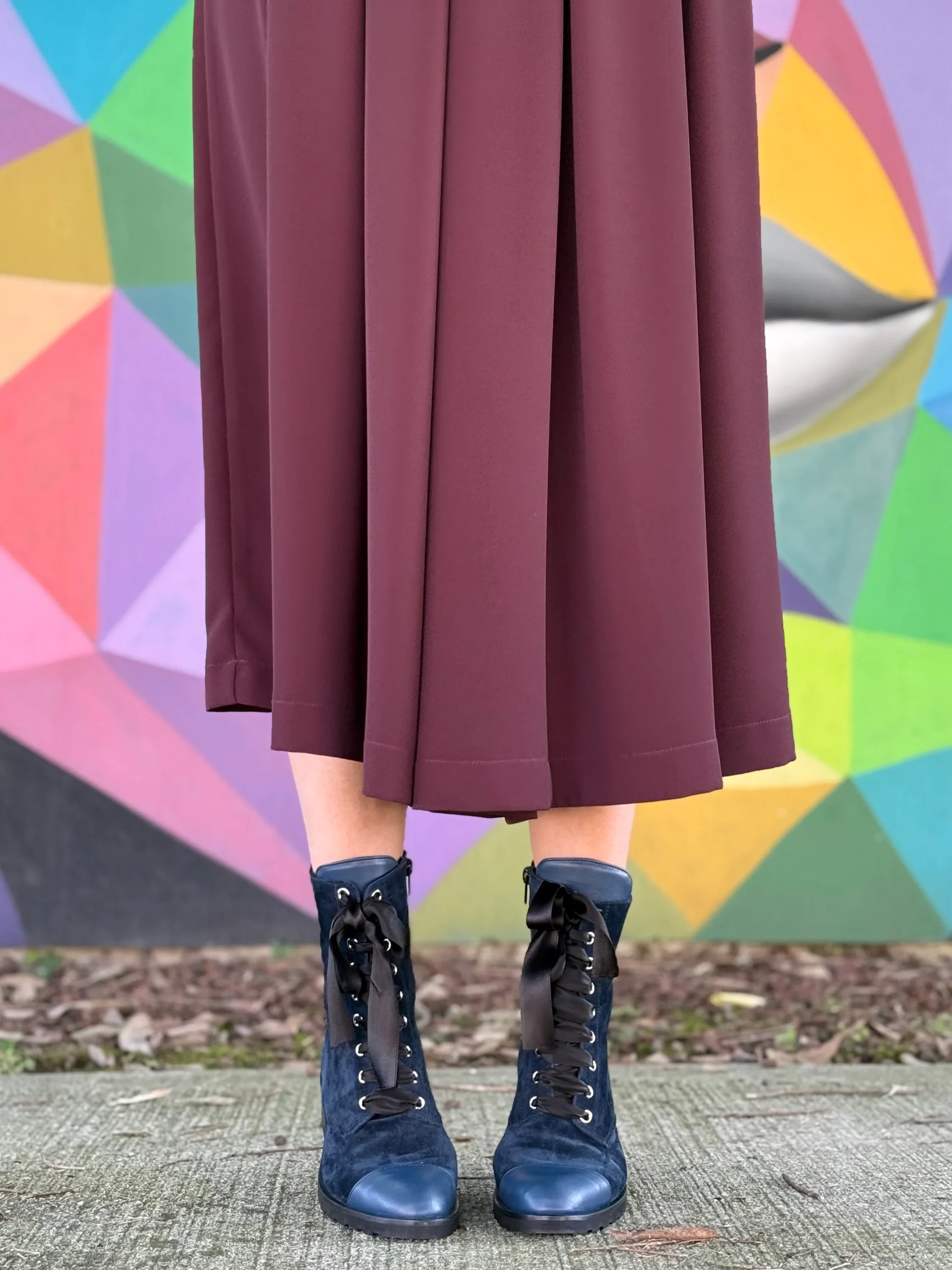Partiamo dalla forma gentile e raffinata con puntalino in nappa blu in tinta con la tomaia in camoscio accompagnato dal laccio in raso nero.