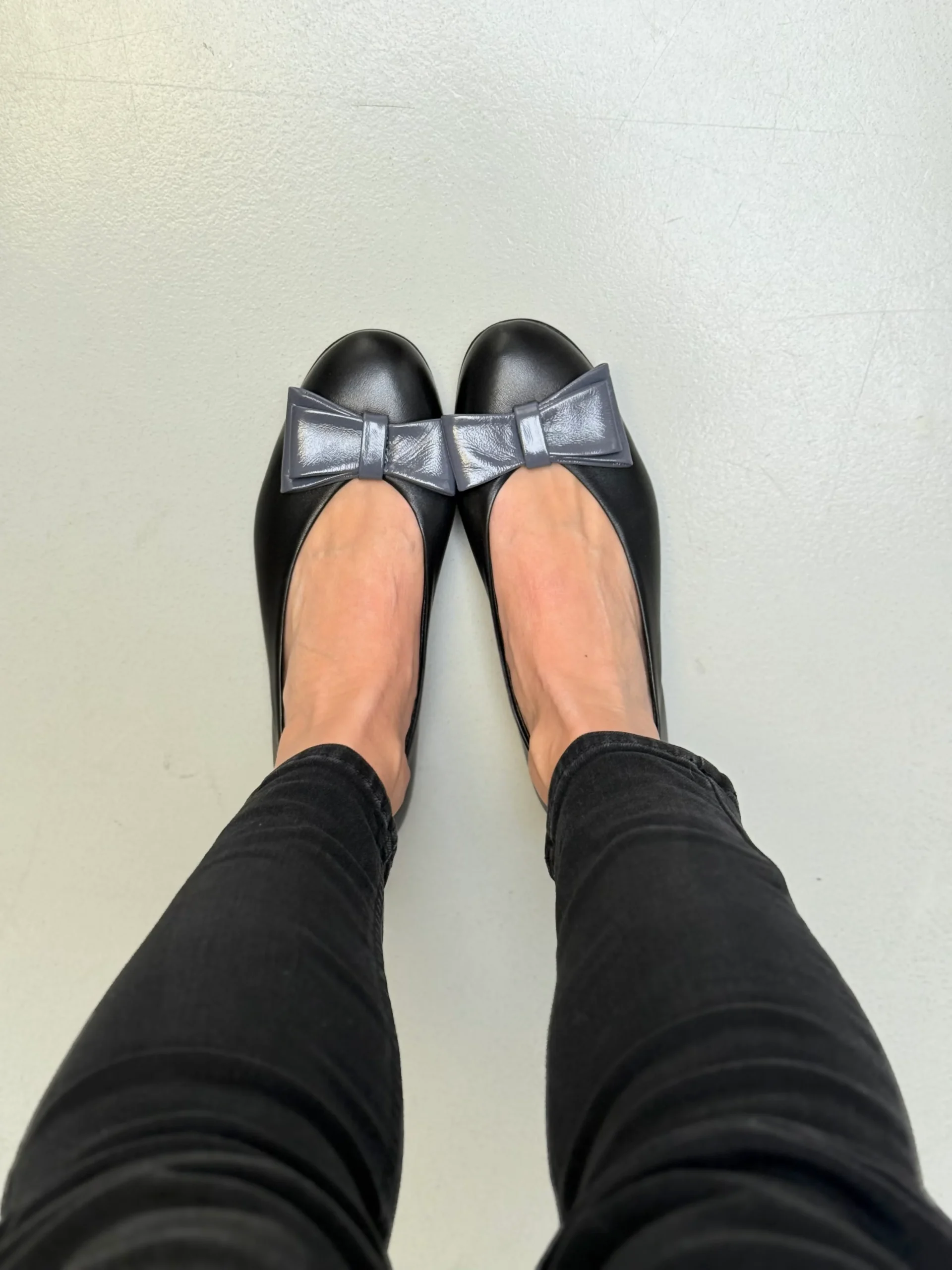 Il suo intenso colore nero aggiunge carattere e freschezza a qualsiasi outfit, mentre il fiocco grigio realizzato in morbidissima vernice su base camoscio sulla parte anteriore dona un dettaglio raffinato e femminile.