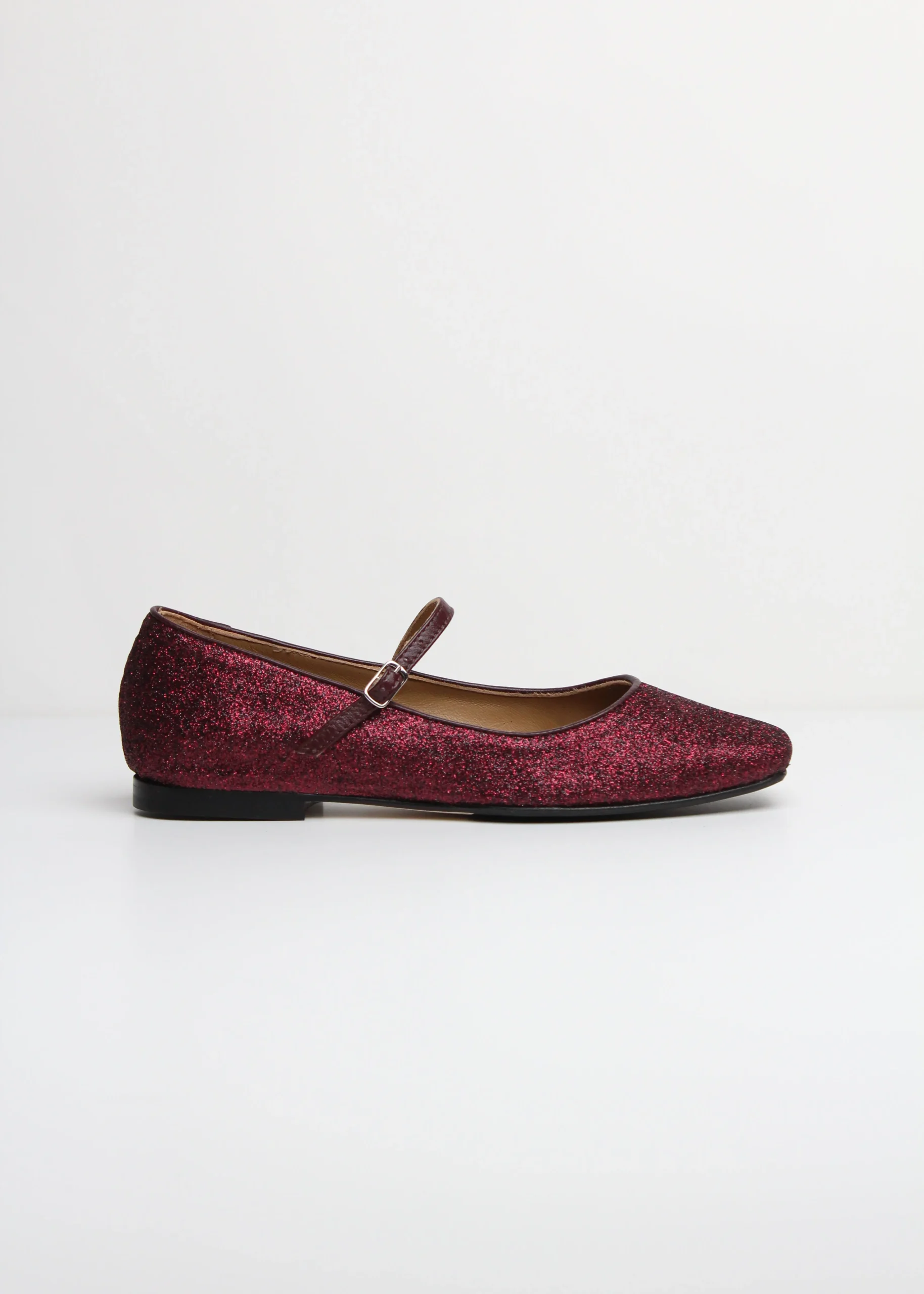 Questa Mary Jane in glitter colore bordeaux si distingue per la moderna punta quadrata e il tacco basso da 1 cm, ideali per garantire comfort senza rinunciare a un tocco di femminilità .