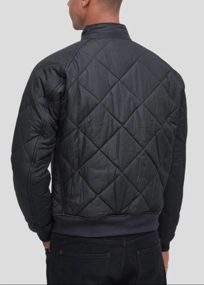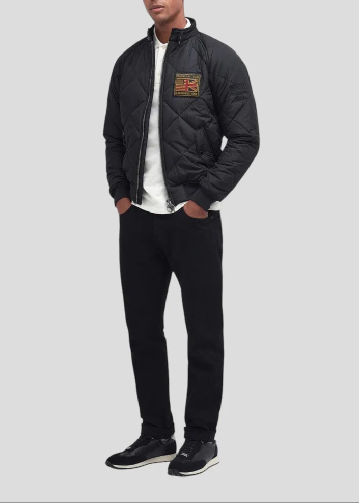 Una rivisitazione aggiornata del classico bomber, la giacca trapuntata di Barbour International è impreziosita da un collo alto con bottoni a pressione per un tocco di stile. Con una zip frontale a due vie e due tasche inferiori a filetto per una maggiore funzionalità . L’orlo e i polsini a costine conferiscono alla giacca una nota di ispirazione biker. La giacca è rifinita con una toppa ricamata Barbour International Steve McQueen sul petto a sinistra.
