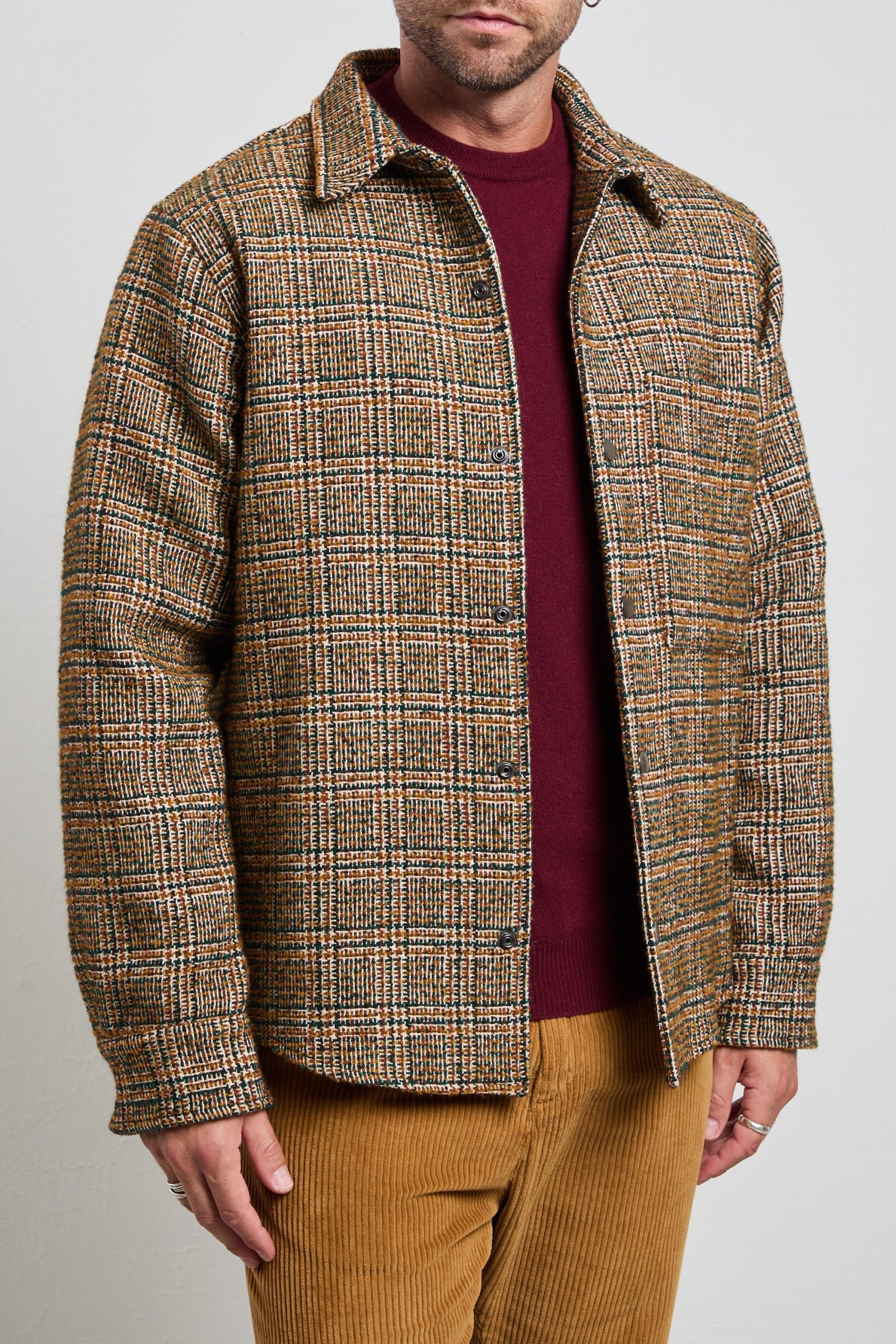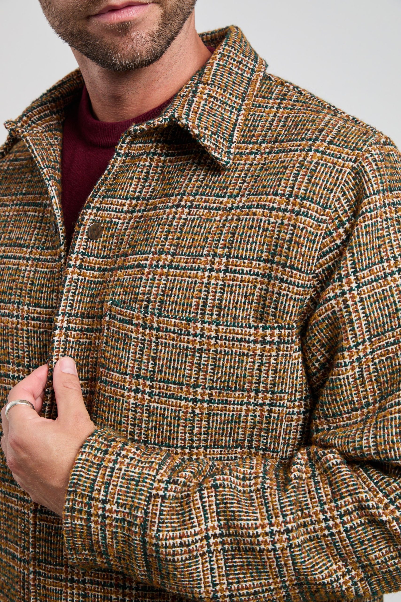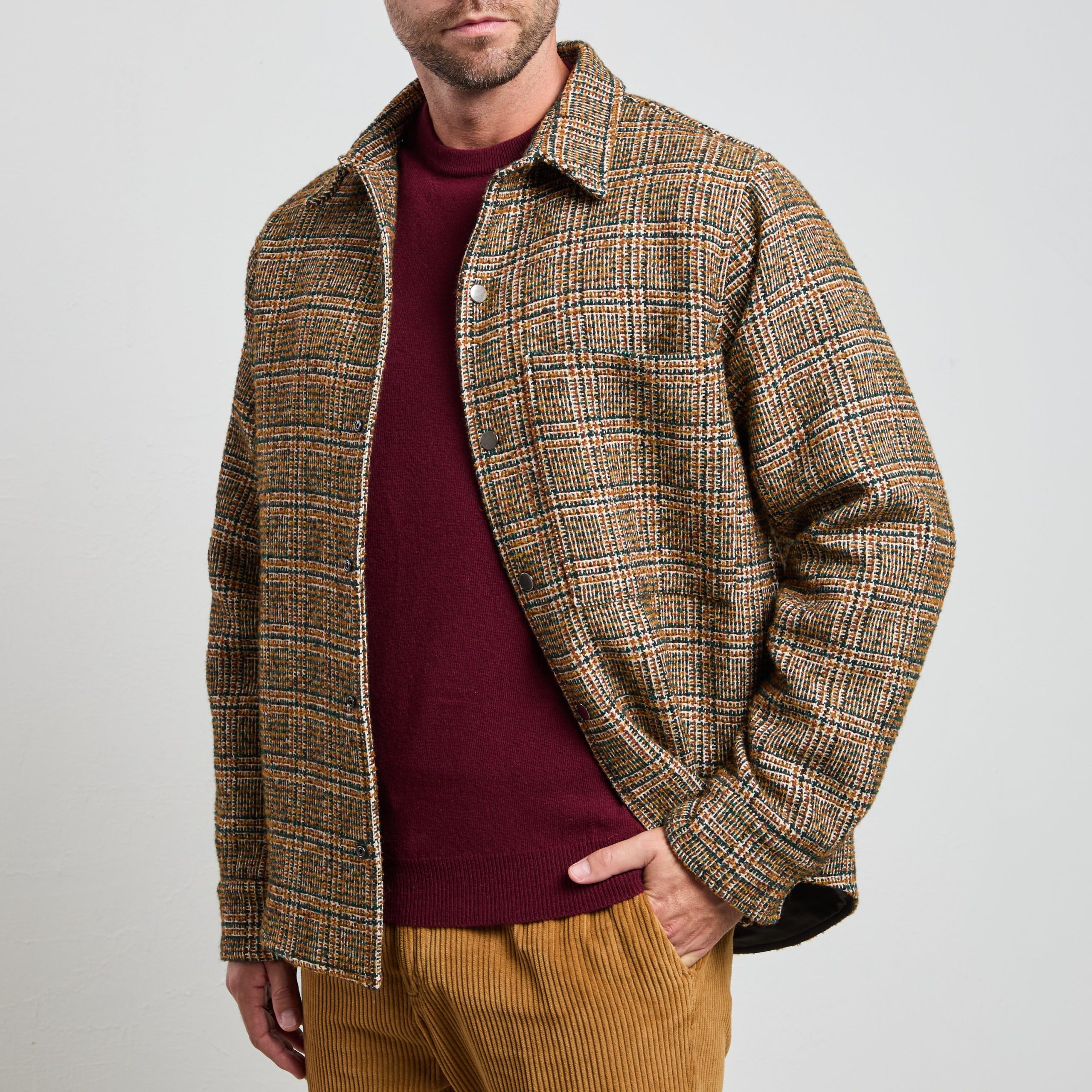 Questa field jacket è l’alleato perfetto per un look autunnale o invernale che non passa inosservato. La trama a quadri, dai toni caldi e naturali, rende questo capo versatile e ideale per abbinamenti casual o smart-casual. Perfetta sopra un maglione color bordeaux o una camicia in denim, questa giacca offre comfort e stile con un tocco di originalità .