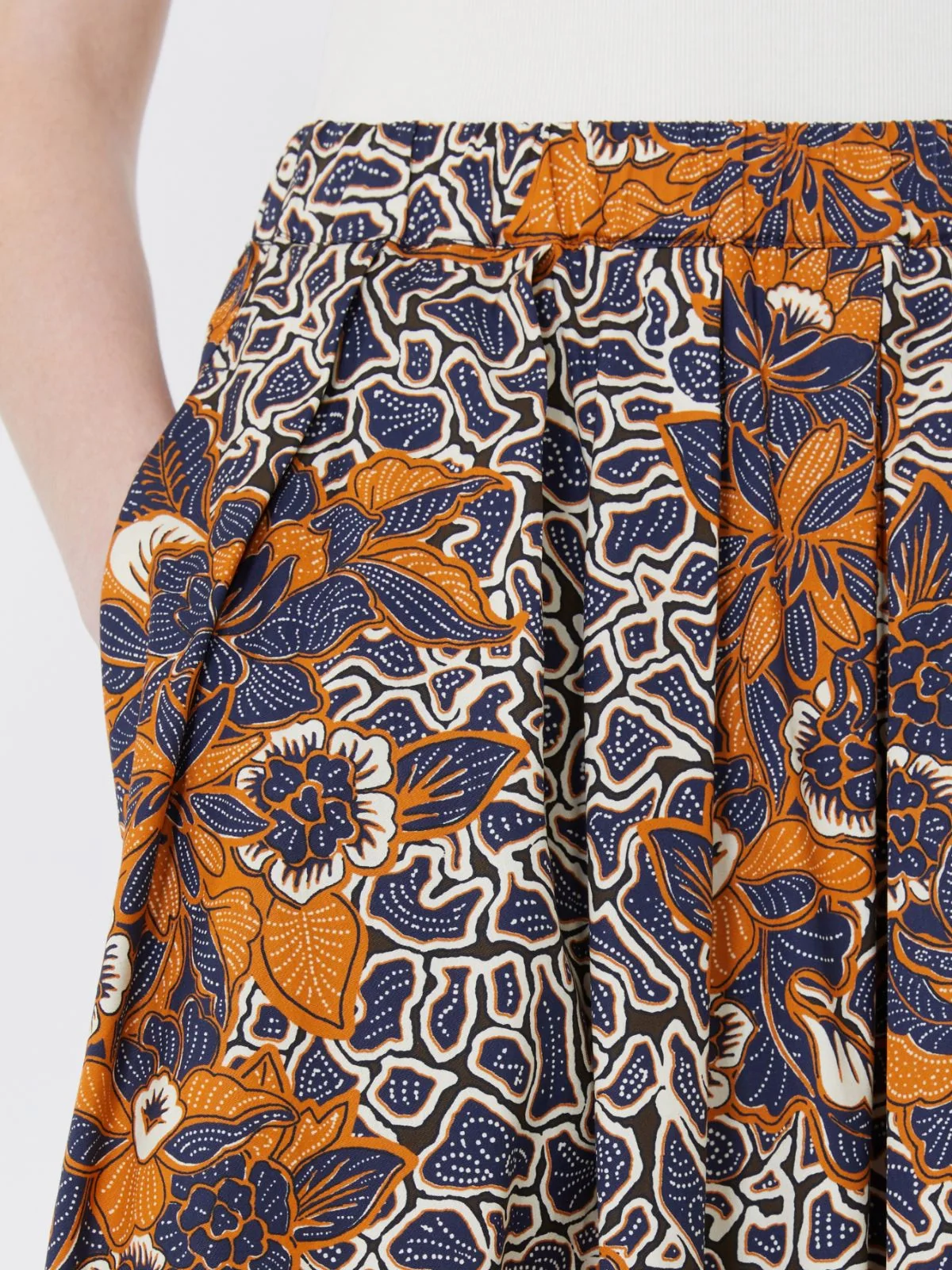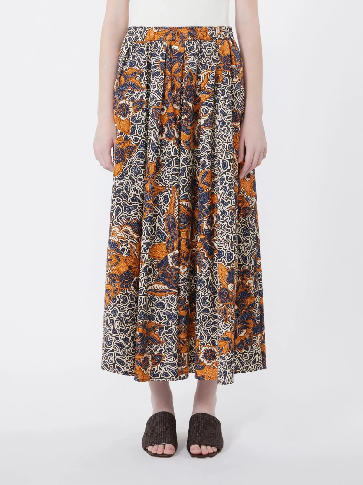Gonna lunga dalla linea ampia con motivo a pieghe che dona volume e movimento al capo.