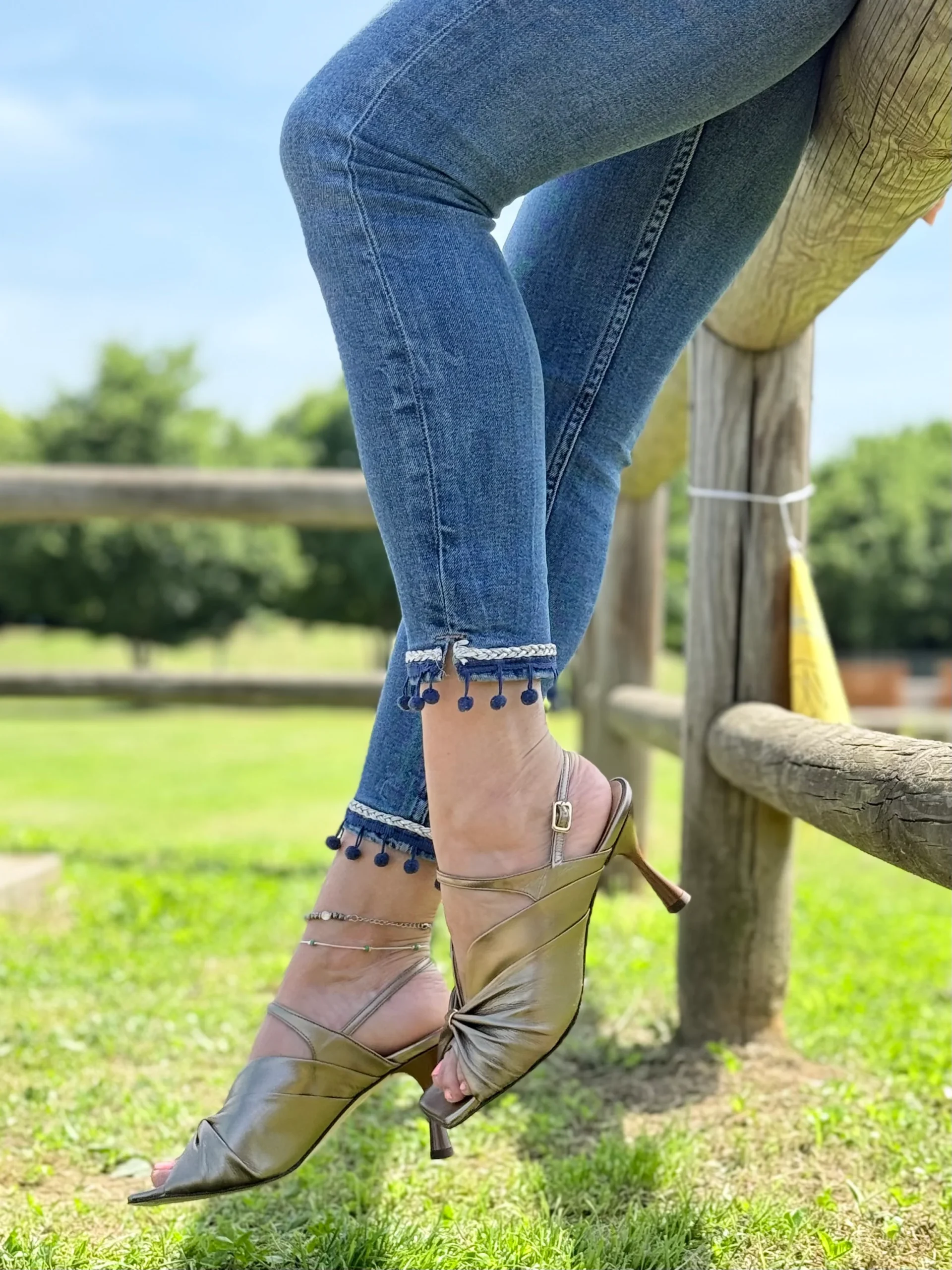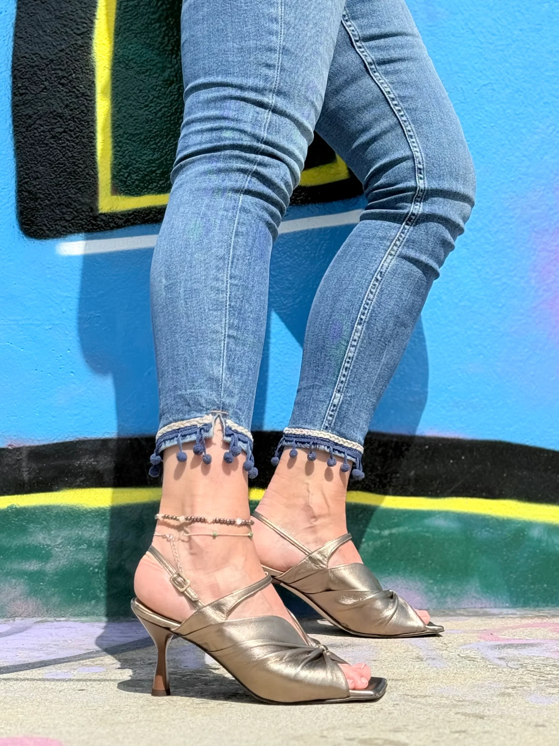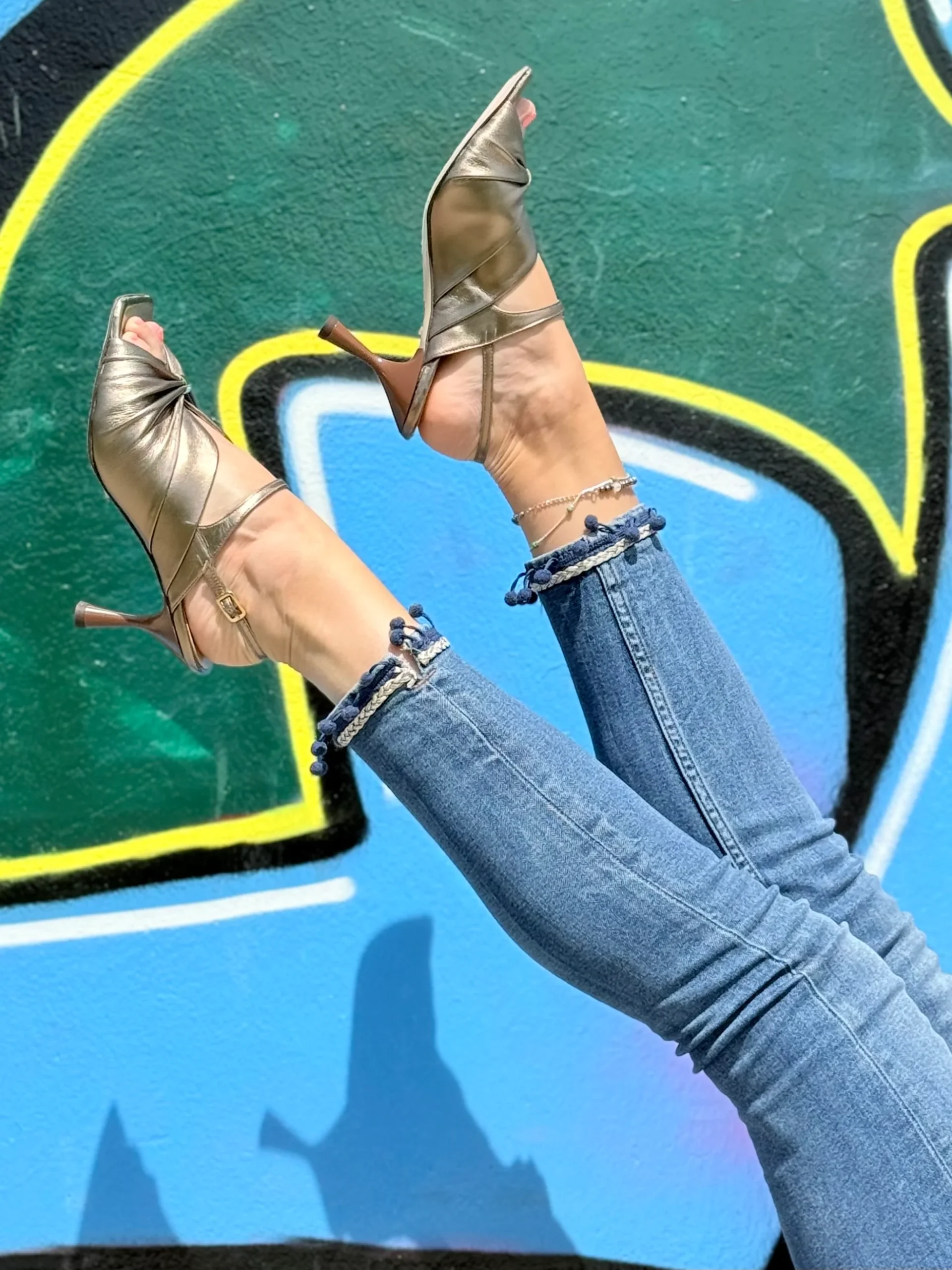 Un sandalo dal fascino delicato, in nappa laminata bronzo, con punta squadrata e tacco slanciato da 8 cm che valorizza la silhouette senza rinunciare al comfort.