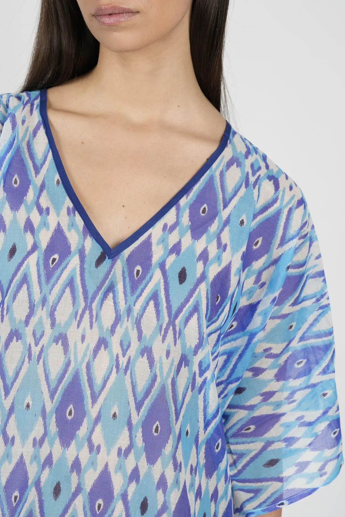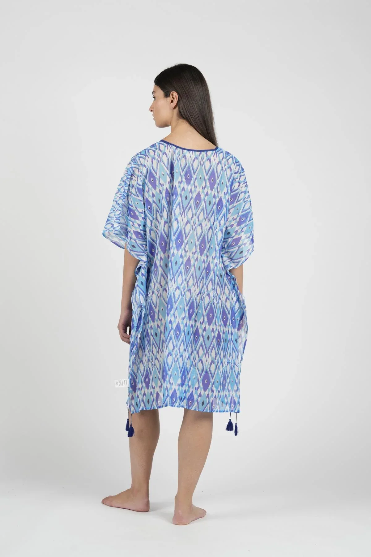 Un kaftano arioso e confortevole con una stampa che richiama le sfumature di Santorini. Perfetto per aggiungere un tocco di eleganza alle giornate estive.
