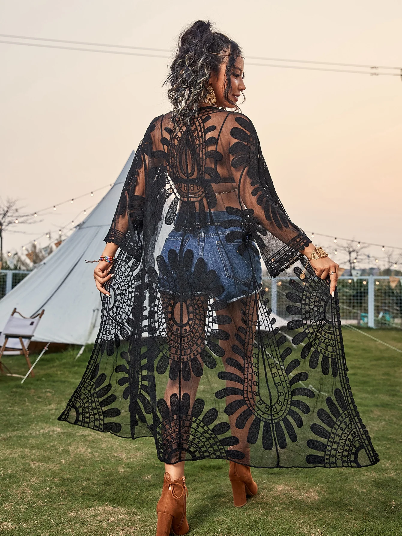 Leggero come una brezza estiva, questo lungo kimono lungo in tulle ricamato è l’alleato perfetto per le vacanze e i momenti di relax in riva al mare.