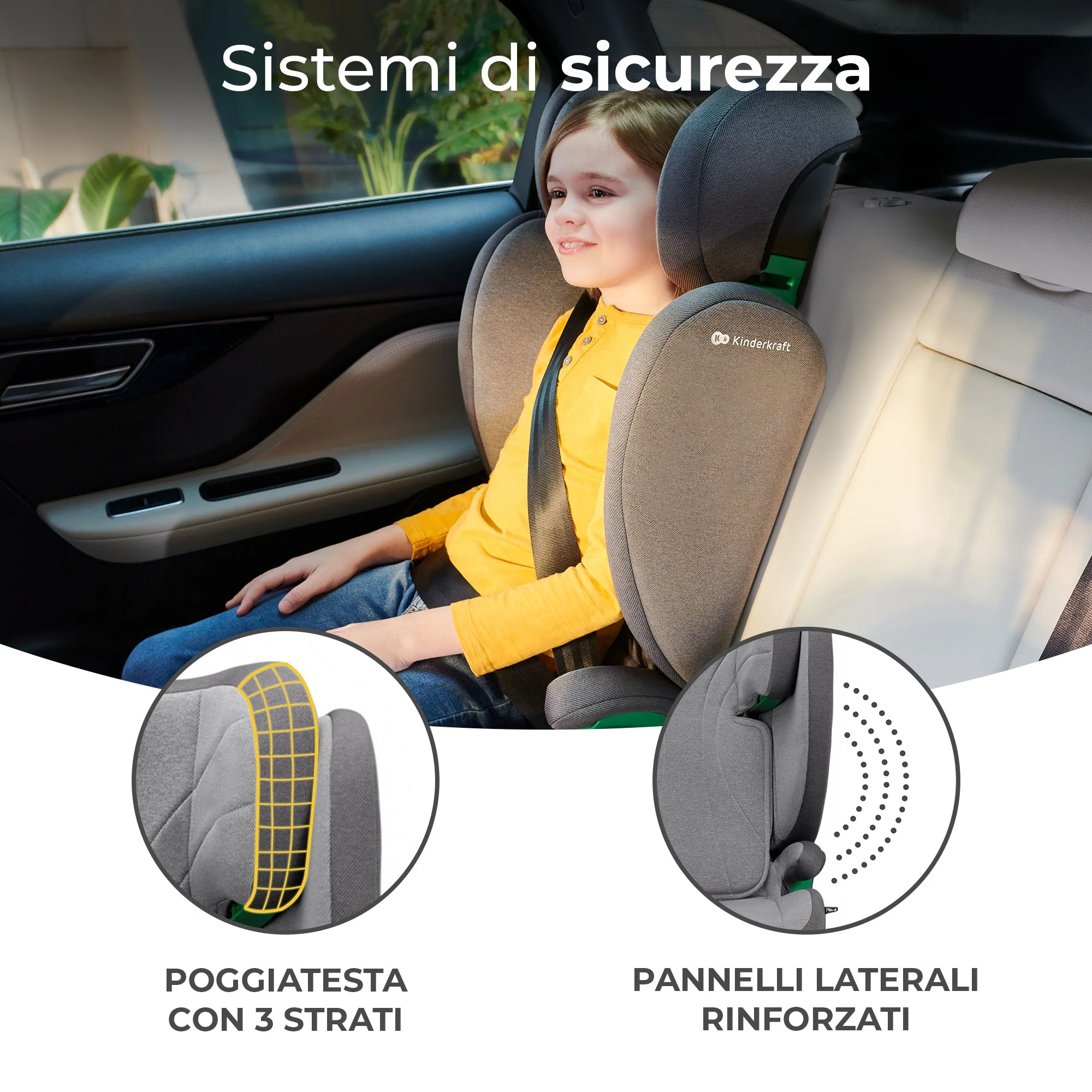 Le protezioni laterali rinforzate proteggono efficacemente il bambino in caso di urto. Grazie alla loro struttura, assorbono l’energia generata durante un impatto laterale, proteggendo così le spalle e la colonna vertebrale del bambino.