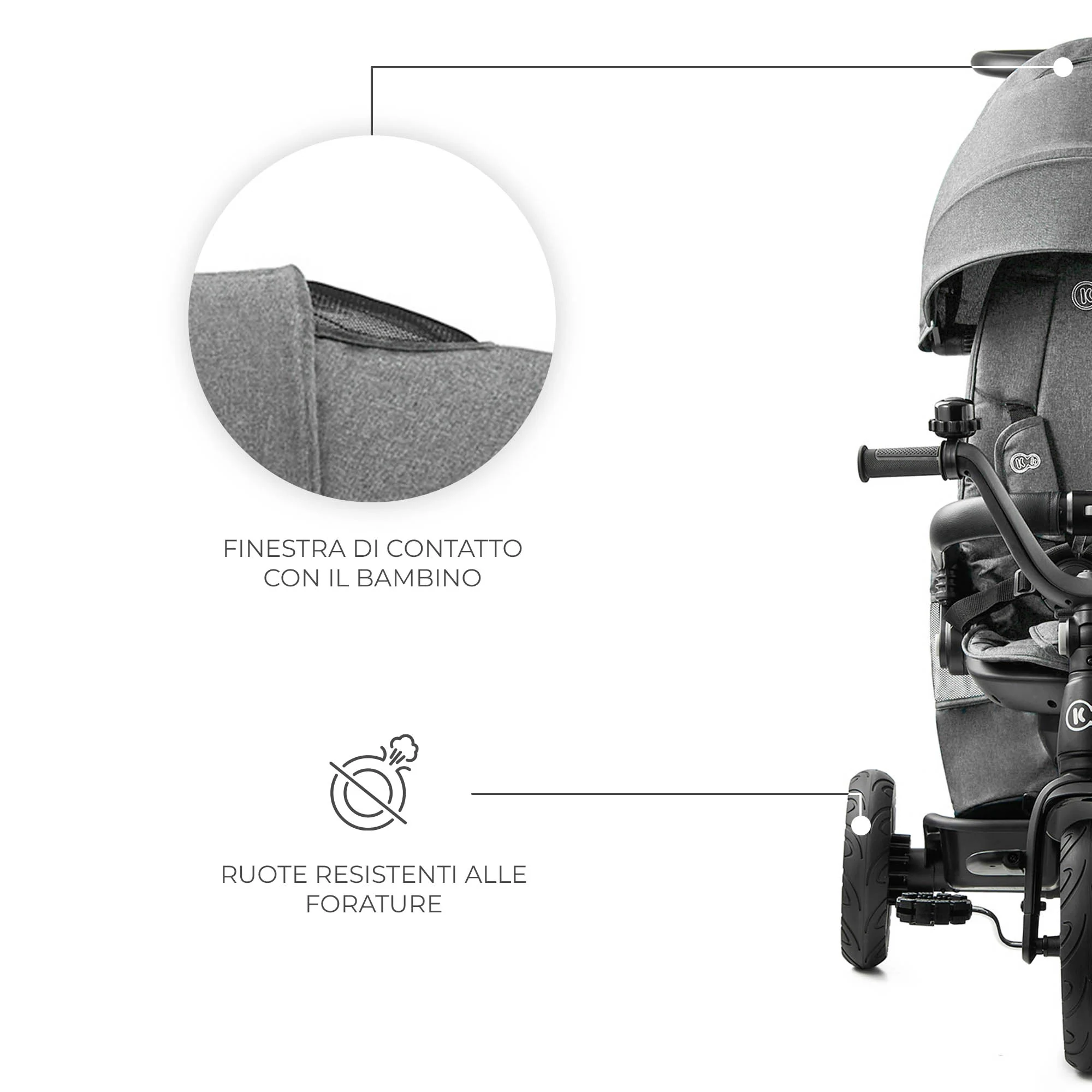 • Triciclo evolutivo, che cresce con il bambino – la struttura modulare permette 5 diverse configurazioni per adattarsi all’età e alle esigenze del piccolo.