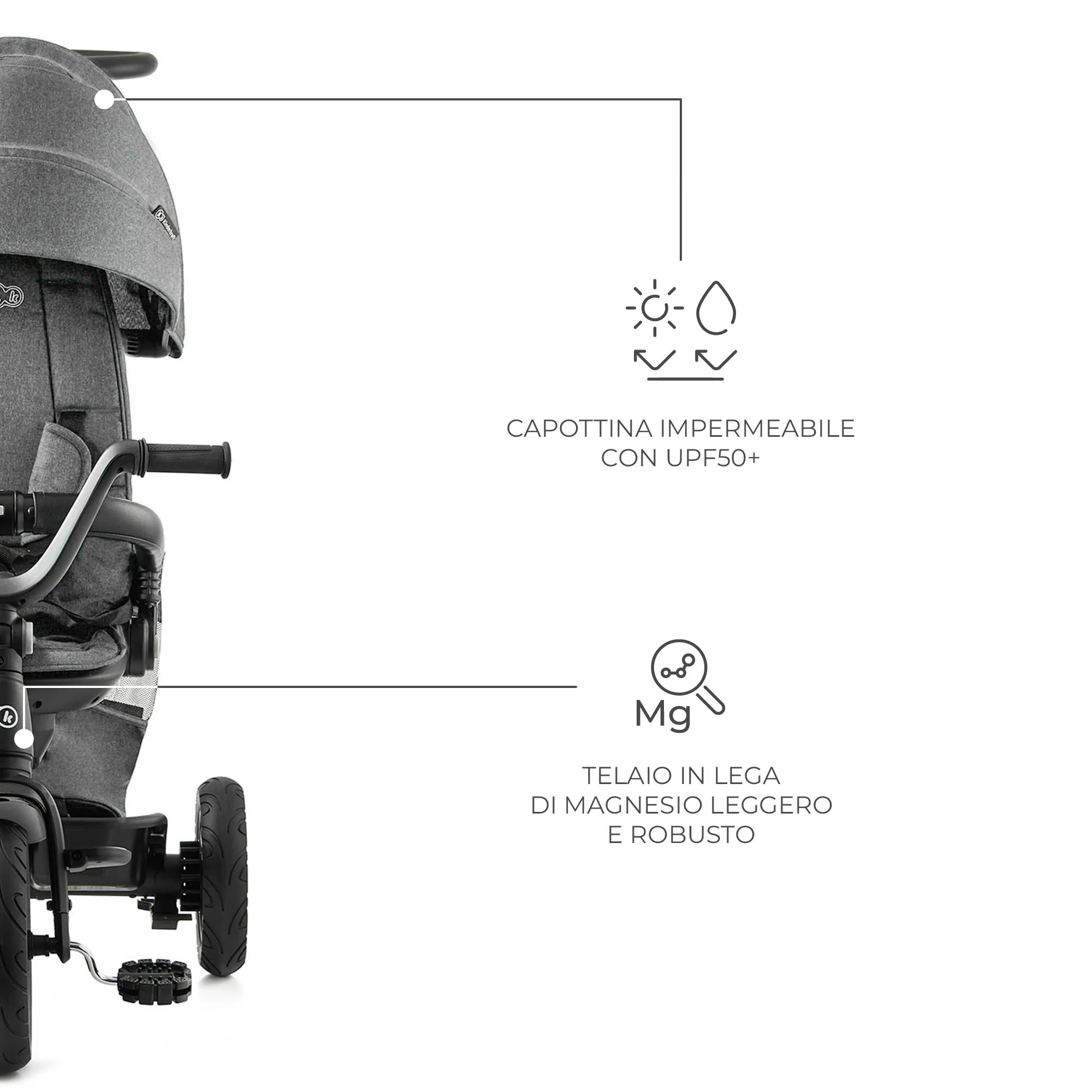 • Capottina estensibile, impermeabile e dotata di filtro UPF 50+, che protegge il bambino dal sole e dal vento.